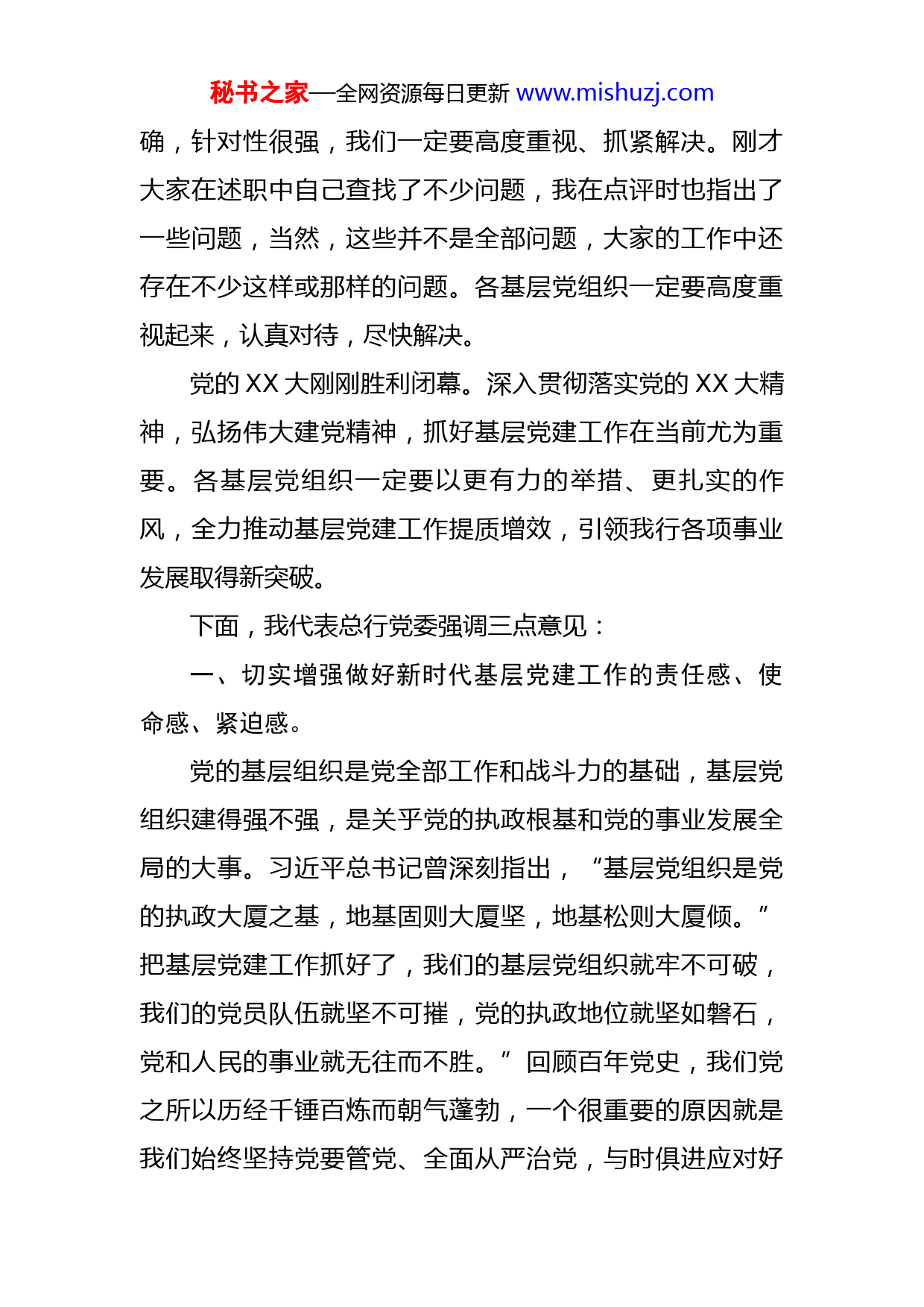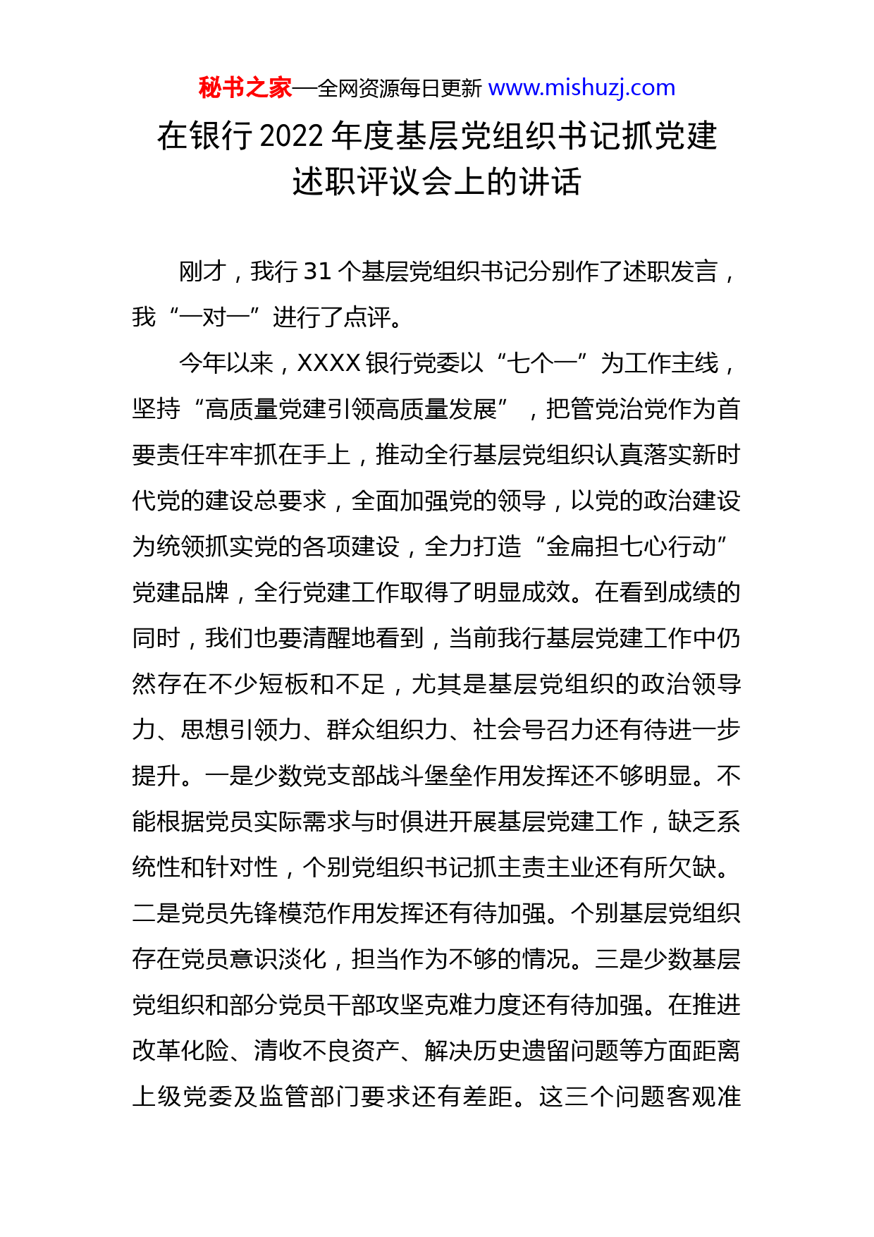 秘书之家—全网资源每日更新www.mishuzj.com在银行2022年度基层党组织书记抓党建述职评议会上的讲话刚才,我行31个基层党组织书记分别作了述职发言,我“一对一”进行了点评。今年以来,XXXX银行党委以“七个一”为工作主线,坚持“高质量党建引领高质量发展”,把管党治党作为首要责任牢牢抓在手上,推动全行基层党组织认真落实新时代党的建设总要求,全面加强党的领导,以党的政治建设为统领抓实党的各项建设,全力打造“金扁担七心行动”党建品牌,全行党建工作取得了明显成效。在看到成绩的同时,我们也要清醒地看到,当前我行基层党建工作中仍然存在不少短板和不足,尤其是基层党组织的政治领导力、思想引领力、群众组织力、社会号召力还有待进一步提升。一是少数党支部战斗堡垒作用发挥还不够明显。不能根据党员实际需求与时俱进开展基层党建工作,缺乏系统性和针对性,个别党组织书记抓主责主业还有所欠缺。二是党员先锋模范作用发挥还有待加强。个别基层党组织存在党员意识淡化,担当作为不够的情况。三是少数基层党组织和部分党员干部攻坚克难力度还有待加强。在推进改革化险、清收不良资产、解决历史遗留问题等方面距离上级党委及监管部门要求还有差距。这三个问题客观准秘书之家—全网资源每日更新www.mishuzj.com确,针对性很强,我们一定要高度重视、抓紧解决。刚才大家在述职中自己查找了不少问题,我在点评时也指出了一些问题,当然,这些并不是全部问题,大家的工作中还存在不少这样或那样的问题。各基层党组织一定要高度重视起来,认真对待,尽快解决。党的XX大刚刚胜利闭幕。深入贯彻落实党的XX大精神,弘扬伟大建党精神,抓好基层党建工作在当前尤为重要。各基层党组织一定要以更有力的举措、更扎实的作风,全力推动基层党建工作提质增效,引领我行各项事业发展取得新突破。下面,我代表总行党委强调三点意见:一、切实增强做好新时代基层党建工作的责任感、使命感、紧迫感。党的基层组织是党全部工作和战斗力的基础,基层党组织建得强不强,是关乎党的执政根基和党的事业发展全局的大事。习近平总书记曾深刻指出,“基层党组织是党的执政大厦之基,地基固则大厦坚,地基松则大厦倾。”把基层党建工作抓好了,我们的基层党组织就牢不可破,我们的党员队伍就坚不可摧,党的执政地位就坚如磐石,党和人民的事业就无往而不胜。”回顾百年党史,我们党之所以历经千锤百炼而朝气蓬勃,一个很重要的原因就是我们始终坚持党要管党、全面从严治党,与时俱进应对好秘书之家—全网资源每日更新www.mishuzj.com自身在各个历史时期面临的风险挑战,确保我们党在世界形势深刻变化的历史进程中始终走在时代前列。新征程,我们在前进道路上仍然面临许多这样那样的风险挑战,只有把党的基层组织建设得生机蓬勃、坚强有力,才能在各种严峻复杂形势面前经受住各种考验。我们一定要站在讲政治、顾全局、谋发展的高度,深刻认识到做好基层党建工作的极端重要性,努力把基层党组织建设成为宣传党的主张、贯彻党的决定、领导基层治理、团结动员群众、推动改革发展的坚强战斗堡垒,切实担负起教育、管理、监督党员的职责,把广大党员、员工有效组织起来,形成奋进新征程、建功新时代的强大合力。二、全力推动基层党组织全面进步、全面规范、全面过硬一要强化政治建设。基层党组织强不强,最重要、最根本的一条就是政治功能强不强。现在有些基层党组织在实际工作中领不了方向、统不了全局、聚不起员工,党的领导在基层不同程度出现了虚化、弱化,说到底就是基层党组织在政治建设上出现了问题。各基层党组织一定要增强全面从严治党首先要从政治上看的意识,要把加强政治建设作为首要任务,着力增强基层党组织的政治功能。要引领广大党员、员工深刻认识“两个确立”的决定性意义,增强“四个意识”、坚定“四个自信”、做到“两个秘书之家—全网资源每日更新www.mishuzj.com维护”,始终在思想上政治上行动上同以习近平同志为核心的党中央保持高度一致。要把党的政治领导、思想领导、组织领导落实到一切工作中去,引领党员自觉贯彻党的主张,真正形成上下贯通、执行有力的严密组织体系。要不折不扣贯彻落实习近平总书记重要讲话重要指示批示精神,做到党中央提倡的坚决响应,党中央决定的坚决照办。二要强化思想建设。注重思想建党、理论强党,是我们党的鲜明特色和光荣传统,是我们党能够历经艰难困苦而不断发展壮大的重要原因。要把学习贯彻习近平新时代中国特色社会主义思想和总书记对内蒙古和金融工作的重要讲话重要指示批示精神作为长期重大政治任务,引导广大党员、员工真正学懂弄通、学深悟透、入脑入心、见行见效。要深入学习宣传贯彻党的XX大精神,常态化、长效化抓好党史学习教育,教育广大党员、员工坚定历史自信、筑牢历史记忆,满怀信心向前进。要高度重视、下大力气做好面向广大客户的业务宣传和暖心服务,切实把广大客户紧紧团结在我们的周围。三要强化组织建设。要完整、准确、全面贯彻落实党中央全面从严治党决策部署和自治区联社党委有关工作要求,牢记农信初心使命,立足XXXX银行实际落细落实见效。要系统化做实基层党