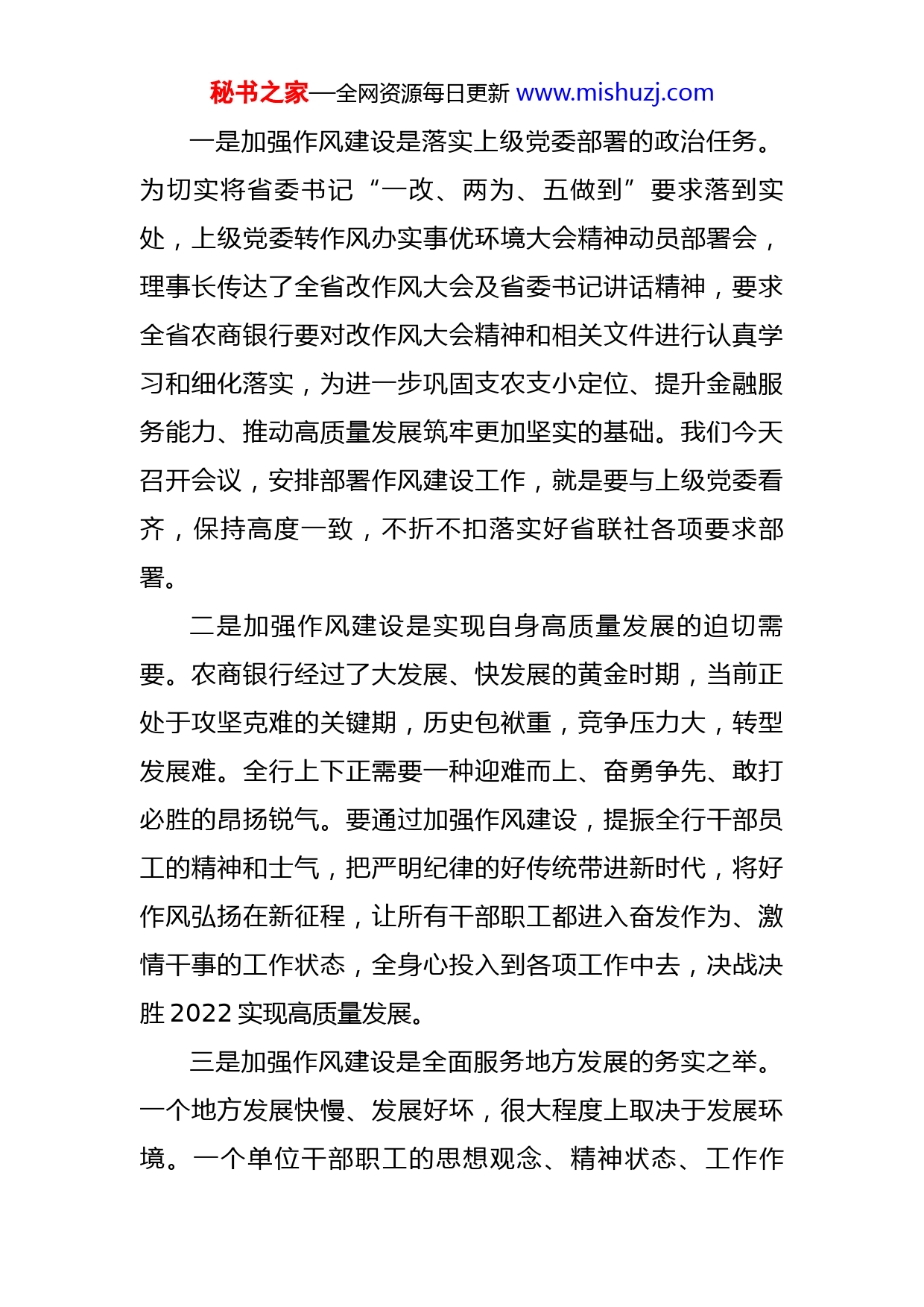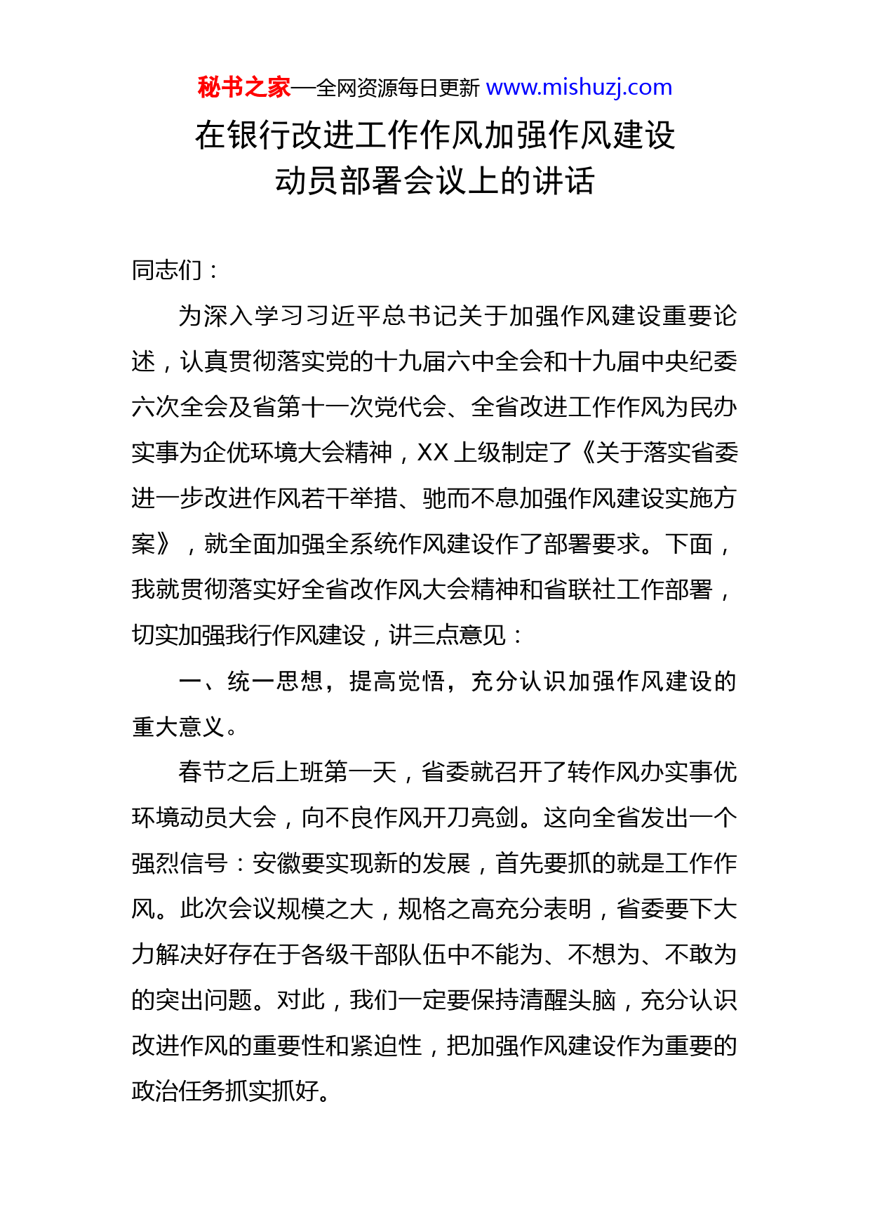 秘书之家—全网资源每日更新www.mishuzj.com在银行改进工作作风加强作风建设动员部署会议上的讲话同志们:为深入学习习近平总书记关于加强作风建设重要论述,认真贯彻落实党的十九届六中全会和十九届中央纪委六次全会及省第十一次党代会、全省改进工作作风为民办实事为企优环境大会精神,XX上级制定了《关于落实省委进一步改进作风若干举措、驰而不息加强作风建设实施方案》,就全面加强全系统作风建设作了部署要求。下面,我就贯彻落实好全省改作风大会精神和省联社工作部署,切实加强我行作风建设,讲三点意见:一、统一思想,提高觉悟,充分认识加强作风建设的重大意义。春节之后上班第一天,省委就召开了转作风办实事优环境动员大会,向不良作风开刀亮剑。这向全省发出一个强烈信号:安徽要实现新的发展,首先要抓的就是工作作风。此次会议规模之大,规格之高充分表明,省委要下大力解决好存在于各级干部队伍中不能为、不想为、不敢为的突出问题。对此,我们一定要保持清醒头脑,充分认识改进作风的重要性和紧迫性,把加强作风建设作为重要的政治任务抓实抓好。秘书之家—全网资源每日更新www.mishuzj.com一是加强作风建设是落实上级党委部署的政治任务。为切实将省委书记“一改、两为、五做到”要求落到实处,上级党委转作风办实事优环境大会精神动员部署会,理事长传达了全省改作风大会及省委书记讲话精神,要求全省农商银行要对改作风大会精神和相关文件进行认真学习和细化落实,为进一步巩固支农支小定位、提升金融服务能力、推动高质量发展筑牢更加坚实的基础。我们今天召开会议,安排部署作风建设工作,就是要与上级党委看齐,保持高度一致,不折不扣落实好省联社各项要求部署。二是加强作风建设是实现自身高质量发展的迫切需要。农商银行经过了大发展、快发展的黄金时期,当前正处于攻坚克难的关键期,历史包袱重,竞争压力大,转型发展难。全行上下正需要一种迎难而上、奋勇争先、敢打必胜的昂扬锐气。要通过加强作风建设,提振全行干部员工的精神和士气,把严明纪律的好传统带进新时代,将好作风弘扬在新征程,让所有干部职工都进入奋发作为、激情干事的工作状态,全身心投入到各项工作中去,决战决胜2022实现高质量发展。三是加强作风建设是全面服务地方发展的务实之举。一个地方发展快慢、发展好坏,很大程度上取决于发展环境。一个单位干部职工的思想观念、精神状态、工作作秘书之家—全网资源每日更新www.mishuzj.com风,决定着这个单位的工作效率、工作水平和整体形象。农商银行作为地方金融的主力军,乡村振兴的主办行,服务网点最多,窗口最多,工作量最大,也是接受企业和群众评价最广泛的金融单位。如果我行的每一位工作人员都能够想客户之所想,急客户之所急,服务态度文明热情,业务办理快捷高效,客户满意度和获得感不断提升,那我们就为全县优化营商环境和实体经济发展增了光、添了彩。所以我们要进一步改进工作作风,强化服务意识,为地方发展建设创造一流的金融服务环境。二、抓住重点,横下决心,认真查改作风建设中存在的突出问题。近年来,我行围绕改进工作作风,提升服务水平,做了大量的工作,全行干部员思想作风、工作作风整体较好,受到了客户群众和社会各界的较好评价。但也要清醒地认识到,对标“六个不”,我行的作风建设也还存在一些比较突出的问题,一是政治意识不够强。有些党员同志政治敏锐性和洞察力不足,对一些重大决策部署思想不重视、态度不认真、执行不坚定,被动或不主动参与组织生活和学习,八小时外的全部时间都放在娱乐消遣上。二是工作上缺乏进取精神,缺乏“慢进是退、不进更是退”的危机感,争先创优的浓厚氛围不浓,队伍干事创业动力活力不足。三是工作中缺乏坚决有效的执行力,一些工作标秘书之家—全网资源每日更新www.mishuzj.com准不高,推进不力,抓得不紧,影响落实成效和质量水平。四是主动服务意识不够,少数员工对客户的困惑解释不够清楚,解决不够尽心,坐等群众上门多、主动问需少。五是个别党员和职工不知敬畏,心存侥幸,违反工作纪律情况还时有发生,甚至顶风违规违纪。以上这些问题,既存在于机关部门也有基层机构,虽然发生在少数同志身上,但其消极影响是客观存在的,而且不可低估。我们必须高度重视,借势作风建设,切实加以整改。一要切实解决工作中各种形式主义问题。党员干部特别是各机构各部门负责人,要对于上级部门和行党委部署的各项重点工作、重要事项,必须要一抓到底、确保实效,杜绝重“痕”不重“绩”、留“迹”不留“心”,以实际效果作为评判工作的标尺。要加强督察督办和意见反馈,压紧压实条线部门管理责任和机构主体责任,特别是对于年度会议部署、行党委重要安排和各类整改任务,要实行清单化、闭环式管理,做到事事有着落,件件有回音。要做实各类检查核查,强化纪律约束,严格责任追究,坚决纠正工作抓而不紧、任务落而不实、制度立而不行等问题。二要坚决落实为民办实事为企优环境要求。省联社近期下发了为企优环境的工作通知,梳理了涉企服务的各项要求,特别是对于稳企纾困措施,要按照相关政策严格落秘书之家—全网资源每日更新www.mishuzj.com实到位,决不允许随意抽