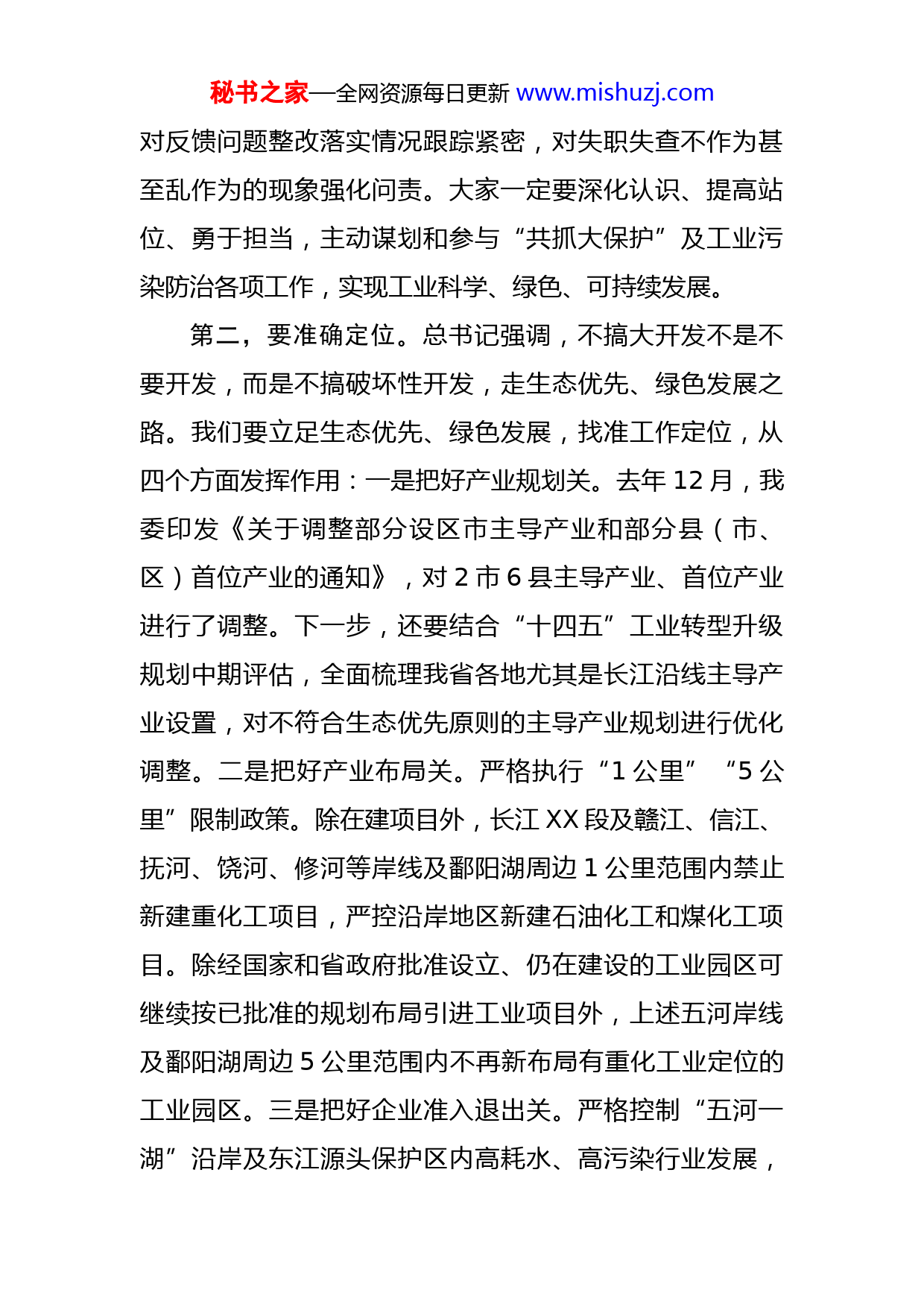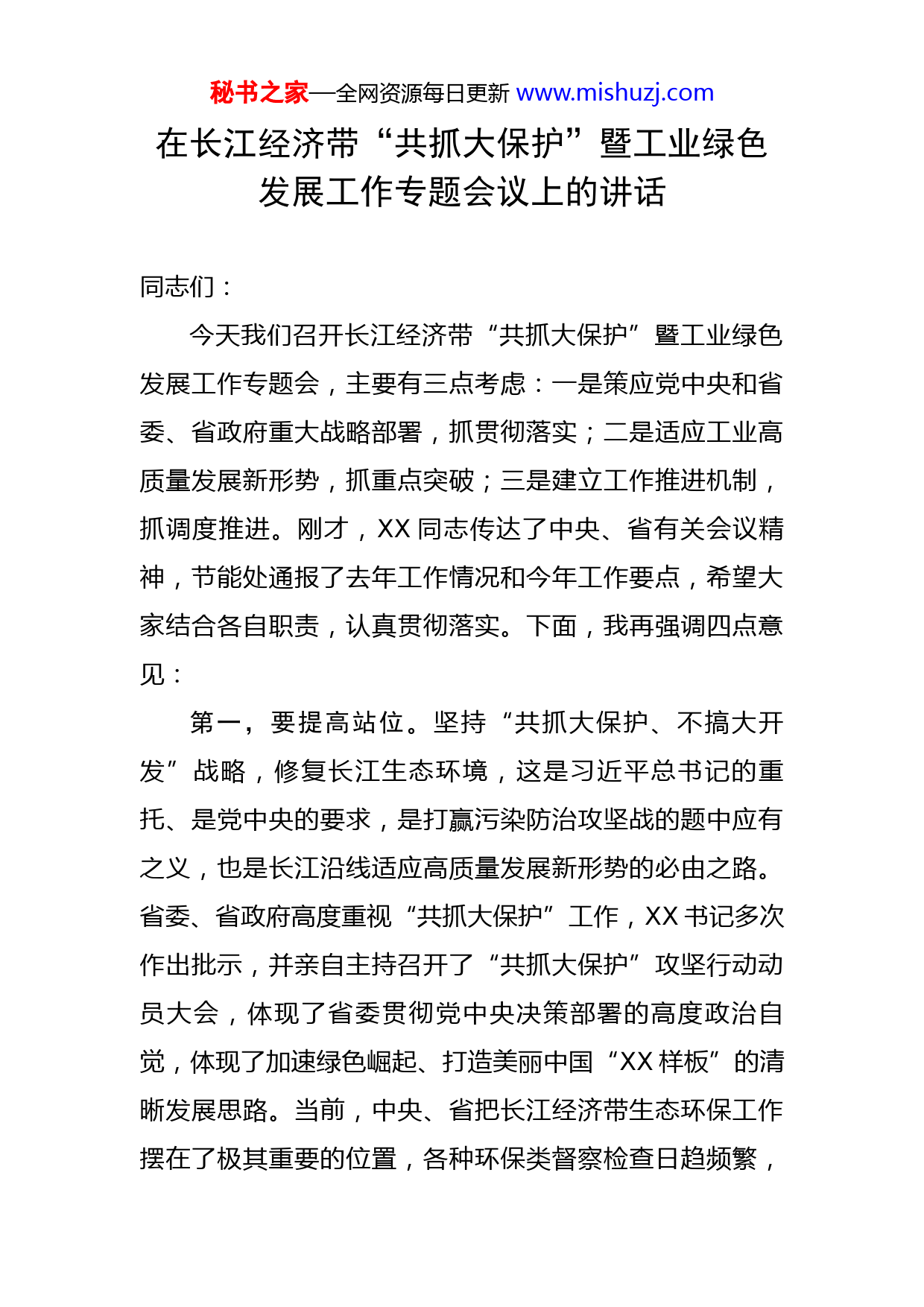 秘书之家—全网资源每日更新www.mishuzj.com在长江经济带“共抓大保护”暨工业绿色发展工作专题会议上的讲话同志们:今天我们召开长江经济带“共抓大保护”暨工业绿色发展工作专题会,主要有三点考虑:一是策应党中央和省委、省政府重大战略部署,抓贯彻落实;二是适应工业高质量发展新形势,抓重点突破;三是建立工作推进机制,抓调度推进。刚才,XX同志传达了中央、省有关会议精神,节能处通报了去年工作情况和今年工作要点,希望大家结合各自职责,认真贯彻落实。下面,我再强调四点意见:第一,要提高站位。坚持“共抓大保护、不搞大开发”战略,修复长江生态环境,这是习近平总书记的重托、是党中央的要求,是打赢污染防治攻坚战的题中应有之义,也是长江沿线适应高质量发展新形势的必由之路。省委、省政府高度重视“共抓大保护”工作,XX书记多次作出批示,并亲自主持召开了“共抓大保护”攻坚行动动员大会,体现了省委贯彻党中央决策部署的高度政治自觉,体现了加速绿色崛起、打造美丽中国“XX样板”的清晰发展思路。当前,中央、省把长江经济带生态环保工作摆在了极其重要的位置,各种环保类督察检查日趋频繁,秘书之家—全网资源每日更新www.mishuzj.com对反馈问题整改落实情况跟踪紧密,对失职失查不作为甚至乱作为的现象强化问责。大家一定要深化认识、提高站位、勇于担当,主动谋划和参与“共抓大保护”及工业污染防治各项工作,实现工业科学、绿色、可持续发展。第二,要准确定位。总书记强调,不搞大开发不是不要开发,而是不搞破坏性开发,走生态优先、绿色发展之路。我们要立足生态优先、绿色发展,找准工作定位,从四个方面发挥作用:一是把好产业规划关。去年12月,我委印发《关于调整部分设区市主导产业和部分县(市、区)首位产业的通知》,对2市6县主导产业、首位产业进行了调整。下一步,还要结合“十四五”工业转型升级规划中期评估,全面梳理我省各地尤其是长江沿线主导产业设置,对不符合生态优先原则的主导产业规划进行优化调整。二是把好产业布局关。严格执行“1公里”“5公里”限制政策。除在建项目外,长江XX段及赣江、信江、抚河、饶河、修河等岸线及鄱阳湖周边1公里范围内禁止新建重化工项目,严控沿岸地区新建石油化工和煤化工项目。除经国家和省政府批准设立、仍在建设的工业园区可继续按已批准的规划布局引进工业项目外,上述五河岸线及鄱阳湖周边5公里范围内不再新布局有重化工业定位的工业园区。三是把好企业准入退出关。严格控制“五河一湖”沿岸及东江源头保护区内高耗水、高污染行业发展,秘书之家—全网资源每日更新www.mishuzj.com利用综合标准依法依规推进钢铁、水泥、电解铝、平板玻璃等行业落后产能退出,有效化解过剩产能。四是把好产业结构调整关。聚焦产业转型升级,大力实施新兴产业倍增工程、传统产业优化升级工程、新经济新动能培育工程,推动新兴产业规模化、传统产业高端化、生产型服务业现代化,形成新兴产业、先进制造业、现代服务业协同发展的新产业体系。第三,要履职到位。相比以往,今年长江经济带“共抓大保护”、生态文明建设、工业污染防治和工业绿色发展等方面任务更重、责任更大。如何履好职、抓落实,我认为要做到三个“心里有数”:一是对任务清单心里有数。结合我委的职责,重点是要在推进绿色制造体系建设、推进化工企业污染防治、开展工业固废综合利用大排查、支持节能减排技术改造、抓好国家督察反馈问题整改落实等五个方面下功夫。二是对重点举措心里有数。1.关于推进绿色制造体系建设,要指导园区完善污水管网收集体系和集中处理设施建设运营,鼓励企业、园区创建绿色工厂、绿色工业园区,支持赣江新区开展绿色制造体系建设试点。2.关于推进化工企业污染防治,要落实《关于加强长江经济带工业绿色发展的指导意见》,加强沿江沿河化工产业布局管控。进一步推进城镇人口密集区危险化学品生产企业搬迁工作,督促正在搬迁的企业加快进度,已搬迁秘书之家—全网资源每日更新www.mishuzj.com企业要做到人清、设备清、垃圾清、土地清,彻底根除长江污染隐患。进一步修改完善《XX省小化工企业清理整顿退出工作方案》,尽快启动小化工企业整顿退出工作。3.关于开展工业固废综合利用大排查,要落实《工业和信息化部办公厅关于做好长江经济带固体废物大排查行动的通知》,以2022年度为基准,全面排查我省工业固体废物综合利用量、综合利用产值、产品种类、企业数量、就业人数,以及各地财税、资金等政策支持情况。4.关于支持节能减排技术改造,要用好省级中国制造2025专项资金,积极推进绿色制造工程,推进工业企业自愿清洁生产审核,从源头上减少污染物的排放。5.关于抓好国家督察反馈问题整改落实,要抓好2021年中央环保督察以来制定的各项整改工作方案的落实,上饶市市辖区城市建成区燃煤锅炉整治情况还需进一步调度;赣州稀土冶炼有关问题整改还需持续推进;要督促建设滞后的工业园区加快建设进程,已建成的要督促园区确保运行稳定并达标排放。在抓好国家督察反馈问题整改落实的同时,要“举一反三”,在全省范围内进一步筛查,发现问题立即整改。这个月中下旬,中央环保督察“回头看”