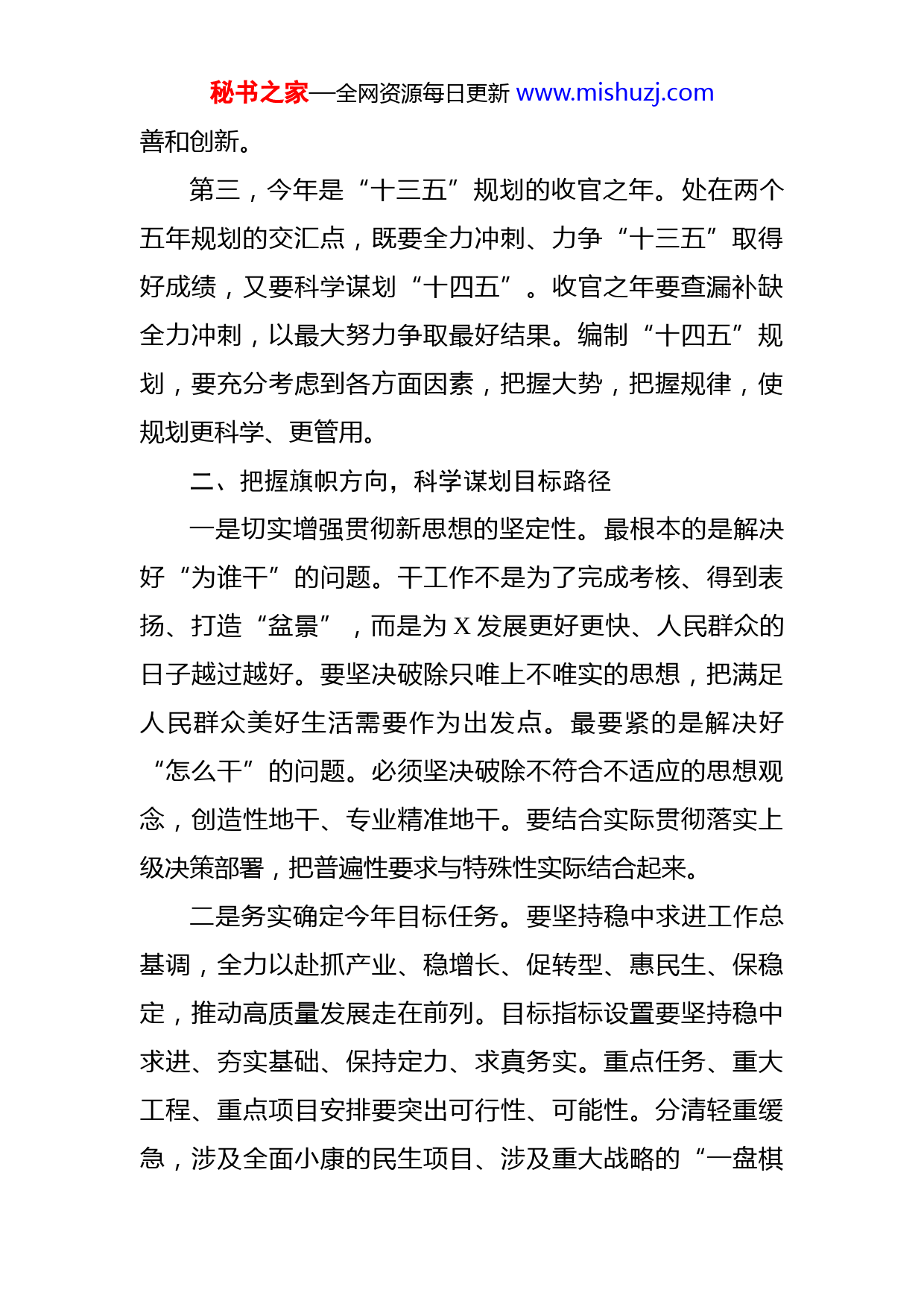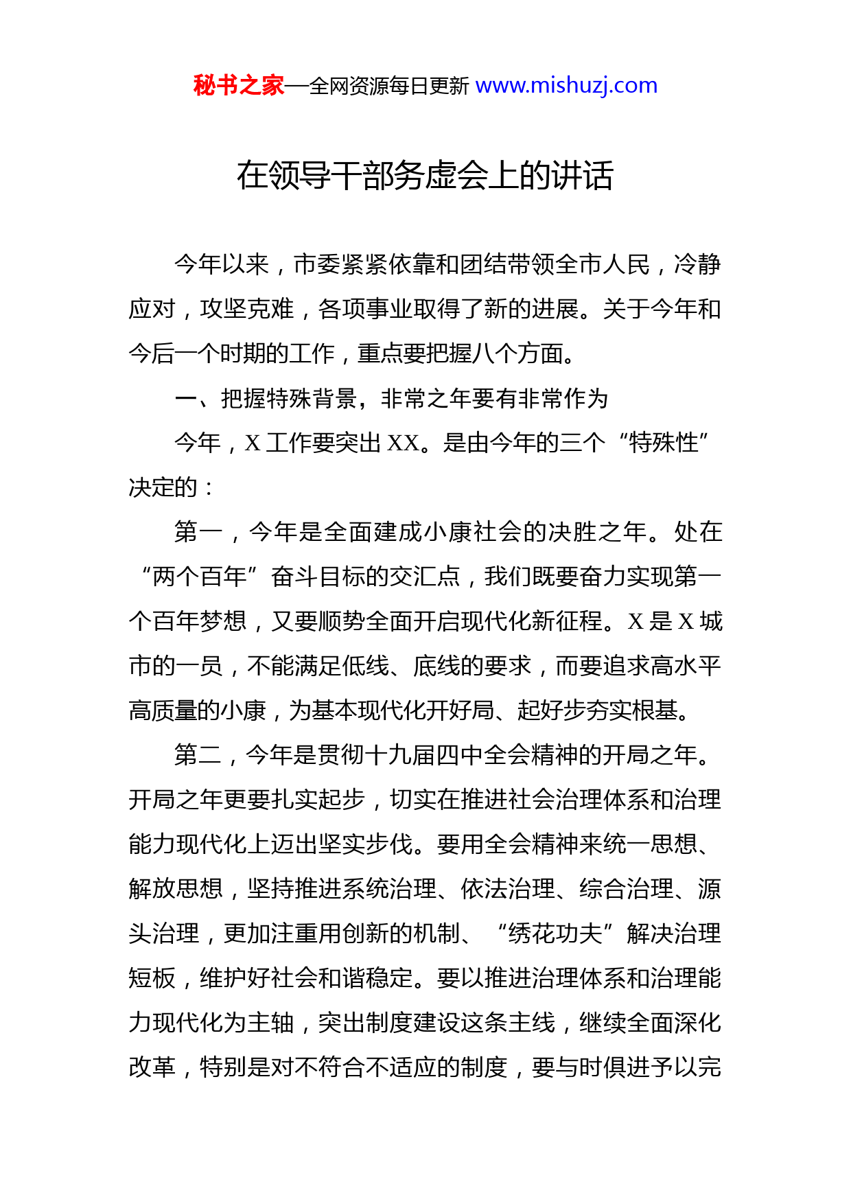 秘书之家—全网资源每日更新www.mishuzj.com在领导干部务虚会上的讲话今年以来,市委紧紧依靠和团结带领全市人民,冷静应对,攻坚克难,各项事业取得了新的进展。关于今年和今后一个时期的工作,重点要把握八个方面。一、把握特殊背景,非常之年要有非常作为今年,X工作要突出XX。是由今年的三个“特殊性”决定的:第一,今年是全面建成小康社会的决胜之年。处在“两个百年”奋斗目标的交汇点,我们既要奋力实现第一个百年梦想,又要顺势全面开启现代化新征程。X是X城市的一员,不能满足低线、底线的要求,而要追求高水平高质量的小康,为基本现代化开好局、起好步夯实根基。第二,今年是贯彻十九届四中全会精神的开局之年。开局之年更要扎实起步,切实在推进社会治理体系和治理能力现代化上迈出坚实步伐。要用全会精神来统一思想、解放思想,坚持推进系统治理、依法治理、综合治理、源头治理,更加注重用创新的机制、“绣花功夫”解决治理短板,维护好社会和谐稳定。要以推进治理体系和治理能力现代化为主轴,突出制度建设这条主线,继续全面深化改革,特别是对不符合不适应的制度,要与时俱进予以完秘书之家—全网资源每日更新www.mishuzj.com善和创新。第三,今年是“十三五”规划的收官之年。处在两个五年规划的交汇点,既要全力冲刺、力争“十三五”取得好成绩,又要科学谋划“十四五”。收官之年要查漏补缺全力冲刺,以最大努力争取最好结果。编制“十四五”规划,要充分考虑到各方面因素,把握大势,把握规律,使规划更科学、更管用。二、把握旗帜方向,科学谋划目标路径一是切实增强贯彻新思想的坚定性。最根本的是解决好“为谁干”的问题。干工作不是为了完成考核、得到表扬、打造“盆景”,而是为X发展更好更快、人民群众的日子越过越好。要坚决破除只唯上不唯实的思想,把满足人民群众美好生活需要作为出发点。最要紧的是解决好“怎么干”的问题。必须坚决破除不符合不适应的思想观念,创造性地干、专业精准地干。要结合实际贯彻落实上级决策部署,把普遍性要求与特殊性实际结合起来。二是务实确定今年目标任务。要坚持稳中求进工作总基调,全力以赴抓产业、稳增长、促转型、惠民生、保稳定,推动高质量发展走在前列。目标指标设置要坚持稳中求进、夯实基础、保持定力、求真务实。重点任务、重大工程、重点项目安排要突出可行性、可能性。分清轻重缓急,涉及全面小康的民生项目、涉及重大战略的“一盘棋秘书之家—全网资源每日更新www.mishuzj.com工程”等,要应保必保;其他虽长期需要但当前并不急迫的,先做前期研究、规划论证。三是科学规划“十四五”发展。务必谋深谋细谋实,强调“四个注重”:注重全面小康与现代化的衔接。要把全面小康作为新起点,以现代化标准谋划“十四五”发展着眼于实现高品质发展、高品质生活,谋划一些关键性、战略性、撬动力强的具体事项和工作抓手。注重抓根本抓制度。要聚焦现代化建设中的基础性问题,把参照系找准把关键处想深、把路线图绘好。注重有所为有所不为。城市群一体化发展强调分工协作,错位发展。只有集中力量在基础好、具备发展条件的重点领域重点突破,构建自己的特色优势,才有条件分享重大战略红利。注重实事求是所有的谋划设计要遵循规律、科学务实,坚决杜绝喊口号炒概念。三、把握形势挑战,坚持稳中求进主基调今年困难挑战因素变化增多,形势依然严峻复杂。要突出“稳”的要求,尤其是稳增长、稳实体、稳财税。要稳住企业家的预期,让他们能投、敢投、愿投。要紧抓重点项目推进,在建项目要紧盯不放,加大要素保障力度,争取早建成、早达效。要落实“保”的措施,尤其是保债务不出险、保安全不出事、保稳定不出乱子。要压紧压实责任,坚决守住债务风险底线。要深入排查风险隐患,重秘书之家—全网资源每日更新www.mishuzj.com点加强安全生产专项整治,保证社会安全稳定。兜牢民生保底线,使全社会幼有所育、老有所养、贫有所依、难有所助,保障基本民生。要增强“进”的动力,尤其是要激发市场主体的活力、激发干部担当干事的动力。要更大力度推进改革,深层次破解体制机制束缚。要大力弘扬正气鞭策后进,激发干部群众干事创业精气神。领导干部一定要善于从政治的高度观大势、抓大事。要认真贯彻落实党中央确定的大政方针,主动作为、积极应对,绝不能为眼前利益而损害长远发展的根基,绝不能因一时得失而动摇信念、半途而废,更不能走回头路。对于重大机遇,要坚决打破等靠要思想,增强进取精神,以我为主、深入研究,制定最重要最紧迫的工作清单。四、把握四中全会精神,用制度破题解难一要加强制度建设,让制度更好推动高质量发展。贯彻落实四中全会精神,要把握精髓实质,在基本制度的大框架内,结合X实际,创造性落实、创新性发展。要特别注重完善行政体制,尤其要在提高行政效率、优化市场配置资源效能、提升营商环境上下功夫。要最大限度减少“人为划线”空间,为所有市场主体创造公平公正的发展环境,在市场化、法治化、国际化上有质的提升。二要注重整体推动,把制度优势转化为治理效能。要补齐补好制度短板,用系统性制度建设推动治理效能全面秘书之家—全网资源每日更新