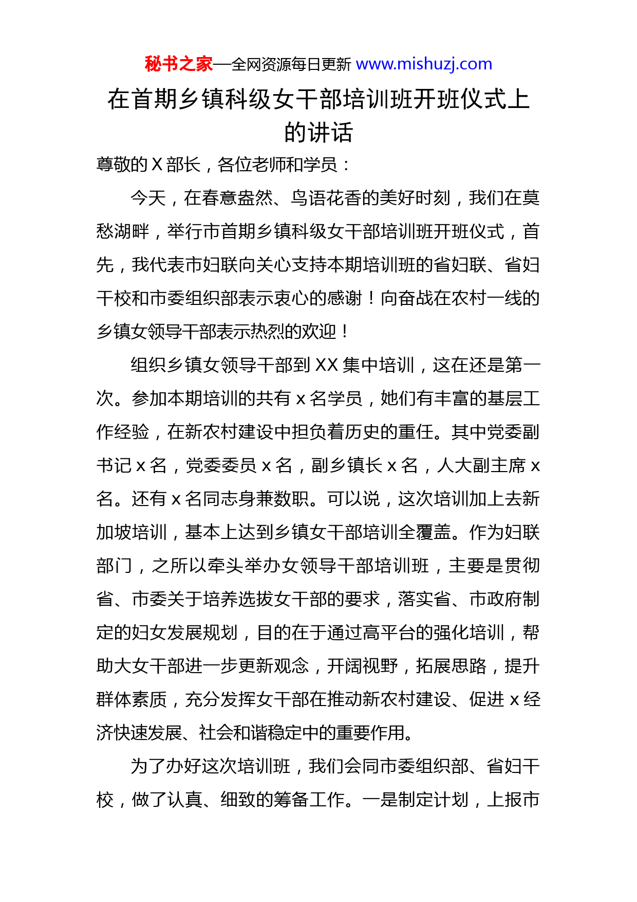 秘书之家—全网资源每日更新www.mishuzj.com在首期乡镇科级女干部培训班开班仪式上的讲话尊敬的X部长,各位老师和学员:今天,在春意盎然、鸟语花香的美好时刻,我们在莫愁湖畔,举行市首期乡镇科级女干部培训班开班仪式,首先,我代表市妇联向关心支持本期培训班的省妇联、省妇干校和市委组织部表示衷心的感谢!向奋战在农村一线的乡镇女领导干部表示热烈的欢迎!组织乡镇女领导干部到XX集中培训,这在还是第一次。参加本期培训的共有x名学员,她们有丰富的基层工作经验,在新农村建设中担负着历史的重任。其中党委副书记x名,党委委员x名,副乡镇长x名,人大副主席x名。还有x名同志身兼数职。可以说,这次培训加上去新加坡培训,基本上达到乡镇女干部培训全覆盖。作为妇联部门,之所以牵头举办女领导干部培训班,主要是贯彻省、市委关于培养选拔女干部的要求,落实省、市政府制定的妇女发展规划,目的在于通过高平台的强化培训,帮助大女干部进一步更新观念,开阔视野,拓展思路,提升群体素质,充分发挥女干部在推动新农村建设、促进x经济快速发展、社会和谐稳定中的重要作用。为了办好这次培训班,我们会同市委组织部、省妇干校,做了认真、细致的筹备工作。一是制定计划,上报市秘书之家—全网资源每日更新www.mishuzj.com委组织部统筹安排;二是联系场所,选择在省妇干校异地培训,得到省妇联和省妇干校的大力支持。妇干校专门安排副校长x和班主任x负责我们这个班的工作,省妇联x部长不仅对培训工作给以指导还亲自来参加开班仪式并作重要讲话;三是课程设置,突出乡镇女干部自身发展及岗位需要设计教学内容,既有党的十九大精神和有关新型工业化与新农村建设等政策理论;又有领导艺术和法律、身心健康、形象塑造等女干部必备的知识;还安排优秀女干部事迹报告和“我能、我行、我成功”主题演讲以及到世界著名企业——x集团考察学习,等等,力争让大家在短时间内能够获取较多的信息量;四是教师聘请,这次培训班邀请的老师都是知名教授,听了他们的课,会让大家有“听君一席话胜读十年书”的感觉;五是组织管理,本期培训班得到市委常委、组织部长x和市委组织部分管部长x以及组织部培训处处长x的高度重视,他们对培训班提出了很高的要求。今天,x处长还专程赶来参加并主持开班仪式。我们市妇联安排x部长全程带队,做好相关工作。我和妇联其他几位同志也在为本次培训班做好服务工作。为了把这次培训班办出特色,办出成效,在此,提几点建议与大家共勉:一、珍惜时间,严肃纪律这次培训班是我市培训女干部方式的一次创新,无论秘书之家—全网资源每日更新www.mishuzj.com对组织者还是学习者来说,都是一次难得的机会和严峻的考验。而且,本期培训班是在大家工作都非常繁忙的时候举办的,学习机会更是来之不易。建市以来,在妇联部门的积极呼吁和组织部门的关心培养下,通过公开选拔、公推公选等方式,使一大批优秀女性走上了领导岗位。但随着形势发展的快速变化和工作岗位的严格要求以及人们对女干部的期望值不断提高,很多女干部都有“知识恐慌”和“本领危机”的感觉。现在,组织上为我们提供了难得的学习机会,应该感谢各级领导对女干部成长的高度重视和真心关怀。因此,要求参与培训班的所有管理人员和全体学员,必须严格遵守作息时间和《培训班须知》中的各项要求。每次上课至少提前5分钟进教室,由班主任负责考勤签名,凡迟到者一律算缺席。考勤结果记入个人学习档案。大家知道,守时也是守信,这既是对授课老师的礼貌和尊重,也反映x女干部的良好作风和整体形象。二、勤学敏思,有所收获根据日程安排,短短几天时间,涵盖专家授课、事迹报告、主题演讲和外出考察等多项内容,希望大家克服困难,排除干扰,静下心来,全身心融入培训的全过程,处处做有心人。尤其是在听专家授课时,应勤于学习,敏于思考,如饥似渴地吸纳知识。特别是课堂上一定要跟上老师讲课的节奏,把握讲课脉络和关键性的知识点。千万不秘书之家—全网资源每日更新www.mishuzj.com能分神、分心,更不能在课堂接打手机。因为,教授们往往把对大学生用一个学期讲授的内容浓缩到两个小时来讲,所讲内容应该说都是精华,稍不留神,就会错过。因此,希望大家能认真听讲,细心领会,并学有所思,学有所悟,学有所获。从而形成“学、思、行”相统一。培训结束前,每位学员还要把所学理论结合工作实际,撰写一份不少于1500字的学习小结。三、互相交流,广交朋友本次培训班的学员来自全市各地,大家难得相聚。按照王处长的要求,本次培训班住宿是将互相不熟悉的人安排在一起的,这为大家结交新朋友提供了方便。希望你们相互学习、相互交流,在一起消化学习内容,探讨疑难问题,交流工作经验,畅谈生活感悟。使本次培训班能给大家留下一段难忘而美好的记忆。当然,培训班学习是短暂的,不可能满足每个人的需求。但我希望通过培训,能使大家激发学习热情,激活创新思维,激励进取精神,从而树立“我能、我行、我成功”的强势心理,为推进x后发快进,建设全面奔小康社会做出新的更大的贡献!最后,祝在座的各位身体健康,生活幸福,前程似锦,事业辉煌!祝培训班取得圆满成功!