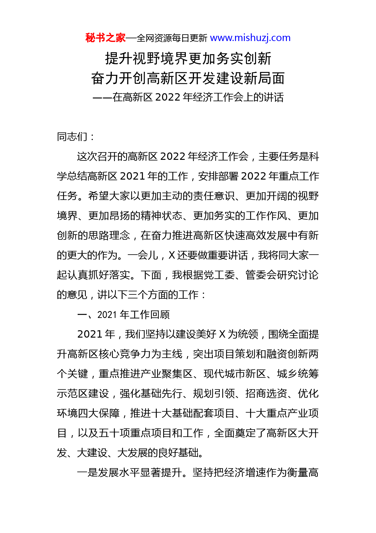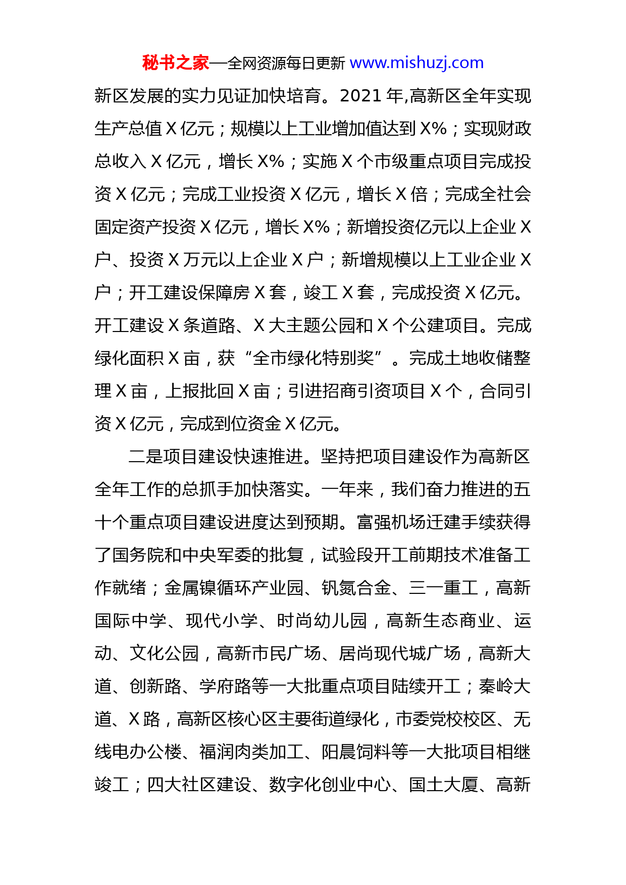秘书之家—全网资源每日更新www.mishuzj.com提升视野境界更加务实创新奋力开创高新区开发建设新局面——在高新区2022年经济工作会上的讲话同志们:这次召开的高新区2022年经济工作会,主要任务是科学总结高新区2021年的工作,安排部署2022年重点工作任务。希望大家以更加主动的责任意识、更加开阔的视野境界、更加昂扬的精神状态、更加务实的工作作风、更加创新的思路理念,在奋力推进高新区快速高效发展中有新的更大的作为。一会儿,X还要做重要讲话,我将同大家一起认真抓好落实。下面,我根据党工委、管委会研究讨论的意见,讲以下三个方面的工作:一、2021年工作回顾2021年,我们坚持以建设美好X为统领,围绕全面提升高新区核心竞争力为主线,突出项目策划和融资创新两个关键,重点推进产业聚集区、现代城市新区、城乡统筹示范区建设,强化基础先行、规划引领、招商选资、优化环境四大保障,推进十大基础配套项目、十大重点产业项目,以及五十项重点项目和工作,全面奠定了高新区大开发、大建设、大发展的良好基础。一是发展水平显著提升。坚持把经济增速作为衡量高秘书之家—全网资源每日更新www.mishuzj.com新区发展的实力见证加快培育。2021年,高新区全年实现生产总值X亿元;规模以上工业增加值达到X%;实现财政总收入X亿元,增长X%;实施X个市级重点项目完成投资X亿元;完成工业投资X亿元,增长X倍;完成全社会固定资产投资X亿元,增长X%;新增投资亿元以上企业X户、投资X万元以上企业X户;新增规模以上工业企业X户;开工建设保障房X套,竣工X套,完成投资X亿元。开工建设X条道路、X大主题公园和X个公建项目。完成绿化面积X亩,获“全市绿化特别奖”。完成土地收储整理X亩,上报批回X亩;引进招商引资项目X个,合同引资X亿元,完成到位资金X亿元。二是项目建设快速推进。坚持把项目建设作为高新区全年工作的总抓手加快落实。一年来,我们奋力推进的五十个重点项目建设进度达到预期。富强机场迁建手续获得了国务院和中央军委的批复,试验段开工前期技术准备工作就绪;金属镍循环产业园、钒氮合金、三一重工,高新国际中学、现代小学、时尚幼儿园,高新生态商业、运动、文化公园,高新市民广场、居尚现代城广场,高新大道、创新路、学府路等一大批重点项目陆续开工;秦岭大道、X路,高新区核心区主要街道绿化,市委党校校区、无线电办公楼、福润肉类加工、阳晨饲料等一大批项目相继竣工;四大社区建设、数字化创业中心、国土大厦、高新秘书之家—全网资源每日更新www.mishuzj.com医院(儿童医院)、公安大厦、北医大制药等一大批重点项目建设速度加快;路网布局、变电站及公共电网建设、供水、污水处理等市政配套工程项目规划设计和项目争取前期准备工作都在整体推进。三是“三区”建设协调发展。坚持把“三区”建设作为高新区开发建设的总目标加快实施。通盘考虑产业集聚区、现代城市新区、统筹城乡示范区之间的关联,通过城市新区建设聚集人气拉动商气,服务招商引资;通过产业新区建设提升发展空间和开拓各类市场资源,促进新区建设,进而利用城市新区建设运营的收益和提升的资源价值,反哺产业新区建设;通过社区聚集人口为第二、第三产业的发展提供稳定的劳务资源,以第二、第三产业的发展带动和解决社区人口就业,使社区建设与产业发展相互促进、互相补充。我们全年推进X余个重点产业项目建设,产业聚集区建设成效初显;我们奋力推进高新区核心区X平方公里的开发建设,以及居尚现代城建设,城市新区建设骨架规模初具。我们开工建设X大社区,统筹城乡在全市起到一定的示范作用。高新区“三区”建设良性互动、互利共赢、有序发展的格局初步形成。四是借智创新深入推进。坚持把思路理念创新作为开发建设高新区的核心要素加快完善。首先,积极探索创新与高新区发展形势更相适应的政策体制,建立起务实高秘书之家—全网资源每日更新www.mishuzj.com效、充满活力的经营、运营模式,全年有针对性的出台各项规章、制度、工作规程X余项,高新区建设发展保障能力和工作谋划水平得到进一步提升;其次,积极探索创新宽领域、多途径、深层次的多元化投融资机制,全年多渠道融资X余亿元,高新区建设资金匮乏的制约和产业项目建设融资不足的矛盾得到进一步化解;第三,积极探索创新盘活各类资源要素,建立项目策划生成的市场化运作体制,全年策划各类项目X余个,高新区市场化运行机制得到进一步完善;第四,积极探索创新新形势下征地拆迁安置的方法措施,建立与民生工程同步实施的征地拆迁安置政策机制,全年实施拆迁X余户,安置群众X余户,高新区党、干群关系得到进一步融洽;第五,积极探索创新自身建设的机制体制,全面打造务实高效清廉的服务机关,高新区的群体向心力和凝聚感召力得到进一步加强。同时,我们还在党建、党风廉政建设、监察审计、群团工作、民生工程、社会事业、双创、作风建设等多个方面取得了新的成效。我们这些成绩的取得,是市委、市政府正确领导、科学指导的结果,是市直各部门积极配合、大力支持的结果,也是在座各位同舟共济、攻坚克难的结果。在此,我代表党工委、管委会向大家的辛勤努力和艰辛付出表示衷心的感谢!秘书之家—全网资源每日更新www.mishuzj.com2
