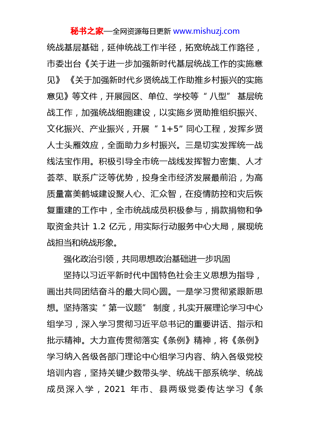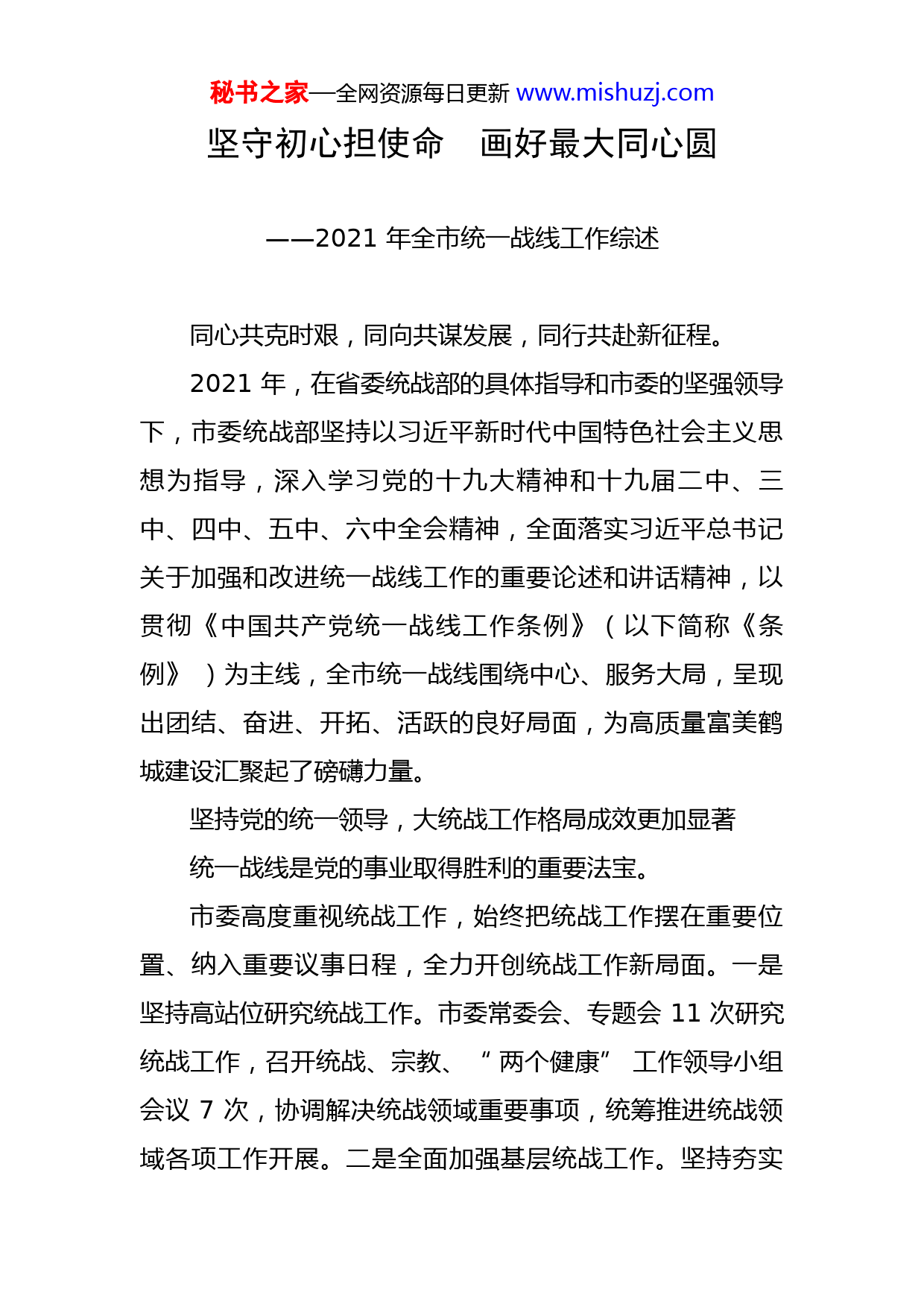 秘书之家—全网资源每日更新www.mishuzj.com坚守初心担使命画好最大同心圆——2021年全市统一战线工作综述同心共克时艰,同向共谋发展,同行共赴新征程。2021年,在省委统战部的具体指导和市委的坚强领导下,市委统战部坚持以习近平新时代中国特色社会主义思想为指导,深入学习党的十九大精神和十九届二中、三中、四中、五中、六中全会精神,全面落实习近平总书记关于加强和改进统一战线工作的重要论述和讲话精神,以贯彻《中国共产党统一战线工作条例》(以下简称《条例》)为主线,全市统一战线围绕中心、服务大局,呈现出团结、奋进、开拓、活跃的良好局面,为高质量富美鹤城建设汇聚起了磅礴力量。坚持党的统一领导,大统战工作格局成效更加显著统一战线是党的事业取得胜利的重要法宝。市委高度重视统战工作,始终把统战工作摆在重要位置、纳入重要议事日程,全力开创统战工作新局面。一是坚持高站位研究统战工作。市委常委会、专题会11次研究统战工作,召开统战、宗教、“两个健康”工作领导小组会议7次,协调解决统战领域重要事项,统筹推进统战领域各项工作开展。二是全面加强基层统战工作。坚持夯实秘书之家—全网资源每日更新www.mishuzj.com统战基层基础,延伸统战工作半径,拓宽统战工作路径,市委出台《关于进一步加强新时代基层统战工作的实施意见》《关于加强新时代乡贤统战工作助推乡村振兴的实施意见》等文件,开展园区、单位、学校等“八型”基层统战工作,加强统战细胞建设,以实施乡贤助推组织振兴、文化振兴、产业振兴,开展“1+5”同心工程,发挥乡贤人士头雁效应,全面助力乡村振兴。三是切实发挥统一战线法宝作用。积极引导全市统一战线发挥智力密集、人才荟萃、联系广泛等优势,投身全市经济发展最前沿,为高质量富美鹤城建设聚人心、汇众智,在疫情防控和灾后恢复重建的工作中,全市统战成员积极参与,捐款捐物和争取资金共计1.2亿元,用实际行动服务中心大局,展现统战担当和统战形象。强化政治引领,共同思想政治基础进一步巩固坚持以习近平新时代中国特色社会主义思想为指导,画出共同团结奋斗的最大同心圆。一是学习贯彻紧跟新思想。坚持落实“第一议题”制度,扎实开展理论学习中心组学习,深入学习贯彻习近平总书记的重要讲话、指示和批示精神。大力宣传贯彻落实《条例》精神,将《条例》学习纳入各级各部门理论中心组学习内容、纳入各级党校培训内容,坚持关键少数带头学、统战干部系统学、统战成员深入学,2021年市、县两级党委传达学习《条秘书之家—全网资源每日更新www.mishuzj.com例》14次,培训党政干部887人次,培训党外人士618人次,切实推动《条例》在鹤壁落地生根。二是凝心聚力迈出新步伐。以参观革命圣地、知识竞赛、辅导讲座、专题研读,征文比赛等多种形式在统战各领域开展主题教育,在各民主党派和无党派人士中开展“学中共党史、守合作初心、开事业新局”主题教育,在新的社会阶层人士中开展“凝聚新力量筑梦新时代”主题教育,在全市范围开展“中华民族一家亲,同心共筑中国梦”主题教育、在民营经济人士领域开展理想信念主题教育,真正把党的创新理论转化为大团结大联合的思想共识和行动自觉,转化为推动鹤壁经济社会发展的强大合力。三是党建工作再上新台阶。坚持以党建高质量推动统战工作高质量,以党史学习教育为契机,以“统战大讲堂”为载体,引导党员干部学党史、讲党课、用党史。以“双一流”模范机关创建为抓手,开展“日诵习语、周背文章、月读好书、季谈经验”活动,提高统战干部党性修养。将党史学习教育与理论学习中心组学习、主题党日活动、组织生活会和民主生活会相结合,构建部机关学习研讨、主题党日活动观摩实践和组织生活会、民主生活会反思提升的学习矩阵,做到有声有色“学党史”,入脑入心“悟思想”,用心用情“办实事”,见行见效“开新局”,切实把党史学习成效转化为统战工作成效。秘书之家—全网资源每日更新www.mishuzj.com打造“鹤壁模式”,新时代“两个健康”持续领跑坚持高位谋划、全域创建、齐力共推、示范引领,持续打造“两个健康”鹤壁模式、鹤壁标杆。一是强化顶层设计,垒实工作基石。坚持整建制创建“两个健康”示范市目标,通过开展“两个健康”示范市创建工作领导小组会议、县区观摩会、专项工作推进会等形式,推动重大决策部署落地;通过持续实施“两个健康”十大提升工程,推动“两个健康”工作往深处走、往实处做;通过指导各县区开展“两个健康”示范创建活动,推动各项工作落实,推动民营经济创新源泉充分涌动、民营企业创造活力充分迸发。淇县荣获河南省首批“两个健康”实践创新示范县。二是强化平台建设,丰富工作载体。建强用好“鹤商家园”“同心家园”“乡贤家园”“暖心家园”两个健康四级实践中心,实现全市所有民营企业和市场主体服务全覆盖。举办第二届“鹤壁市企业家节”,市、县、单位协同联动开展企业家节系列庆祝活动,营造尊商重商亲商爱商浓厚氛围。用好三级民营企业家学院(课堂)平台,实施民营企业家“1+5”教育培训模式,全面提高企业家能力素质。三是强化问题导向,注重工作成效。用好线上民营企业诉求响应智慧平台,办好每月28
