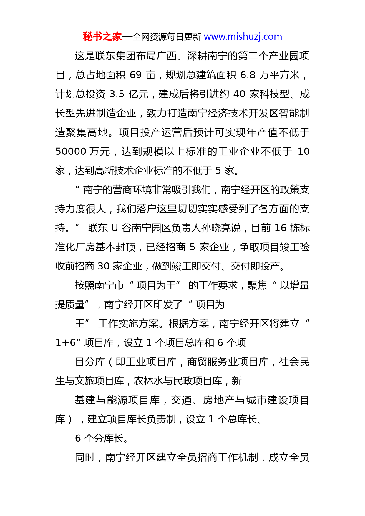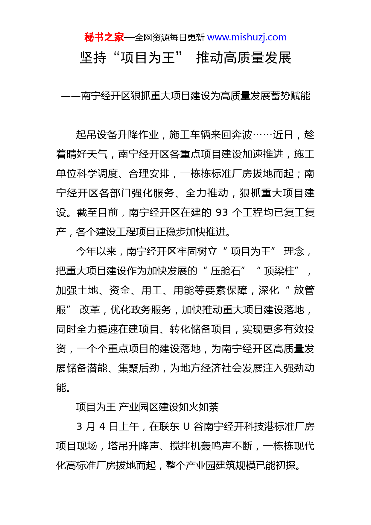 秘书之家—全网资源每日更新www.mishuzj.com坚持“项目为王”推动高质量发展——南宁经开区狠抓重大项目建设为高质量发展蓄势赋能起吊设备升降作业,施工车辆来回奔波近日,趁⋯⋯着晴好天气,南宁经开区各重点项目建设加速推进,施工单位科学调度、合理安排,一栋栋标准厂房拔地而起;南宁经开区各部门强化服务、全力推动,狠抓重大项目建设。截至目前,南宁经开区在建的93个工程均已复工复产,各个建设工程项目正稳步加快推进。今年以来,南宁经开区牢固树立“项目为王”理念,把重大项目建设作为加快发展的“压舱石”“顶梁柱”,加强土地、资金、用工、用能等要素保障,深化“放管服”改革,优化政务服务,加快推动重大项目建设落地,同时全力提速在建项目、转化储备项目,实现更多有效投资,一个个重点项目的建设落地,为南宁经开区高质量发展储备潜能、集聚后劲,为地方经济社会发展注入强劲动能。项目为王产业园区建设如火如荼3月4日上午,在联东U谷南宁经开科技港标准厂房项目现场,塔吊升降声、搅拌机轰鸣声不断,一栋栋现代化高标准厂房拔地而起,整个产业园建筑规模已能初探。秘书之家—全网资源每日更新www.mishuzj.com这是联东集团布局广西、深耕南宁的第二个产业园项目,总占地面积69亩,规划总建筑面积6.8万平方米,计划总投资3.5亿元,建成后将引进约40家科技型、成长型先进制造企业,致力打造南宁经济技术开发区智能制造聚集高地。项目投产运营后预计可实现年产值不低于50000万元,达到规模以上标准的工业企业不低于10家,达到高新技术企业标准的不低于5家。“南宁的营商环境非常吸引我们,南宁经开区的政策支持力度很大,我们落户这里切切实实感受到了各方面的支持。”联东U谷南宁园区负责人孙晓亮说,目前16栋标准化厂房基本封顶,已经招商5家企业,争取项目竣工验收前招商30家企业,做到竣工即交付、交付即投产。按照南宁市“项目为王”的工作要求,聚焦“以增量提质量”,南宁经开区印发了“项目为王”工作实施方案。根据方案,南宁经开区将建立“1+6”项目库,设立1个项目总库和6个项目分库(即工业项目库,商贸服务业项目库,社会民生与文旅项目库,农林水与民政项目库,新基建与能源项目库,交通、房地产与城市建设项目库),建立项目库长负责制,设立1个总库长、6个分库长。同时,南宁经开区建立全员招商工作机制,成立全员秘书之家—全网资源每日更新www.mishuzj.com招商工作组,设立10个产业链供应链招商工作队,开展产业链供应链精准招商,并明确招商责任,落实管委会领导带队招商、行业主管部门牵头招商责任制,夯实招商主体责任,完善招商激励机制,确保完成南宁市下达的签约项目履约率、资金到位率、开工率、竣工投产率各项目标任务。此外,南宁经开区还成立督战考评组,建立督战考评工作机制,制定督战考评工作方案,实施党工委、管委会领导联系督战制度,实行“专班专抓”机制,对“项目为王”工作推进情况及重点工作、重大项目进行督战,推行“两榜两挂钩一问责”考评制度,进一步压实各单位责任。主动作为狠抓重大项目建设不放松近日,一条连接星光大道、平行于金凯路的规划路——金凯北路(通源路—星光大道)正在忙碌施工中,这是南宁经开区金凯工业园区内新建的城市支路。道路建设主要服务于两侧地块,建成通车后将有效缓解局部区域交通压力,给周边学校、商业、住宅小区出行带来极大便利,对提升周边居民生活品质及完善片区交通路网有着重大的意义。该项目预计今年10月完成道路主体工程建设,达到通车条件,年底前完成项目建设。为推进这一路网项目建设,南宁经开区建设发展局主秘书之家—全网资源每日更新www.mishuzj.com动作为,提前指导服务,快速介入质量安全监督,保障项目施工质量、安全生产良性发展;加大协调力度,有效解决项目建设与周边房地产让地施工问题,减小施工干扰;监督服务项目切实做好复工复产和疫情防控工作,全面落实“早抓快干一季度、稳中求进开好局”的工作部署。“今年一季度,为确保重大项目和基础设施建设安全有序推进,我们采取‘局领导带队督导+一对一监督服务’工作模式,通过实施项目分级管控和质量安全责任到人的措施,抢进度、保安全、提质量、促发展。同时,持续推行‘妈妈式’服务,在项目建设全过程主动提供前期技术服务,积极关注项目进度,及时掌握和调解项目难题,切实推动项目早落地、快建设、稳竣工、速达效。”南宁经开区建设发展局市政监督科负责人谭娟娟说。据统计,2021年南宁经开区市级以上层面统筹推进重大项目、市领导联系重大项目、强首府标志性重大项目、列入自治区“双百双新”重大项目投资完成率分别为157.95%、218.32%、145.31%、105.32%。今年以来,南宁经开区制定了“早抓快干一季度、稳中求进开好局”工作方案,1至2月组织宇培、利远无线电器材SMT表面贴装及组装项目等27个项目开(竣)工,项目总投资48.17亿元,其中,开工项目12个,总投资9.42亿元;竣工项目15个,总投资38.75亿元。秘书之家—全网资源每日更新www.mishuzj.com下一步,南宁经开区将持续抓好区市层面、“双百双新”和“千企技改”等重大产业项目建设,全力推进中国—东盟海鲜贸易加工市场一阶段投入使用,加快龙光生鲜、零公里产业园等项目建设进度,