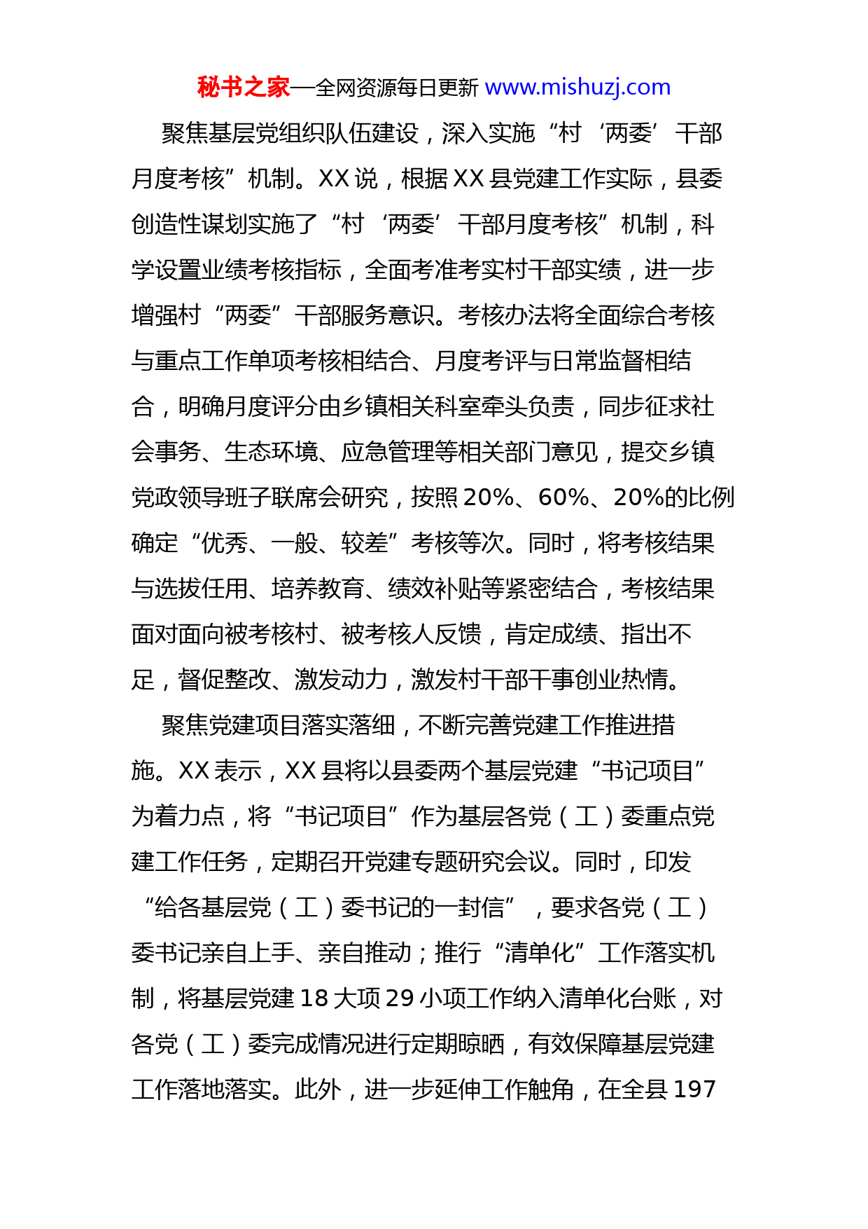 秘书之家—全网资源每日更新www.mishuzj.com坚持“三个聚焦”抓实党建项目强基固本促工作提升“基层党建‘书记项目’是XX市基层党建亮点工作。今年以来,XX县突出党建引领,强化党委书记抓党建工作主体责任,坚持‘三个聚焦’,抓实县委书记主抓的两个基层党建‘书记项目’,以党建提升引领全县各项工作同步提升。”日前,XX县委书记XX接受了本报记者的专访。聚焦基层治理中党员作用发挥,扎实推进“党员中心户联系群众制度”。XX表示,向市委认领党建“书记项目”后,XX县迅速展开工作,制发了《关于建立农村(社区)党员中心户联系群众制度的指导意见》,指导各乡镇建立“村(社区)党组织+党员中心户+群众户”格化组织体系,按照个人自荐、村党组织推荐、党员群众联荐的方式提出初步人选,经乡镇党委和纪检、政法等部门审查,村党组织召开党员大会研究并公示,报乡镇党委登记备案。截至目前,按照每村10-20户的标准,全县共确定了2818户党员中心户,统一配备了标志牌、工作记录本和党员中心户联系群众监督卡,并建立县、乡、村三级考核机制,一季一评议、半年一考核、年终一评比,充分发挥了党员中心户的示范作用。秘书之家—全网资源每日更新www.mishuzj.com聚焦基层党组织队伍建设,深入实施“村‘两委’干部月度考核”机制。XX说,根据XX县党建工作实际,县委创造性谋划实施了“村‘两委’干部月度考核”机制,科学设置业绩考核指标,全面考准考实村干部实绩,进一步增强村“两委”干部服务意识。考核办法将全面综合考核与重点工作单项考核相结合、月度考评与日常监督相结合,明确月度评分由乡镇相关科室牵头负责,同步征求社会事务、生态环境、应急管理等相关部门意见,提交乡镇党政领导班子联席会研究,按照20%、60%、20%的比例确定“优秀、一般、较差”考核等次。同时,将考核结果与选拔任用、培养教育、绩效补贴等紧密结合,考核结果面对面向被考核村、被考核人反馈,肯定成绩、指出不足,督促整改、激发动力,激发村干部干事创业热情。聚焦党建项目落实落细,不断完善党建工作推进措施。XX表示,XX县将以县委两个基层党建“书记项目”为着力点,将“书记项目”作为基层各党(工)委重点党建工作任务,定期召开党建专题研究会议。同时,印发“给各基层党(工)委书记的一封信”,要求各党(工)委书记亲自上手、亲自推动;推行“清单化”工作落实机制,将基层党建18大项29小项工作纳入清单化台账,对各党(工)委完成情况进行定期晾晒,有效保障基层党建工作落地落实。此外,进一步延伸工作触角,在全县197秘书之家—全网资源每日更新www.mishuzj.com个行政村推行村级党建“书记项目”责任制,参考集体经济、“一核三治”乡村治理体系等26个项目,每名村党组织书记认领或自主创新1至2项党建“书记项目”,推动党建工作走深走实。