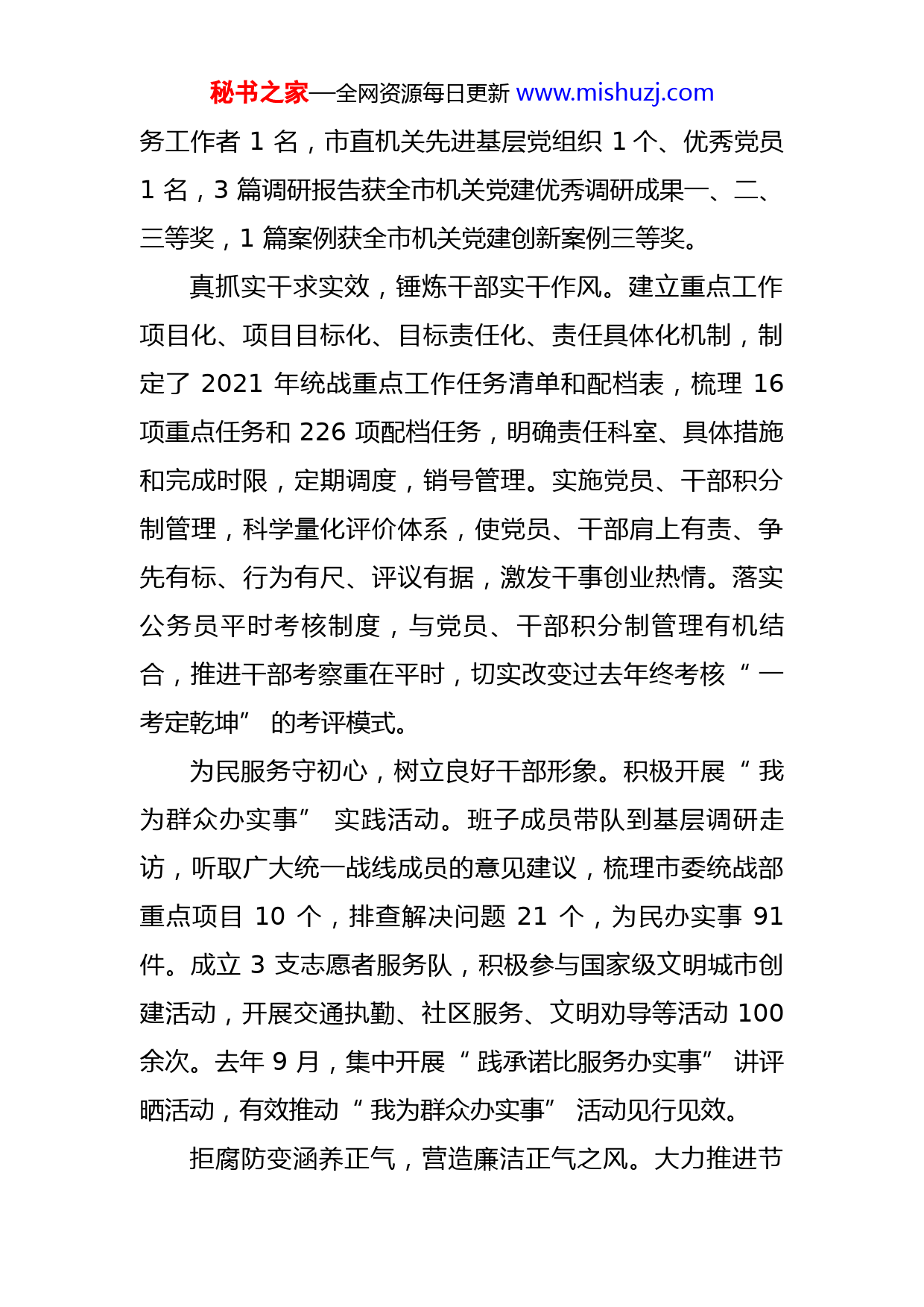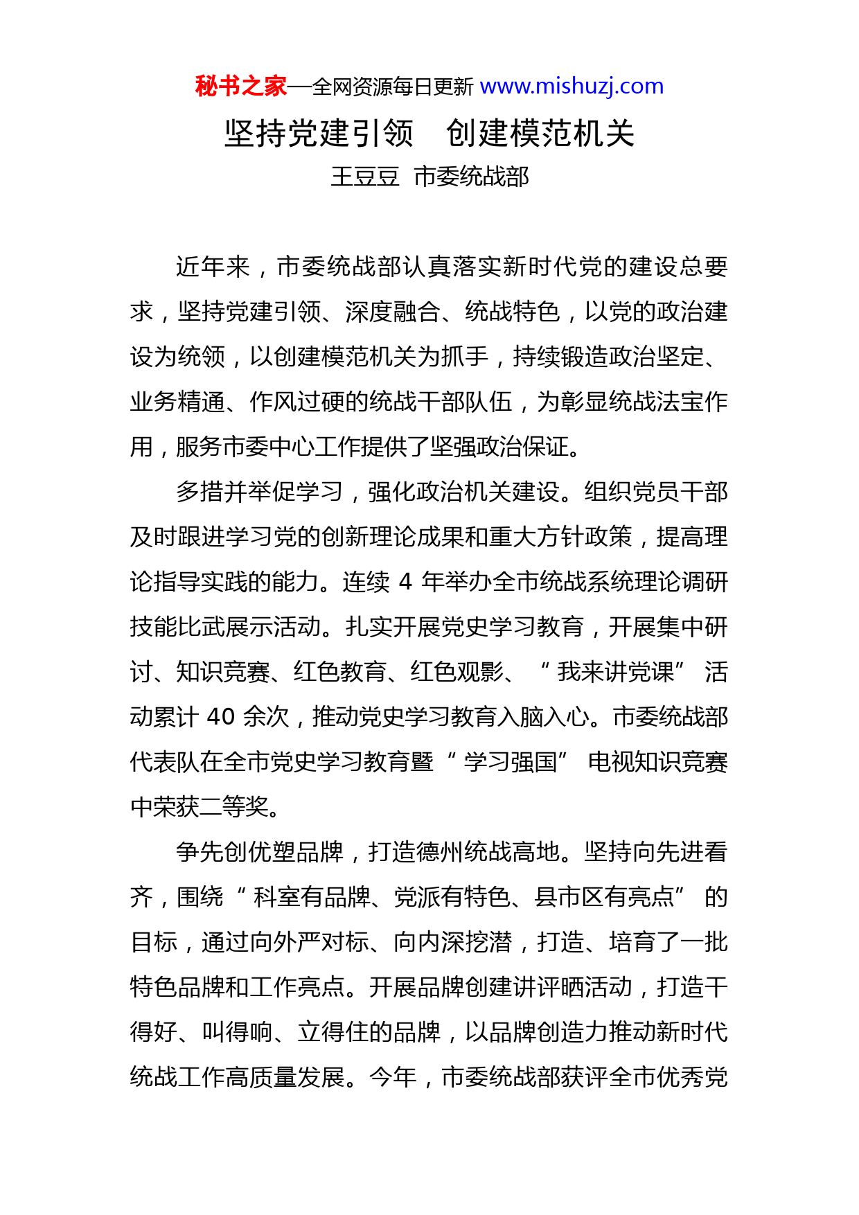 秘书之家—全网资源每日更新www.mishuzj.com坚持党建引领创建模范机关王豆豆市委统战部近年来,市委统战部认真落实新时代党的建设总要求,坚持党建引领、深度融合、统战特色,以党的政治建设为统领,以创建模范机关为抓手,持续锻造政治坚定、业务精通、作风过硬的统战干部队伍,为彰显统战法宝作用,服务市委中心工作提供了坚强政治保证。多措并举促学习,强化政治机关建设。组织党员干部及时跟进学习党的创新理论成果和重大方针政策,提高理论指导实践的能力。连续4年举办全市统战系统理论调研技能比武展示活动。扎实开展党史学习教育,开展集中研讨、知识竞赛、红色教育、红色观影、“我来讲党课”活动累计40余次,推动党史学习教育入脑入心。市委统战部代表队在全市党史学习教育暨“学习强国”电视知识竞赛中荣获二等奖。争先创优塑品牌,打造德州统战高地。坚持向先进看齐,围绕“科室有品牌、党派有特色、县市区有亮点”的目标,通过向外严对标、向内深挖潜,打造、培育了一批特色品牌和工作亮点。开展品牌创建讲评晒活动,打造干得好、叫得响、立得住的品牌,以品牌创造力推动新时代统战工作高质量发展。今年,市委统战部获评全市优秀党秘书之家—全网资源每日更新www.mishuzj.com务工作者1名,市直机关先进基层党组织1个、优秀党员1名,3篇调研报告获全市机关党建优秀调研成果一、二、三等奖,1篇案例获全市机关党建创新案例三等奖。真抓实干求实效,锤炼干部实干作风。建立重点工作项目化、项目目标化、目标责任化、责任具体化机制,制定了2021年统战重点工作任务清单和配档表,梳理16项重点任务和226项配档任务,明确责任科室、具体措施和完成时限,定期调度,销号管理。实施党员、干部积分制管理,科学量化评价体系,使党员、干部肩上有责、争先有标、行为有尺、评议有据,激发干事创业热情。落实公务员平时考核制度,与党员、干部积分制管理有机结合,推进干部考察重在平时,切实改变过去年终考核“一考定乾坤”的考评模式。为民服务守初心,树立良好干部形象。积极开展“我为群众办实事”实践活动。班子成员带队到基层调研走访,听取广大统一战线成员的意见建议,梳理市委统战部重点项目10个,排查解决问题21个,为民办实事91件。成立3支志愿者服务队,积极参与国家级文明城市创建活动,开展交通执勤、社区服务、文明劝导等活动100余次。去年9月,集中开展“践承诺比服务办实事”讲评晒活动,有效推动“我为群众办实事”活动见行见效。拒腐防变涵养正气,营造廉洁正气之风。大力推进节秘书之家—全网资源每日更新www.mishuzj.com约型机关建设,修订完善公车管理、公务接待、厉行节约、反对浪费等制度,堵住漏洞,划定红线。开展整治“庸懒散”专项学习研讨活动,深入查摆整改干部自身问题。开展廉政警示教育暨廉政专题党课活动,通过以案释纪、以案释法,不断增强党员干部廉洁自律意识,筑牢拒腐防变思想防线。