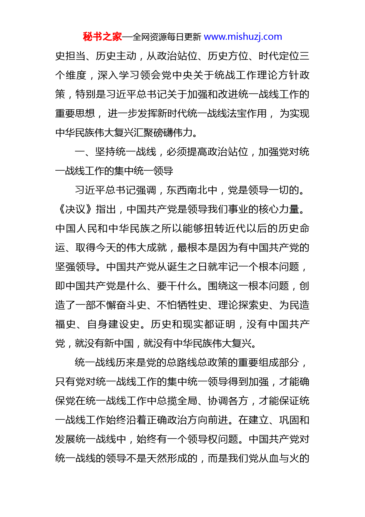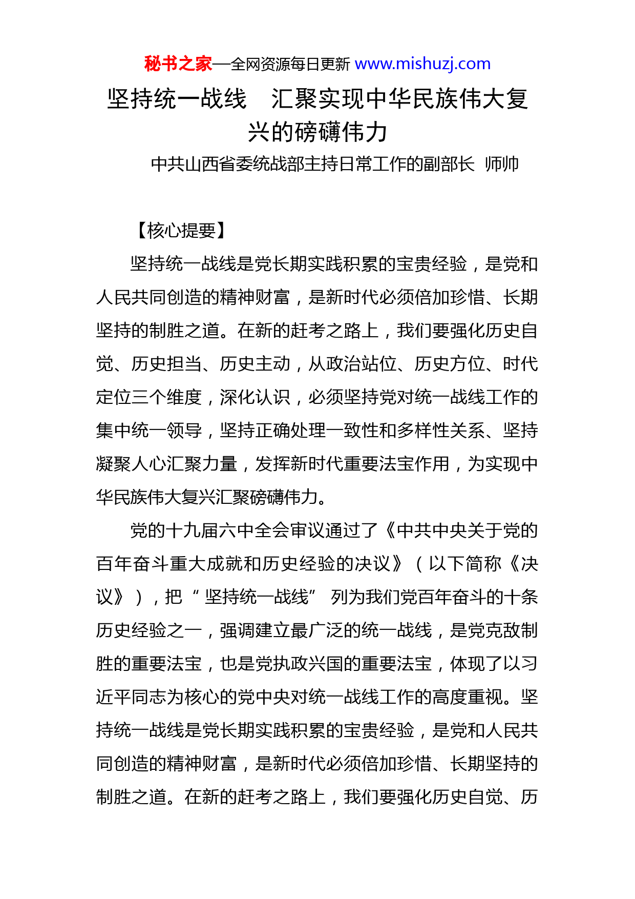 秘书之家—全网资源每日更新www.mishuzj.com坚持统一战线汇聚实现中华民族伟大复兴的磅礴伟力中共山西省委统战部主持日常工作的副部长师帅【核心提要】坚持统一战线是党长期实践积累的宝贵经验,是党和人民共同创造的精神财富,是新时代必须倍加珍惜、长期坚持的制胜之道。在新的赶考之路上,我们要强化历史自觉、历史担当、历史主动,从政治站位、历史方位、时代定位三个维度,深化认识,必须坚持党对统一战线工作的集中统一领导,坚持正确处理一致性和多样性关系、坚持凝聚人心汇聚力量,发挥新时代重要法宝作用,为实现中华民族伟大复兴汇聚磅礴伟力。党的十九届六中全会审议通过了《中共中央关于党的百年奋斗重大成就和历史经验的决议》(以下简称《决议》),把“坚持统一战线”列为我们党百年奋斗的十条历史经验之一,强调建立最广泛的统一战线,是党克敌制胜的重要法宝,也是党执政兴国的重要法宝,体现了以习近平同志为核心的党中央对统一战线工作的高度重视。坚持统一战线是党长期实践积累的宝贵经验,是党和人民共同创造的精神财富,是新时代必须倍加珍惜、长期坚持的制胜之道。在新的赶考之路上,我们要强化历史自觉、历秘书之家—全网资源每日更新www.mishuzj.com史担当、历史主动,从政治站位、历史方位、时代定位三个维度,深入学习领会党中央关于统战工作理论方针政策,特别是习近平总书记关于加强和改进统一战线工作的重要思想,进一步发挥新时代统一战线法宝作用,为实现中华民族伟大复兴汇聚磅礴伟力。一、坚持统一战线,必须提高政治站位,加强党对统一战线工作的集中统一领导习近平总书记强调,东西南北中,党是领导一切的。《决议》指出,中国共产党是领导我们事业的核心力量。中国人民和中华民族之所以能够扭转近代以后的历史命运、取得今天的伟大成就,最根本是因为有中国共产党的坚强领导。中国共产党从诞生之日就牢记一个根本问题,即中国共产党是什么、要干什么。围绕这一根本问题,创造了一部不懈奋斗史、不怕牺牲史、理论探索史、为民造福史、自身建设史。历史和现实都证明,没有中国共产党,就没有新中国,就没有中华民族伟大复兴。统一战线历来是党的总路线总政策的重要组成部分,只有党对统一战线工作的集中统一领导得到加强,才能确保党在统一战线工作中总揽全局、协调各方,才能保证统一战线工作始终沿着正确政治方向前进。在建立、巩固和发展统一战线中,始终有一个领导权问题。中国共产党对统一战线的领导不是天然形成的,而是我们党从血与火的秘书之家—全网资源每日更新www.mishuzj.com考验中得来的,从正反两方面经验中总结出来的,并通过艰苦工作和斗争实现的。在此过程中,广大统一战线成员逐渐加深了对中国共产党伟大、光荣、正确的深刻认同,建立起了为中国人民谋幸福、为中华民族谋复兴这一共同奋斗目标的政治认同和行动自觉。历史和现实都证明,什么时候党对统一战线的领导坚强有力,统战事业就蓬勃发展;反之,就遭受挫折甚至失败。在当代中国,中国共产党的领导是中国特色社会主义最本质的特征,是统一战线健康发展的根本保证。在新的赶考之路上,巩固壮大统一战线,根本还是要坚持中国共产党的领导。要加强思想政治引领,使党的政治主张转化为广大统战成员的思想自觉、政治自觉和行动自觉,不断增进统战成员对中国共产党的政治认同、思想认同、理论认同、情感认同,增强“四个意识”、坚定“四个自信”、做到“两个维护”。二、坚持统一战线,必须把牢历史方位,正确处理一致性和多样性关系习近平总书记指出,一百年来,中国共产党团结带领中国人民进行的一切奋斗、一切牺牲、一切创造,归结起来就是一个主题:实现中华民族伟大复兴。《决议》明确指出,党的百年奋斗每个历史阶段的主要任务都与实现民族复兴紧密相连,都为这一目标前赴后继、接续奋斗。当前,我们面临实现中华民族伟大复兴的战略全局和世界百秘书之家—全网资源每日更新www.mishuzj.com年未有之大变局,这是我们谋划工作的基本出发点。今天,我们比历史上任何时期都更接近、更有信心和能力实现这一目标。越是接近目标,越是形势复杂,越是任务艰巨,越要发挥统一战线的优势作用,把各方面智慧和力量凝聚起来,形成海内外中华儿女心往一处想、劲往一处使的强大合力。统一战线是一致性和多样性关系的矛盾统一体,有同无异,没有必要建立统一战线;有异无同,建立不起统一战线。做好新时代统战工作,必须正确处理一致性和多样性关系。关键是求同存异,求同是基础和前提,存异是难点和活力,两者必须同时发力、有机统一,增进一致而不强求一律、包容多样而不弱化主导。实践证明,在充分尊重多样性基础上,一致性程度越高,统一战线团结的基础越牢;在不断巩固一致性基础上,多样性范围越宽,统一战线团结的力量越多。增进一致性,就是要不断巩固共同的思想政治基础,最根本是要以坚持中国共产党的领导、坚持和发展中国特色社会主义、实现中华民族伟大复兴中国梦为引领。要深刻理解“两个确立”(党确立习近平同志党中央的核心、全党的核心地位,确立习近平新时代中国特色社会主义思想的指导地位),作为巩固共同思想政治基础的第一立场、第一