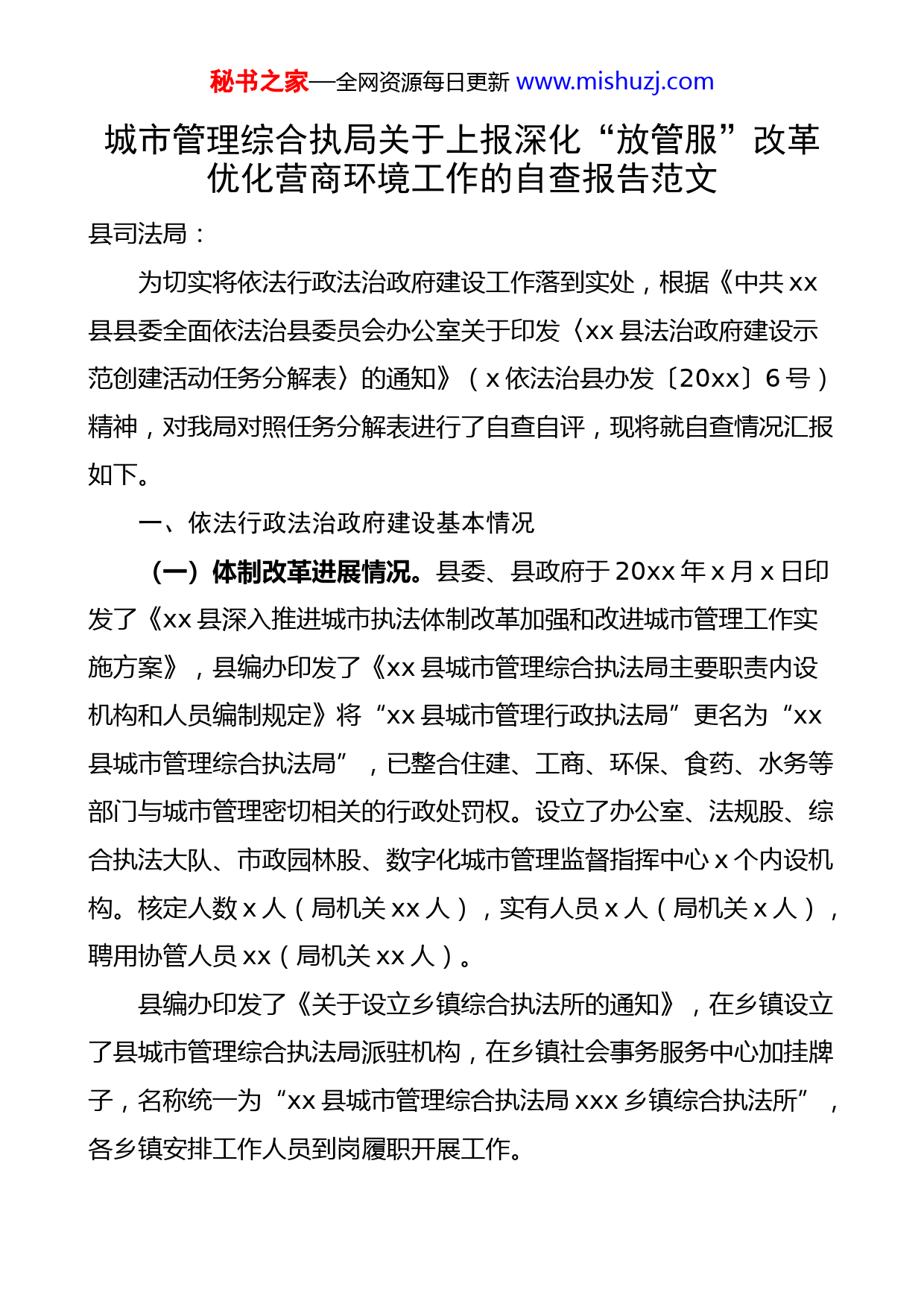 秘书之家—全网资源每日更新www.mishuzj.com城市管理综合执局关于上报深化“放管服”改革优化营商环境工作的自查报告范文县司法局:为切实将依法行政法治政府建设工作落到实处,根据《中共xx县县委全面依法治县委员会办公室关于印发〈xx县法治政府建设示范创建活动任务分解表〉的通知》(x依法治县办发〔20xx〕6号)精神,对我局对照任务分解表进行了自查自评,现将就自查情况汇报如下。一、依法行政法治政府建设基本情况(一)体制改革进展情况。县委、县政府于20xx年x月x日印发了《xx县深入推进城市执法体制改革加强和改进城市管理工作实施方案》,县编办印发了《xx县城市管理综合执法局主要职责内设机构和人员编制规定》将“xx县城市管理行政执法局”更名为“xx县城市管理综合执法局”,已整合住建、工商、环保、食药、水务等部门与城市管理密切相关的行政处罚权。设立了办公室、法规股、综合执法大队、市政园林股、数字化城市管理监督指挥中心x个内设机构。核定人数x人(局机关xx人),实有人员x人(局机关x人),聘用协管人员xx(局机关xx人)。县编办印发了《关于设立乡镇综合执法所的通知》,在乡镇设立了县城市管理综合执法局派驻机构,在乡镇社会事务服务中心加挂牌子,名称统一为“xx县城市管理综合执法局xxx乡镇综合执法所”,各乡镇安排工作人员到岗履职开展工作。秘书之家—全网资源每日更新www.mishuzj.com(二)权责事项划转情况。依据原有权责清单法律法规的修正和此次权责清单的划转,我局按照文件精神对权责清单进行全面的修正和清理。本次清理处城市管理工作中涉及的权责清单事项共xx项。其中:行政许可xx项(其中x项暂未划转移交),行政处罚xx项,行政强制4项,涉及法律法规、规章xx部。其中本次移交权责事项xx项,其中行政处罚xx项。(三)行政审批事项运行情况。20xx年x月行政执法体制改革以来,依照三定方案,我局涉及行政审批事项xx项,其中x项因涉及市政园林绿化,因职能未划转,行政审批事项暂由建设局实施。承担行政审批事项x项,分别为城市建筑物、设施上张挂、张贴宣传品审批、街道两侧和公共场地堆放物料,搭建建(构)筑物或者其他设施的审批。20xx年x月,各级省级权责事项认领,2项行政审批事项分别更名为设置大型户外广告以及城市建筑物、设施上悬挂、张贴宣传品审批和临时性建筑物搭建、堆放物料、占道施工的审批。20xx年“放管服”工作开展以来,我局按照工作要求,制定了办事指南,规范办理流程,简化了办理要件、压缩了办结时限,委托政务服务中心进行办理,达到全程网办和“最多跑一次”的目标要求。20xx年行政审批事项x项(临时性建筑物搭建、堆放物料、占道施工的审批),20xx年x项(临时性建筑物搭建、堆放物料、占道施工的审批)。(四)强化法制学习和培训。一是抓好宪法的学习,集中党员干部职工对新修订的《宪法》进行了全面系统的学习,组织《宪法》知识测试,进一步提高全局干部职工的宪法意识。二是结合城管体制改秘书之家—全网资源每日更新www.mishuzj.com革,对权责事项移交的x项权责事项以及所涉及的x部法律法规制定学习计划,采取集中学与自学相结合,法制理论与法律条文相结合的方法进行学习,为推进“七五”普法工作的开展,提高全局整体执法的水平,提供了法治保障。三是结合城管体制改革对对城市管理行政执法依据、法律文书的规范制作,城市管理行政执法行为规范、以及“三项制度”进行了培训,进一步规范行政执法,提高了干部职工的依法行政能力。(五)规范依法行政开展情况。一是注重执法公开。即行政执法人员通过出示证明自己身份的证件,使当事人了解身份;告知当事人所享有的权利,被处罚的事实、理由和依据;充分听取当事人的陈述、申辩和对相关证据进行详细的质问,使处罚决定建立在合法、公正的基础上。二是注重程序合法。在处理事实的过程中严格遵守《行政处罚法》规定的程序执行,特别是一般程序,即立案、调查取证、决定、送达、执行,并依法制作规范的执法文书文本。三是注重证据的真实性及完备性。在执法人员调查取证的过程中,做到证据的真实性和完备性,适用法律合理。做到亮证执法、秉公执法、文明执法、依法执法,准确执法。四是注重在执法过程中严格推行执法全过程记录。五是案卷管理规范,各类执法案卷档案按照统一格式制作,制作规范,一案一档,整理归档及时,案卷装订整齐。(六)强化“三项制度”落实。制定了《全面推行行政执法公示制度执法全过程记录制度重大执法决定法制审核制度实施方案》和《重大执法决定法制审核制度、行政执法全过程记录规定等9项制度》,严格推行落实“三项制度”。20xx年共审核重大行政执法决秘书之家—全网资源每日更新www.mishuzj.com定法制审核实案件xx起(其中:局机关x起,大靖分局x起,移民区分局x起),20xx年共审核重大行政执法决定法制审核实案件xx起,案件包括行政处罚和违法建筑强制拆除。推进法律顾问参与行政执法工作机制,落实“律师驻队”工作,聘请甘肃万帮律师事务所律师担任法律顾问,参与城市管理行政执法工作,发挥法律顾问在法制审核工作中的作用。(七)法制宣传工作开展情况。开展了主题宣传活动,将法律宣传与群众受益相结合,推进了城市管理工作。结合“3.15”、“6.5”“