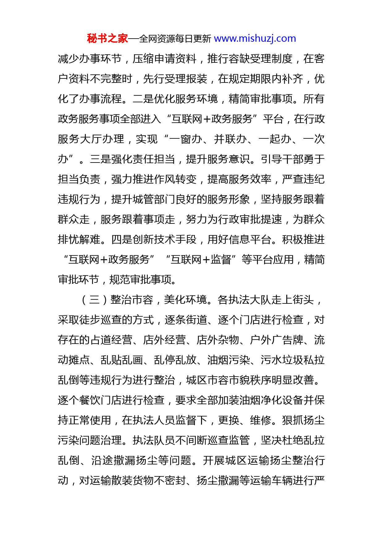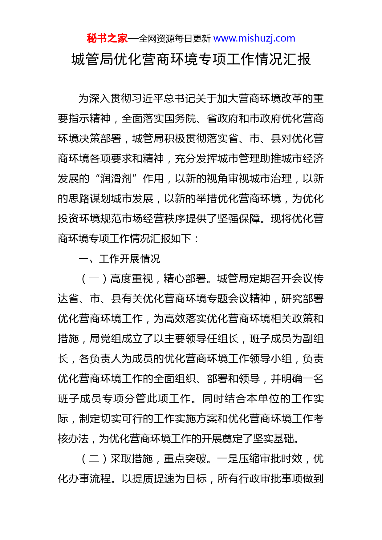 秘书之家—全网资源每日更新www.mishuzj.com城管局优化营商环境专项工作情况汇报为深入贯彻习近平总书记关于加大营商环境改革的重要指示精神,全面落实国务院、省政府和市政府优化营商环境决策部署,城管局积极贯彻落实省、市、县对优化营商环境各项要求和精神,充分发挥城市管理助推城市经济发展的“润滑剂”作用,以新的视角审视城市治理,以新的思路谋划城市发展,以新的举措优化营商环境,为优化投资环境规范市场经营秩序提供了坚强保障。现将优化营商环境专项工作情况汇报如下:一、工作开展情况(一)高度重视,精心部署。城管局定期召开会议传达省、市、县有关优化营商环境专题会议精神,研究部署优化营商环境工作,为高效落实优化营商环境相关政策和措施,局党组成立了以主要领导任组长,班子成员为副组长,各负责人为成员的优化营商环境工作领导小组,负责优化营商环境工作的全面组织、部署和领导,并明确一名班子成员专项分管此项工作。同时结合本单位的工作实际,制定切实可行的工作实施方案和优化营商环境工作考核办法,为优化营商环境工作的开展奠定了坚实基础。(二)采取措施,重点突破。一是压缩审批时效,优化办事流程。以提质提速为目标,所有行政审批事项做到秘书之家—全网资源每日更新www.mishuzj.com减少办事环节,压缩申请资料,推行容缺受理制度,在客户资料不完整时,先行受理报装,在规定期限内补齐,优化了办事流程。二是优化服务环境,精简审批事项。所有政务服务事项全部进入“互联网+政务服务”平台,在行政服务大厅办理,实现“一窗办、并联办、一起办、一次办”。三是强化责任担当,提升服务意识。引导干部勇于担当负责,强力推进作风转变,提高服务效率,严查违纪违规行为,提升城管部门良好的服务形象,坚持服务跟着群众走,服务跟着事项走,努力为行政审批提速,为群众排忧解难。四是创新技术手段,用好信息平台。积极推进“互联网+政务服务”“互联网+监督”等平台应用,精简审批环节,规范审批事项。(三)整治市容,美化环境。各执法大队走上街头,采取徒步巡查的方式,逐条街道、逐个门店进行检查,对存在的占道经营、店外经营、店外杂物、户外广告牌、流动摊点、乱贴乱画、乱停乱放、油烟污染、污水垃圾私拉乱倒等违规行为进行整治,城区市容市貌秩序明显改善。逐个餐饮门店进行检查,要求全部加装油烟净化设备并保持正常使用,在执法人员监督下,更换、维修。狠抓扬尘污染问题治理。执法队员不间断巡查监管,坚决杜绝乱拉乱倒、沿途撒漏扬尘等问题。开展城区运输扬尘整治行动,对运输散装货物不密封、扬尘撒漏等运输车辆进行严秘书之家—全网资源每日更新www.mishuzj.com查,维护良好的空气质量,多措并举打造宜居宜业的生活环境。(四)文明执法,营造氛围。一是规范执法行为,城管执法人员在工作中严格遵守《城管执法人员行为规范》,切实推动“一敬礼、二亮证、三宣传、四教育、五处罚”的标准化执法程序落实到执法工作中,做到执法与服务相结合,营造和谐的营商环境和文明的城市氛围。二是坚持执法过程全记录制度。制定了关于全面推进行政执法公示制度、执法全过程记录制度、重大执法决定法制审核制度实施方案,要求执法人员在执法过程中做到文字记录完善、音像记录规范、记录实效强化;三是加强执法培训。采取骨干培训、分级培训等多种形式的培训方式,邀请市县法制室等专业法律人员进行授课,班子成员轮流授课,讲解法律知识;每月不少于4次培训,每年开展1次军事化训练,增强城管执法队伍的凝聚力和组织纪律性,坚持做到文明执法,提升城市质量,营造良好的营商氛围。(五)建立回访机制。为更好地监督服务企业的质量,对企业建立回访服务机制,由优化营商环境办公室联合局督查室定期对企业服务情况进行回访,发现存在有损企业发展行为的问题,及时通报,限期改正,从而促进服务水平提升,提高企业满意度。秘书之家—全网资源每日更新www.mishuzj.com(六)优化处罚事项清单。根据《汝南法治政府建设领导小组办公室关于制定轻微违法行为不予行政处罚和一般违法行为从轻减轻行政处罚事项目录清单的通知》要求,为营造法治化的营商环境,激发市场活力和创造力,县城管局制定了5项不予处罚事项、1项从轻处罚事项、1项减轻处罚事项。二、存在的问题一是对优化营商环境的重要性认识不足,领导机构不健全,责任落实不到位;二是领导班子决策时,有时只局限于完成全局中心工作,对一些城市管理领域优化环境、服务发展方面的难点、焦点问题的部署考虑还不够精准;三是店外经营、乱摆乱卖、乱泼乱倒、乱贴乱画等城市“八乱”问题屡禁不止,严重影响着发展环境的进一步优化和提升;四是“721”工作法执行还不够彻底,存在重处罚轻服务、以罚代管情况,未能全面落实好以人为本、和谐执法的城管惠企为民服务宗旨;五是宣传还不到位,广大经营者对城市管理方面的法律法规了解还不够全面,违规经营的现象时有发生。三、改进措施(一)改进作风,强化服务意识。深入学习改善营商环境服务经济发展相关精神,让全体干部职工深刻领会提高服务水平、打造优质环境的重要性和必要性。切实增强秘书之家—全网资源每日更新www.mishuzj.com城管系统干部职工的责任
