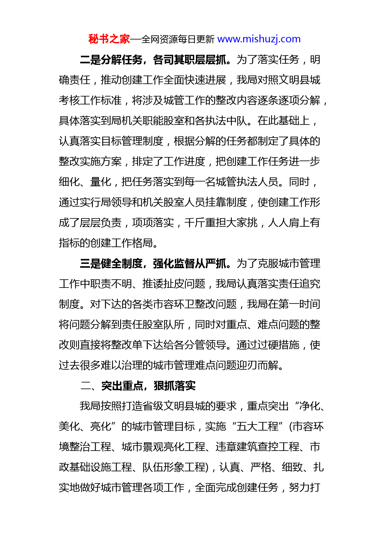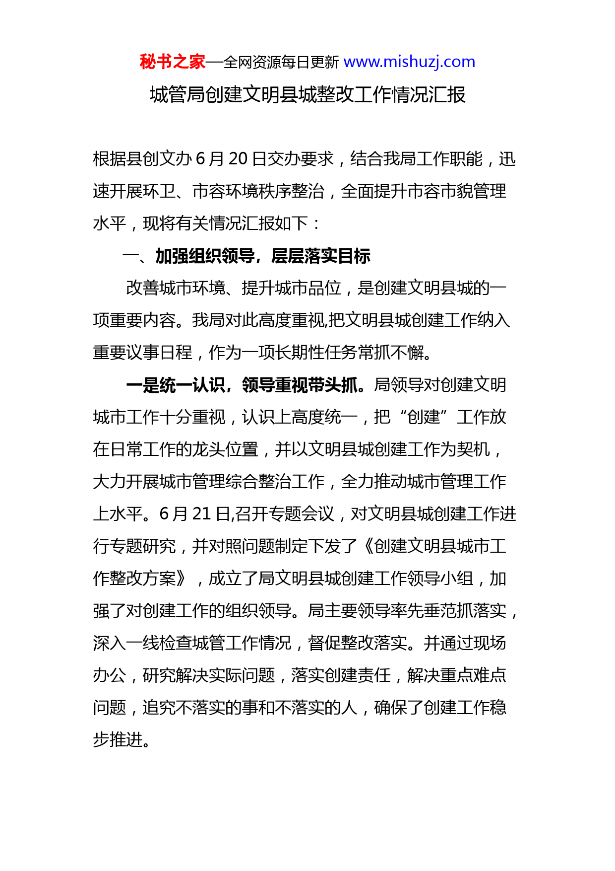 秘书之家—全网资源每日更新www.mishuzj.com城管局创建文明县城整改工作情况汇报根据县创文办6月20日交办要求,结合我局工作职能,迅速开展环卫、市容环境秩序整治,全面提升市容市貌管理水平,现将有关情况汇报如下:一、加强组织领导,层层落实目标改善城市环境、提升城市品位,是创建文明县城的一项重要内容。我局对此高度重视,把文明县城创建工作纳入重要议事日程,作为一项长期性任务常抓不懈。一是统一认识,领导重视带头抓。局领导对创建文明城市工作十分重视,认识上高度统一,把“创建”工作放在日常工作的龙头位置,并以文明县城创建工作为契机,大力开展城市管理综合整治工作,全力推动城市管理工作上水平。6月21日,召开专题会议,对文明县城创建工作进行专题研究,并对照问题制定下发了《创建文明县城市工作整改方案》,成立了局文明县城创建工作领导小组,加强了对创建工作的组织领导。局主要领导率先垂范抓落实,深入一线检查城管工作情况,督促整改落实。并通过现场办公,研究解决实际问题,落实创建责任,解决重点难点问题,追究不落实的事和不落实的人,确保了创建工作稳步推进。秘书之家—全网资源每日更新www.mishuzj.com二是分解任务,各司其职层层抓。为了落实任务,明确责任,推动创建工作全面快速进展,我局对照文明县城考核工作标准,将涉及城管工作的整改内容逐条逐项分解,具体落实到局机关职能股室和各执法中队。在此基础上,认真落实目标管理制度,根据分解的任务都制定了具体的整改实施方案,排定了工作进度,把创建工作任务进一步细化、量化,把任务落实到每一名城管执法人员。同时,通过实行局领导和机关股室人员挂靠制度,使创建工作形成了层层负责,项项落实,千斤重担大家挑,人人肩上有指标的创建工作格局。三是健全制度,强化监督从严抓。为了克服城市管理工作中职责不明、推诿扯皮问题,我局认真落实责任追究制度。对下达的各类市容环卫整改问题,我局在第一时间将问题分解到责任股室队所,同时对重点、难点问题的整改则直接将整改单下达给各分管领导。通过过硬措施,使过去很多难以治理的城市管理难点问题迎刃而解。二、突出重点,狠抓落实我局按照打造省级文明县城的要求,重点突出“净化、美化、亮化”的城市管理目标,实施“五大工程”(市容环境整治工程、城市景观亮化工程、违章建筑查控工程、市政基础设施工程、队伍形象工程),认真、严格、细致、扎实地做好城市管理各项工作,全面完成创建任务,努力打秘书之家—全网资源每日更新www.mishuzj.com造基础更完备、功能更完善、设施更齐全、环境更整洁、居住更舒适、生活更方便、秩序更井然、管理更科学的城市新形象。(一)针对永明路、永阳路、永回路、幸福路等县城主要街道24字核心价值观、“讲文明树新风”等公益广告、“道德守礼”提示牌较少的情况,我局已贵办协商一致,由贵办统一安排。(二)城区违规停车、摊点占道从7月28日起,我局与交警、交通联合整治,已大为改观。(三)城区绿化带、行道树下烟头等垃圾、乱贴“牛皮癣”已安排保洁公司进行清理,已大为改观。并安排了文明劝导者对市民损坏公物不文明行为进行劝导。(四)永明路1、国税局至烟草公司路段未设置盲道,五一桥两边人行道未设置无障碍通道设施,应由住建局负责,我局已与之协调。人行道板损坏正在抓紧修复。2、县委大门至国税局路段晚上夜宵摊点占道已整治,杂物堆放已安排清除。3、新街路口公交站牌破损已安排修复。4、一小路口、千家峒路作废出租车位应由交通、交警负责,我局已与之协调。(五)幸福路秘书之家—全网资源每日更新www.mishuzj.com1、龙渤湾小区路段人行道盲道占用现象已制止,已设置缘石坡道。2、幸福桥至一中路段设置缘石坡道由指挥部负责实施,我局未参与。3、实验小学路段下水道盖板已修复。(六)陈家街粮食局侧门路面已填补修平。(七)凤亭路路面已填补修平。(八)三元宫三角地带路面已填补修平。(九)凤凰广场杂乱堆放游乐设施已规范,摊点要求合法有序经营承,垃圾安排保洁定期清扫。游道路灯、桌凳已安排人进行修复。(十)其他街巷:我局已安排保洁公司加大保洁力度。(十一)住宅小区由房产局负责,我局已与之协调。三、下步打算:1、树立全局观念,全力做好城市管理局所涉及到的职责范围内的整改。2、树立全县一盘棋,全面落实整改。我局作为承担创省文任务的主要部门,规定凡是检查中出现问题的,追究秘书之家—全网资源每日更新www.mishuzj.com直接责任人及分管领导的责任。确保全县环境卫生的整洁有序,创建文明县城工作成功。