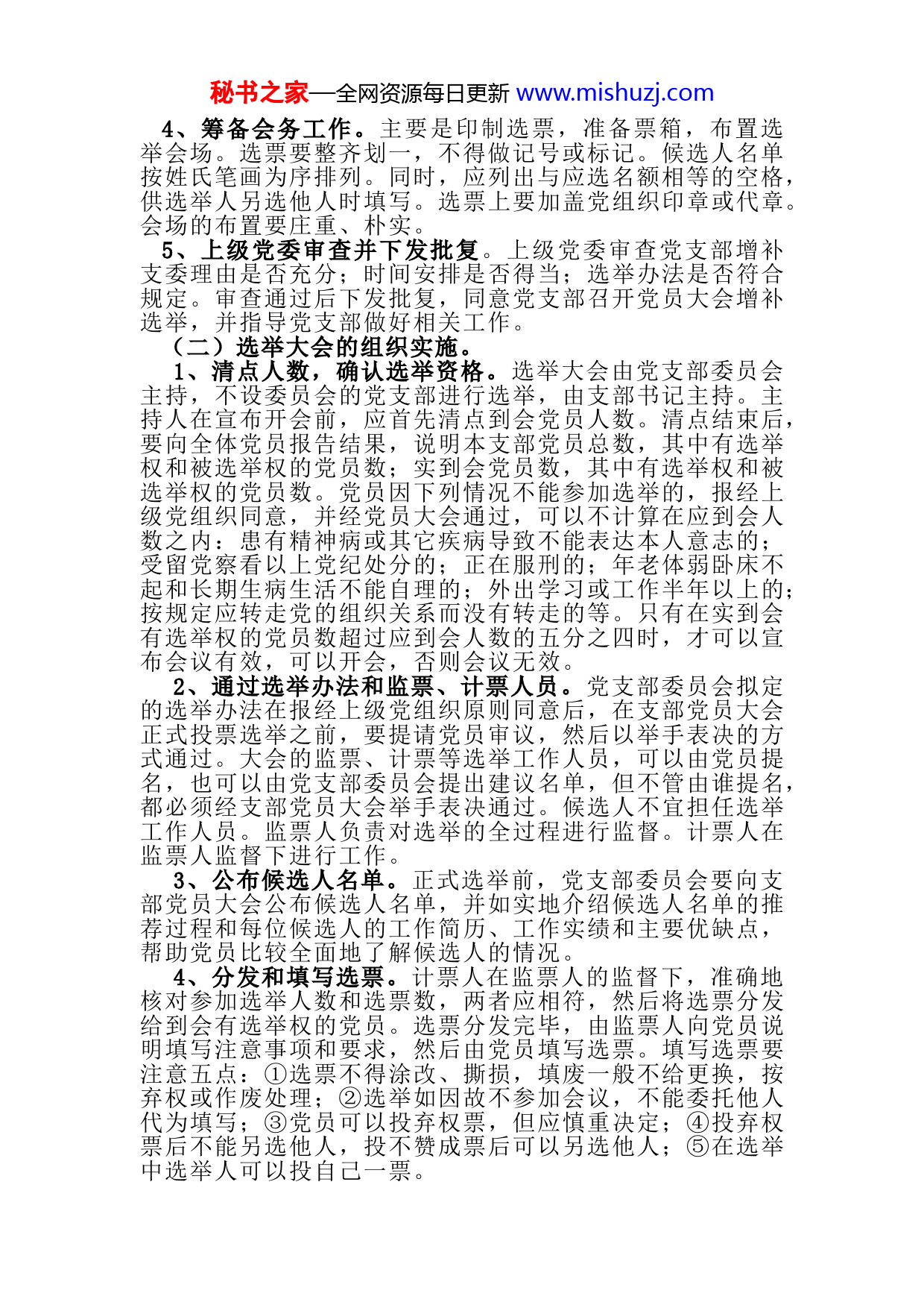 秘书之家—全网资源每日更新www.mishuzj.com增补选党支部委员的实施条件、主要程序、注意事项目录增补选党支部委员的实施条件、主要程序、注意事项1.关于×××党支部补选支部委员的请示2.关于×××党支部委员补选候选人预备人选的请示3.增补×××党支部委员的选举办法(草案)4.×××党支部委员增补选举会议主持词5.关于×××党支部委员补选结果的报告增补选党支部委员的实施条件、主要程序、注意事项一、增补选党支部委员的条件增补选党支部委员,一般是换届改选后的支部委员会,由于委员工作变动或其他原因出现缺额,影响了党支部工作的正常开展。此时,要召开支部党员大会进行增补选。增补选党支部委员是在原党支部成员的基础上进行的增补。有下列情况之一者,均应视为缺额,应予增补选:1、党支部委员因故调离,或本人辞职;2、党支部委员离休、退休或患严重疾病不能履行职务的;3、党支部委员受到撤销党内职务以上处分的;4、党支部书记或副书记因故调离,而本届党支部委员会任期未满,在这种情况下,上级党组织可以根据工作需要,任命新的书记或副书记。二、增补选党支部委员的主要程序(一)补选前准备工作1、呈报补选请示。党支部委员会增补选支委应征得上级党委的同意。党支部如果出现缺额情况应及时向上级党组织报告,提出增补选意见,待上级党组织同意后,才能召开支部党员大会进行增补选。党支部要将本届支部委员会换届选举的时间;本次增补支委选举的理由;增补选举时间大致安排;增补支部委员的名单;酝酿候选人的方法及选举办法书面向上级党委报告(向上级党委呈报《关于×××党支部补选支部委员的请示》参考文书附后)。2、进行选举教育。党支部要通过组织生活和必要的会议,对党员进行四个方面的教育:一是党的民主集中制的教育;二是开好支部大会指导思想的教育;三是干部政策和干部标准的教育;四是正确行使民主权利的教育。3、酝酿确定候选人。上级党组织对支部请示的内容同意后,支部委员会即可组织全体党员推荐、酝酿,并根据多数党员的意见确定补选候选人预备人选,然后将预备人选名单及有关材料报上级党组织审查(向上级党委呈报《关于×××党支部委员补选候选人预备人选的请示》参考文书附后)。秘书之家—全网资源每日更新www.mishuzj.com4、筹备会务工作。主要是印制选票,准备票箱,布置选举会场。选票要整齐划一,不得做记号或标记。候选人名单按姓氏笔画为序排列。同时,应列出与应选名额相等的空格,供选举人另选他人时填写。选票上要加盖党组织印章或代章。会场的布置要庄重、朴实。5、上级党委审查并下发批复。上级党委审查党支部增补支委理由是否充分;时间安排是否得当;选举办法是否符合规定。审查通过后下发批复,同意党支部召开党员大会增补选举,并指导党支部做好相关工作。(二)选举大会的组织实施。1、清点人数,确认选举资格。选举大会由党支部委员会主持,不设委员会的党支部进行选举,由支部书记主持。主持人在宣布开会前,应首先清点到会党员人数。清点结束后,要向全体党员报告结果,说明本支部党员总数,其中有选举权和被选举权的党员数;实到会党员数,其中有选举权和被选举权的党员数。党员因下列情况不能参加选举的,报经上级党组织同意,并经党员大会通过,可以不计算在应到会人数之内:患有精神病或其它疾病导致不能表达本人意志的;受留党察看以上党纪处分的;正在服刑的;年老体弱卧床不起和长期生病生活不能自理的;外出学习或工作半年以上的;按规定应转走党的组织关系而没有转走的等。只有在实到会有选举权的党员数超过应到会人数的五分之四时,才可以宣布会议有效,可以开会,否则会议无效。2、通过选举办法和监票、计票人员。党支部委员会拟定的选举办法在报经上级党组织原则同意后,在支部党员大会正式投票选举之前,要提请党员审议,然后以举手表决的方式通过。大会的监票、计票等选举工作人员,可以由党员提名,也可以由党支部委员会提出建议名单,但不管由谁提名,都必须经支部党员大会举手表决通过。候选人不宜担任选举工作人员。监票人负责对选举的全过程进行监督。计票人在监票人监督下进行工作。3、公布候选人名单。正式选举前,党支部委员会要向支部党员大会公布候选人名单,并如实地介绍候选人名单的推荐过程和每位候选人的工作简历、工作实绩和主要优缺点,帮助党员比较全面地了解候选人的情况。4、分发和填写选票。计票人在监票人的监督下,准确地核对参加选举人数和选票数,两者应相符,然后将选票分发给到会有选举权的党员。选票分发完毕,由监票人向党员说明填写注意事项和要求,然后由党员填写选票。填写选票要注意五点:①选票不得涂改、撕损,填废一般不给更换,按弃权或作废处理;②选举如因故不参加会议,不能委托他人代为填写;③党员可以投弃权票,但应慎重决定;④投弃权票后不能另选他人,投不赞成票后可以另选他人;⑤在选举中选举人可以投自己一票。秘书之家—全网资源每日更新www.mishuzj.com5、组织党员投票。投票前,票箱要当众由选举工作人员检查,确认无误后当众封箱。投票顺序是先由选举工作人员投票,然后党员逐个投票。不设票箱的可由监票人逐一收回选票。投票结束后,监票人
