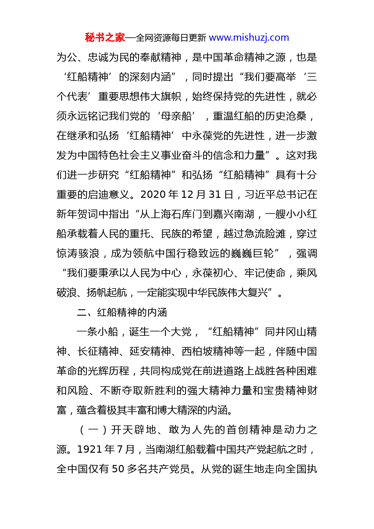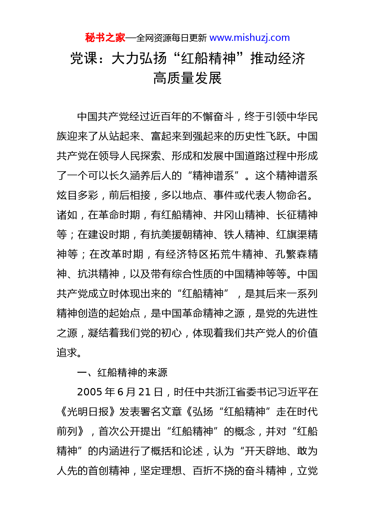 秘书之家—全网资源每日更新www.mishuzj.com党课:大力弘扬“红船精神”推动经济高质量发展中国共产党经过近百年的不懈奋斗,终于引领中华民族迎来了从站起来、富起来到强起来的历史性飞跃。中国共产党在领导人民探索、形成和发展中国道路过程中形成了一个可以长久涵养后人的“精神谱系”。这个精神谱系炫目多彩,前后相接,多以地点、事件或代表人物命名。诸如,在革命时期,有红船精神、井冈山精神、长征精神等;在建设时期,有抗美援朝精神、铁人精神、红旗渠精神等;在改革时期,有经济特区拓荒牛精神、孔繁森精神、抗洪精神,以及带有综合性质的中国精神等等。中国共产党成立时体现出来的“红船精神”,是其后来一系列精神创造的起始点,是中国革命精神之源,是党的先进性之源,凝结着我们党的初心,体现着我们共产党人的价值追求。一、红船精神的来源2005年6月21日,时任中共浙江省委书记习近平在《光明日报》发表署名文章《弘扬“红船精神”走在时代前列》,首次公开提出“红船精神”的概念,并对“红船精神”的内涵进行了概括和论述,认为“开天辟地、敢为人先的首创精神,坚定理想、百折不挠的奋斗精神,立党秘书之家—全网资源每日更新www.mishuzj.com为公、忠诚为民的奉献精神,是中国革命精神之源,也是‘红船精神’的深刻内涵”,同时提出“我们要高举‘三个代表’重要思想伟大旗帜,始终保持党的先进性,就必须永远铭记我们党的‘母亲船’,重温红船的历史沧桑,在继承和弘扬‘红船精神’中永葆党的先进性,进一步激发为中国特色社会主义事业奋斗的信念和力量”。这对我们进一步研究“红船精神”和弘扬“红船精神”具有十分重要的启迪意义。2020年12月31日,习近平总书记在新年贺词中指出“从上海石库门到嘉兴南湖,一艘小小红船承载着人民的重托、民族的希望,越过急流险滩,穿过惊涛骇浪,成为领航中国行稳致远的巍巍巨轮”,强调“我们要秉承以人民为中心,永葆初心、牢记使命,乘风破浪、扬帆起航,一定能实现中华民族伟大复兴”。二、红船精神的内涵一条小船,诞生一个大党,“红船精神”同井冈山精神、长征精神、延安精神、西柏坡精神等一起,伴随中国革命的光辉历程,共同构成党在前进道路上战胜各种困难和风险、不断夺取新胜利的强大精神力量和宝贵精神财富,蕴含着极其丰富和博大精深的内涵。(一)开天辟地、敢为人先的首创精神是动力之源。1921年7月,当南湖红船载着中国共产党起航之时,全中国仅有50多名共产党员。从党的诞生地走向全国执秘书之家—全网资源每日更新www.mishuzj.com政,由一个领导人民为夺取政权而奋斗的党成为掌握政权并长期执政的党,近百年来一代又一代共产党人以“开天辟地、敢为人先”的胆魄和情怀,把马克思列宁主义基本原理与中国革命实际相结合,不断探索创新,将首创精神贯穿中国革命、建设和改革的伟大历程。当前,世界百年未有之大变局正加速演变,只有不断发扬首创精神,实事求是、与时俱进,才能使党始终走在时代前列、永葆青春活力。(二)坚定理想、百折不挠的奋斗精神是胜利之本。奋斗精神是中国共产党人的支柱,在漫长的革命、建设、改革的历史岁月中,我们党正是凭借着这种与生俱来的奋斗精神,一次又一次战胜困难,团结带领全国各族人民不断从胜利走向胜利,走出一条中国特色社会主义道路,迎来了从站起来、富起来到强起来的历史性飞跃。当前,站在“两个一百年”奋斗目标的历史交汇点,只有不断发扬奋斗精神,坚定理想信念,不畏艰辛、顽强拼搏,才能克服重重困难和障碍、应对层层风险和挑战,最终胜利驶向光辉彼岸。(三)立党为公、忠诚为民的奉献精神是行动之基。党在革命、建设、改革的伟大实践中,始终践行全心全意为人民服务的宗旨,坚持“从群众中来,到群众中去”,与人民群众建立起了亲密无间的血肉关系、鱼水关系,不秘书之家—全网资源每日更新www.mishuzj.com断从人民群众中汲取智慧和力量,取得了改革、发展、稳定的伟大历史性成就。要实现人民对美好生活的向往,只有不断发扬奉献精神,坚持立党为公、执政为民,实现好、维护好和发展好最广大人民群众的根本利益,才能不断厚植党的执政基础。三、弘扬红船精神推动XX高质量发展当前,XXX面临十分难得的发展机遇:一是政策机遇叠加,面临XXX建设、新一轮东西部协作等重大战略交汇叠加,乘势而上就能抢占先机;二是区位优势凸显,地处XXX结合处,坐拥XXX江和XX黄金水道,随着XXX铁路和XX高铁规划实施,XXX在XXX经济圈中的区位优势将更加凸显;三是产业快速增长,XX作为XXX重要组团,经济承载力和要素集聚力将大幅提升,XXX产业将显现出快速增长的趋势。但同时,前进道路上还面临不少困难挑战:XX支柱性产业还未形成,经济总量低;全域路网特别是XXX经济带路网尚未畅通,城镇基础设施和公共服务设施仍然滞后;作为XXX重要生态屏障,XXX环保容量与经济发展统筹兼顾存在瓶颈,经济高质量发展面临较大压力。面对改革发展重任,我们还有许多“雪山”“草地”需要跨越,还有许多“娄山关”“腊子口”需要征服,XXX要抢抓XXX机遇,学习XXX先进经验,大力弘扬“红船精神”,主动求变,主动进取,全力推动高质量秘书之家—全网资源每日更新www.mishuzj.com发展,努力走出一条欠发达地区转型发展之路