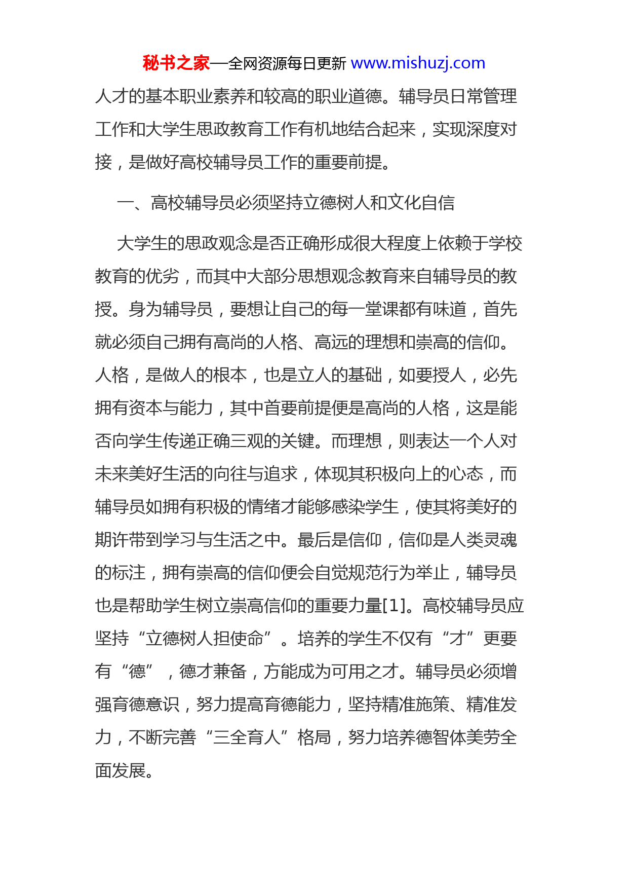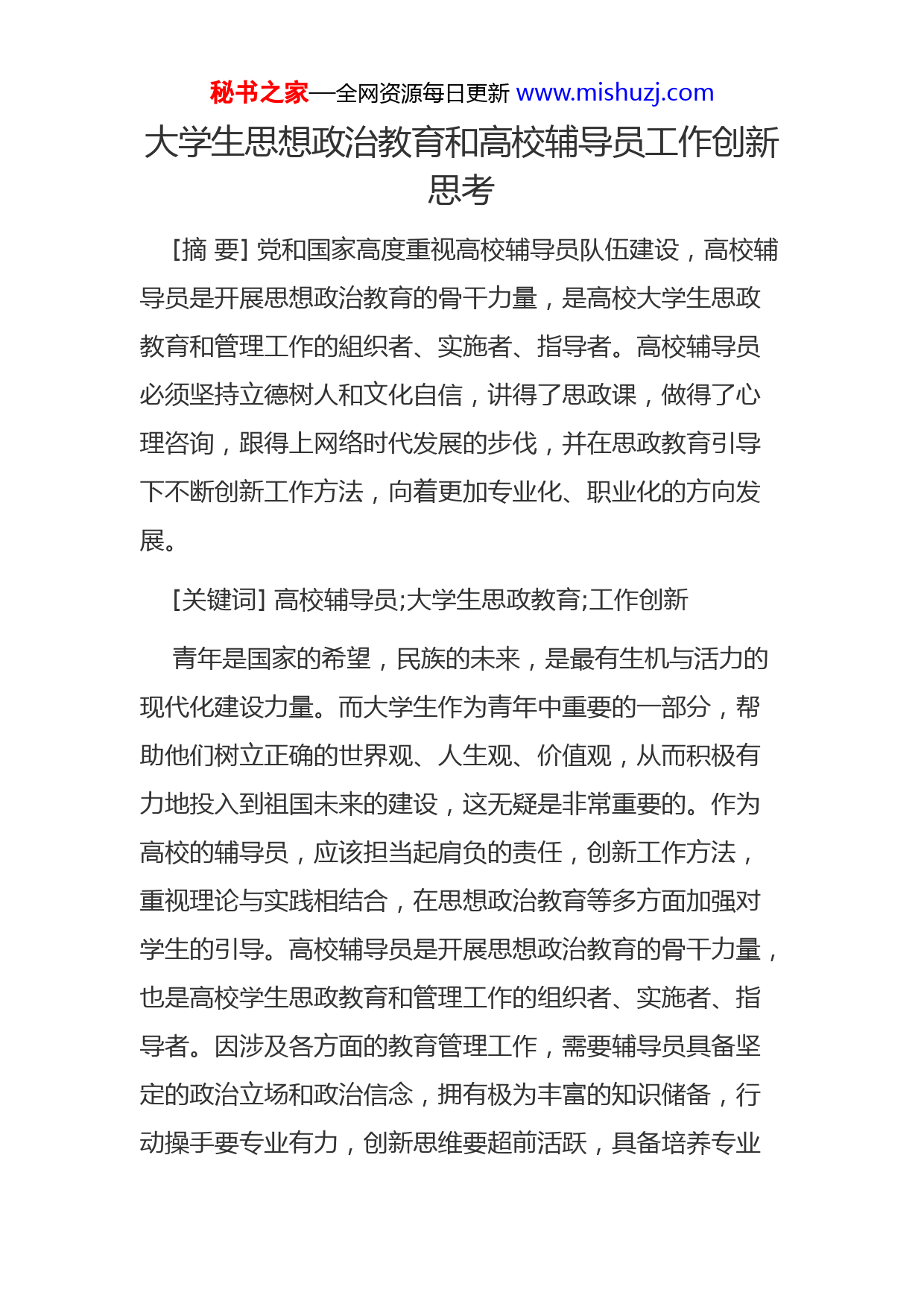 秘书之家—全网资源每日更新www.mishuzj.com大学生思想政治教育和高校辅导员工作创新思考[摘要]党和国家高度重视高校辅导员队伍建设,高校辅导员是开展思想政治教育的骨干力量,是高校大学生思政教育和管理工作的組织者、实施者、指导者。高校辅导员必须坚持立德树人和文化自信,讲得了思政课,做得了心理咨询,跟得上网络时代发展的步伐,并在思政教育引导下不断创新工作方法,向着更加专业化、职业化的方向发展。[关键词]高校辅导员;大学生思政教育;工作创新青年是国家的希望,民族的未来,是最有生机与活力的现代化建设力量。而大学生作为青年中重要的一部分,帮助他们树立正确的世界观、人生观、价值观,从而积极有力地投入到祖国未来的建设,这无疑是非常重要的。作为高校的辅导员,应该担当起肩负的责任,创新工作方法,重视理论与实践相结合,在思想政治教育等多方面加强对学生的引导。高校辅导员是开展思想政治教育的骨干力量,也是高校学生思政教育和管理工作的组织者、实施者、指导者。因涉及各方面的教育管理工作,需要辅导员具备坚定的政治立场和政治信念,拥有极为丰富的知识储备,行动操手要专业有力,创新思维要超前活跃,具备培养专业秘书之家—全网资源每日更新www.mishuzj.com人才的基本职业素养和较高的职业道德。辅导员日常管理工作和大学生思政教育工作有机地结合起来,实现深度对接,是做好高校辅导员工作的重要前提。一、高校辅导员必须坚持立德树人和文化自信大学生的思政观念是否正确形成很大程度上依赖于学校教育的优劣,而其中大部分思想观念教育来自辅导员的教授。身为辅导员,要想让自己的每一堂课都有味道,首先就必须自己拥有高尚的人格、高远的理想和崇高的信仰。人格,是做人的根本,也是立人的基础,如要授人,必先拥有资本与能力,其中首要前提便是高尚的人格,这是能否向学生传递正确三观的关键。而理想,则表达一个人对未来美好生活的向往与追求,体现其积极向上的心态,而辅导员如拥有积极的情绪才能够感染学生,使其将美好的期许带到学习与生活之中。最后是信仰,信仰是人类灵魂的标注,拥有崇高的信仰便会自觉规范行为举止,辅导员也是帮助学生树立崇高信仰的重要力量[1]。高校辅导员应坚持“立德树人担使命”。培养的学生不仅有“才”更要有“德”,德才兼备,方能成为可用之才。辅导员必须增强育德意识,努力提高育德能力,坚持精准施策、精准发力,不断完善“三全育人”格局,努力培养德智体美劳全面发展。秘书之家—全网资源每日更新www.mishuzj.com高校辅导员必须坚持文化自信,文化自信是对文化,思想,信念的一种肯定,是中华民族自强不息,前赴后继,奋勇拼搏形成的坚不可摧的强大理念传承,坚持文化自信就是坚持中国人的底气和骨气,坚持中华民族的根基,中华民族之所以千百年来始终坚定得屹立在世界的东方,愈挫愈勇,一直勇往前行,靠的就是我们的文化自信,是对国家、民族和政党文化发自内心的自信和自豪。高校大学生的文化自信,就是大学生对悠久的历史和灿烂的文化的透彻理解和学习,吃透文化精髓,对中华民族文化的坚定认同、强力肯定和积极继承,并结合现代文明不断发扬光大,创新发展。高校辅导员承担着对高校大学生文化自信进行培养的重要使命,是引导学生传承与光大传统文化,实现中华民族文化自信的坚定力量。坚持文化自信,拥有家国情怀、创新精神和国际视野,才是担当民族复兴大任的最基本要求。作为大学教师,最应该遵守的基本道德准则就是热爱自己的祖国,感恩祖国的培养。因此,加强师生思想引领,加强思政教育,已经刻不容缓。二、高校辅导员应当积极向专业化、职业化的方向发展教育部先后出台和修订了高校辅导员职业能力标准和队伍建设等政策措施,使过去以探索实践为主的高校辅导员制度建设上升到了有法可依的新阶段,形成了较为完备的秘书之家—全网资源每日更新www.mishuzj.com辅导员建设体系。职业化是一种工作状态,涵盖标准、规范和制度内容,以完成专业工作为目的、实现工作本位化、任务化和效率化。高校辅导员应当深入进行理论知识、社会知识、专业知识的学习,形成完备的知识体系。拥有教师视角和学生视角、校园视角和社会视角、国内视角和国际视角、当前视角和未来视角、政治视角和管理视角等多角度判断比较和洞察分析能力,并不断进行制度创新、管理创新、业务创新和技术创新,拥有永不停歇的开拓创新的能力,努力提高思政育人,管理育人,专业育人,技能育人的育人水平,形成辅导员专业体系[2]。辅导员要明确工作范围与工作要求,始终把弘扬正能量作为工作导向,把拥有较高的职业素养,具备较好的职业道德作为基本规范,建立完善的考评与奖惩机制,形成专业化和职业化体系。同时,高校辅导员必须具备扎实的专业学识。职业院校辅导员工作应当同具体行业专业相结合,具备一定与学生所学相应专业的专业技术能力,懂专业,懂系部运作管理。我院作为药品食品职业类学院,重点培养学生与药品和食品相关专业的专业人才,关系到国计民生以及老百姓的生活质量和生命健康。作为辅导员也应该具备一定水平的药品食品专业技术能力,选拔聘任辅导员时应当考虑从相关秘书之家—全网资源每日更新www.m