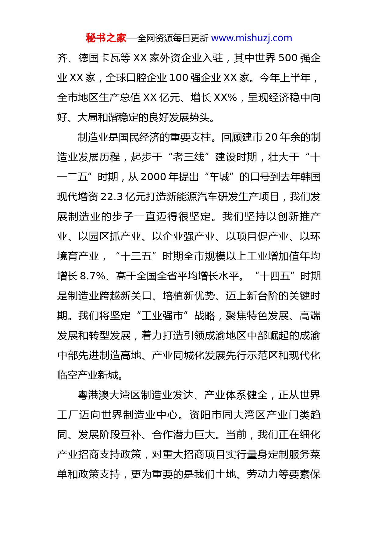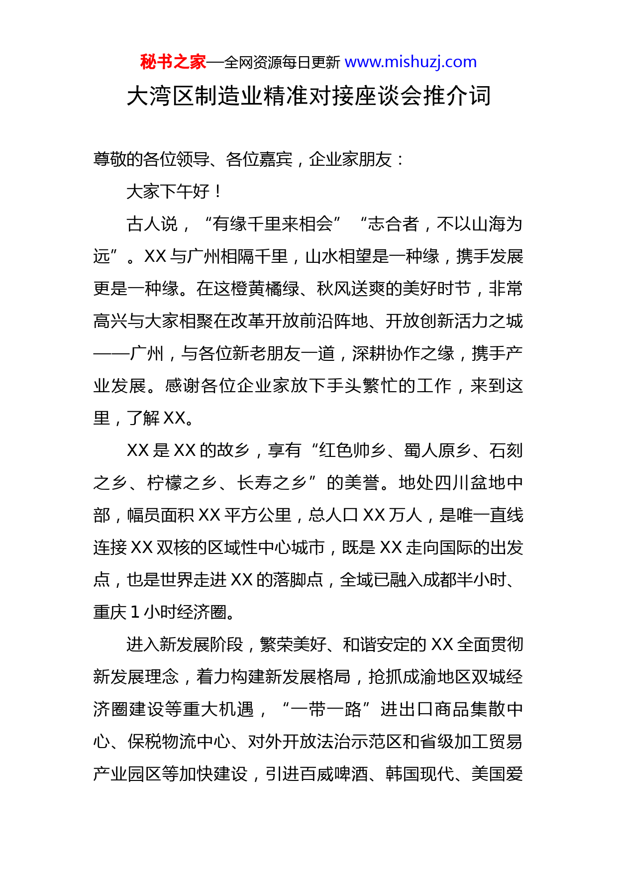 秘书之家—全网资源每日更新www.mishuzj.com大湾区制造业精准对接座谈会推介词尊敬的各位领导、各位嘉宾,企业家朋友:大家下午好!古人说,“有缘千里来相会”“志合者,不以山海为远”。XX与广州相隔千里,山水相望是一种缘,携手发展更是一种缘。在这橙黄橘绿、秋风送爽的美好时节,非常高兴与大家相聚在改革开放前沿阵地、开放创新活力之城——广州,与各位新老朋友一道,深耕协作之缘,携手产业发展。感谢各位企业家放下手头繁忙的工作,来到这里,了解XX。XX是XX的故乡,享有“红色帅乡、蜀人原乡、石刻之乡、柠檬之乡、长寿之乡”的美誉。地处四川盆地中部,幅员面积XX平方公里,总人口XX万人,是唯一直线连接XX双核的区域性中心城市,既是XX走向国际的出发点,也是世界走进XX的落脚点,全域已融入成都半小时、重庆1小时经济圈。进入新发展阶段,繁荣美好、和谐安定的XX全面贯彻新发展理念,着力构建新发展格局,抢抓成渝地区双城经济圈建设等重大机遇,“一带一路”进出口商品集散中心、保税物流中心、对外开放法治示范区和省级加工贸易产业园区等加快建设,引进百威啤酒、韩国现代、美国爱秘书之家—全网资源每日更新www.mishuzj.com齐、德国卡瓦等XX家外资企业入驻,其中世界500强企业XX家,全球口腔企业100强企业XX家。今年上半年,全市地区生产总值XX亿元、增长XX%,呈现经济稳中向好、大局和谐稳定的良好发展势头。制造业是国民经济的重要支柱。回顾建市20年余的制造业发展历程,起步于“老三线”建设时期,壮大于“十一二五”时期,从2000年提出“车城”的口号到去年韩国现代增资22.3亿元打造新能源汽车研发生产项目,我们发展制造业的步子一直迈得很坚定。我们坚持以创新推产业、以园区抓产业、以企业强产业、以项目促产业、以环境育产业,“十三五”时期全市规模以上工业增加值年均增长8.7%、高于全国全省平均增长水平。“十四五”时期是制造业跨越新关口、培植新优势、迈上新台阶的关键时期。我们将坚定“工业强市”战略,聚焦特色发展、高端发展和转型发展,着力打造引领成渝地区中部崛起的成渝中部先进制造高地、产业同城化发展先行示范区和现代化临空产业新城。粤港澳大湾区制造业发达、产业体系健全,正从世界工厂迈向世界制造业中心。资阳市同大湾区产业门类趋同、发展阶段互补、合作潜力巨大。当前,我们正在细化产业招商支持政策,对重大招商项目实行量身定制服务菜单和政策支持,更为重要的是我们土地、劳动力等要素保秘书之家—全网资源每日更新www.mishuzj.com障充足,在资阳投资综合成本仅为沿海地区70%,比周边城市低20%左右。今天,我们来到这里,既是接续缘分的新开端,也是谋求合作的新起点。借此机会,我与大家分享资阳制造业的“六张名片”。一是医疗产业独树一帜。XX是全国唯一医疗全产业链基地,是落实健康中国战略的重点示范项目,专门出台了《支持XX发展若干措施》。已引进爱齐、卡瓦等国内外知名口腔企业XX户,产品涵盖口腔设备4大类60余个、口腔材料5大类100余种。2020年实现产值XX亿,增长180%,占全省医疗企业总产值的十分之一。目前,建成8万平米多功能中心、3万平米检验检测中心和5万平米人才公寓,正与北京大学、中山大学口腔医学院等共同组建集牙谷智库、口腔疾病研究国家重点实验室于一体的“科技创新研究院”,与华西口腔医院共同建设“三级专科医院”,加快推进“特色小镇”建设,全力打造“中国一流、世界知名”的中国XX。我们诚邀国内外医疗装备材料企业入驻,合作发展装备材料产业!二是装备制造产业齐头并进。XX是全国最大的出口新能源机车和调车机车研制基地,商用车产业是我们装备制造产业的重点,全市规模以上汽车产业企业64家,有现代商用车、南骏汽车2家整车制造企业和东风四通、和平重汽、腾川车辆、宏泰熊猫等4家专用车改装企业,形成了秘书之家—全网资源每日更新www.mishuzj.com31万辆商用汽车、商用电动车、专用车及12万台柴油发动机等零部件配套生产能力。有省级企业技术中心6个,省名牌产品3个,中国驰名商标1件,省著名商标6件,装备制造已成为我市关联度最高、链条最长的支柱产业。当前,我们正着力推动整车与零部件全产业链协同发展,努力打造全国重要的商用车及零部件生产制造和出口基地。我们希望引进更多、更好的整车生产和零部件配套企业,全力打造机车、商用车产业集群。三是生物医药产业渐成主流。XX是全省的医疗器械生产基地、中成药及化学药品生产基地、中药材原生种植基地。我们突出政策引导,推动产业集聚、企业升级,全市现有禾邦、大千、科伦等规模以上生物医药企业16户。特别是科伦公司9个品种12个品规通过一致性评价,占全省仿制药一致性评价“半壁江山”。我们希望和大家合作开发新型疫苗、基因治疗药物、生物诊断药物、首仿药等新药,合作发展高端医疗器械制造,共同做大做强生物医药产业。四是食品饮料产业百舸争流。经过多年发展,XX已基本形成粮油果蔬肉调味品加工制造业,现有规模以上食品饮料企业64户,占全市规模工业企业总户数25.3%。百威啤酒、加多宝、安井食品已具备行业领先水平,XX区域品牌价值高达188亿元,“XX”标准成为国家标准。柑橘秘书之家—全网资源每日更新www.mishuzj.com