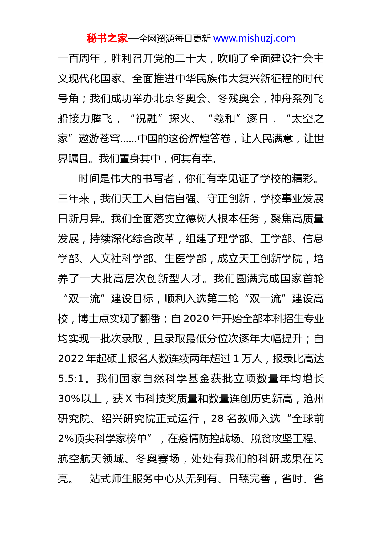秘书之家—全网资源每日更新www.mishuzj.com奋斗成就梦想--校长在2023年研究生毕业典礼暨学位授予仪式上的讲话亲爱的同学们、老师们,各位家长、校友:大家好!淑气催黄鸟,晴光转绿蘋。一夜东风,吹绿了泮湖两岸垂柳,吹开了满园芬芳,吹散了三年疫情阴霾。今天,我们在这里举行2023届研究生毕业典礼,共同见证你们接受拨穗正冠,完成青春的加冕礼。在此,我代表全校师生员工,向圆满完成学业的1326名毕业研究生表示热烈祝贺!向辛勤养育你们的父母、悉心指导你们的老师、关心支持你们的亲友致以衷心的感谢和崇高的敬意!同学们,时间镌刻前进的足迹,历史见证奋斗的征程。三年来,你们与祖国共奋进、与学校同成长,把在校园的时光活成自己想要的样子,学校也因你们而成为我们想要的样子。时间是伟大的记录者,我们有幸见证了国家的辉煌。过去的三年,是极为不平凡的三年。在以习近平同志为核心的党中央坚强领导下,我们统筹疫情防控和经济社会发展,最大程度保护了人民生命安全和身体健康;如期打赢脱贫攻坚战,历史性消除了绝对贫困;如期全面建成小康社会,人民生活富裕安康;我们隆重庆祝中国共产党成立秘书之家—全网资源每日更新www.mishuzj.com一百周年,胜利召开党的二十大,吹响了全面建设社会主义现代化国家、全面推进中华民族伟大复兴新征程的时代号角;我们成功举办北京冬奥会、冬残奥会,神舟系列飞船接力腾飞,“祝融”探火、“羲和”逐日,“太空之家”遨游苍穹……中国的这份辉煌答卷,让人民满意,让世界瞩目。我们置身其中,何其有幸。时间是伟大的书写者,你们有幸见证了学校的精彩。三年来,我们天工人自信自强、守正创新,学校事业发展日新月异。我们全面落实立德树人根本任务,聚焦高质量发展,持续深化综合改革,组建了理学部、工学部、信息学部、人文社科学部、生医学部,成立天工创新学院,培养了一大批高层次创新型人才。我们圆满完成国家首轮“双一流”建设目标,顺利入选第二轮“双一流”建设高校,博士点实现了翻番;自2020年开始全部本科招生专业均实现一批次录取,且录取最低分位次逐年大幅提升;自2022年起硕士报名人数连续两年超过1万人,报录比高达5.5:1。我们国家自然科学基金获批立项数量年均增长30%以上,获X市科技奖质量和数量连创历史新高,沧州研究院、绍兴研究院正式运行,28名教师入选“全球前2%顶尖科学家榜单”,在疫情防控战场、脱贫攻坚工程、航空航天领域、冬奥赛场,处处有我们的科研成果在闪亮。一站式师生服务中心从无到有、日臻完善,省时、省秘书之家—全网资源每日更新www.mishuzj.com力、省事;博雅书院、红色文化研究与教育基地、蒋子龙文学研究院,润物无声、涤荡心灵;“天鹅湖”“荷塘”“海棠大道”,美不胜收、流连忘返……天工的这份精彩答卷,让人倍感振奋、为之自豪。我们共同努力,自信自强。时间是伟大的鉴赏者,学校有幸见证了你们的卓越。一位哲学家曾说:“人生和事业的最大的乐趣,就是成为不同于出发时的自己。”三年来,你们潜心治学、追求创新,在历练中收获成长,攻克一个又一个学术难题,取得了一项又一项优秀成绩。你们精益求精、孜孜不倦,竞赛场、学术圈有你们所向披靡、矢志奋斗的风采。看到同学们在实验服上镶绣着“科研很苦,坚持很酷”八个大字时,我很欣慰。你们当中,有以纺研2002班为代表的先进集体创建者,有以刘亚荣为代表的科研攻关者,有以孙建瑞、侯宪哲、秦发涛为代表的见义勇为者,有以董学彪为代表的援疆支教、贵州支教者。你们不惧风险、挺身而出,勇敢地变身为“大白”“小蓝”,不计回报、积极投身于疫情防控战场,展现出天工人的责任担当和赤子之心……你们的这份亮丽答卷,让学校为之欣喜、为之骄傲。你们意气风发,踌躇满志。团结奋斗的中国、接续奋斗的天工、拼搏奋斗的你们,都实现了一个个梦想。同学们已如脚下的小草,崭露秘书之家—全网资源每日更新www.mishuzj.com头角,未来更为可期。希望同学们:——做拥抱时代的奋斗者。为什么要奋斗?唯有奋斗才能成就梦想。实现中华民族伟大复兴是一场接力跑,在几代人接续奋斗下,已经取得了举世瞩目的伟大成就,造就了当今之盛世。今日之中国,正阔步走在强国建设、民族复兴的新征程上。当代之青年,正生逢其时,实现梦想的前景无比光明。新时代新征程,给我们提供了发挥才干、施展抱负的广阔舞台,激励着我们接续奋斗。希望你们,积极主动拥抱新时代,把个人梦想与时代召唤融为一体,立鸿鹄之志,展骐骥之跃,勇立潮头、引领潮流,不负青春、不负韶华、不负时代,接好强国建设、民族复兴的接力棒,跑出更好的成绩,做“强国有我、奋斗以成”的天工人。——做胸怀家国的奋斗者。为谁而奋斗?唯有把小我融入大我,才不会迷失奋斗的方向。古人有云:“君子之为学也,将以成身而备天下国家之用也。”我们天工人始终与国家民族同呼吸、共命运。学校秉承张朵山、张汉文等老一辈天工人“学成报国、实业救国、育才兴国”的家国情怀,薪火相传,日久弥新。希望你们,传承好弘扬好学校的光荣传统和优良作风,胸怀“国之大者”,把自己的命运与国家发展、民族复兴紧密地联系在一起,不负党的期望、人民期盼、民族重托,“为天地立心,为生民立秘书之家—全网资