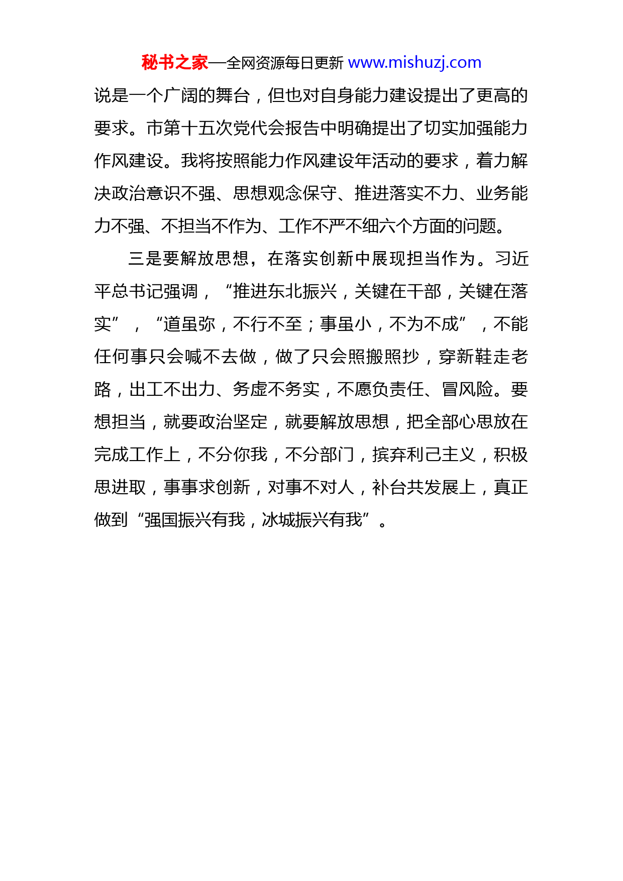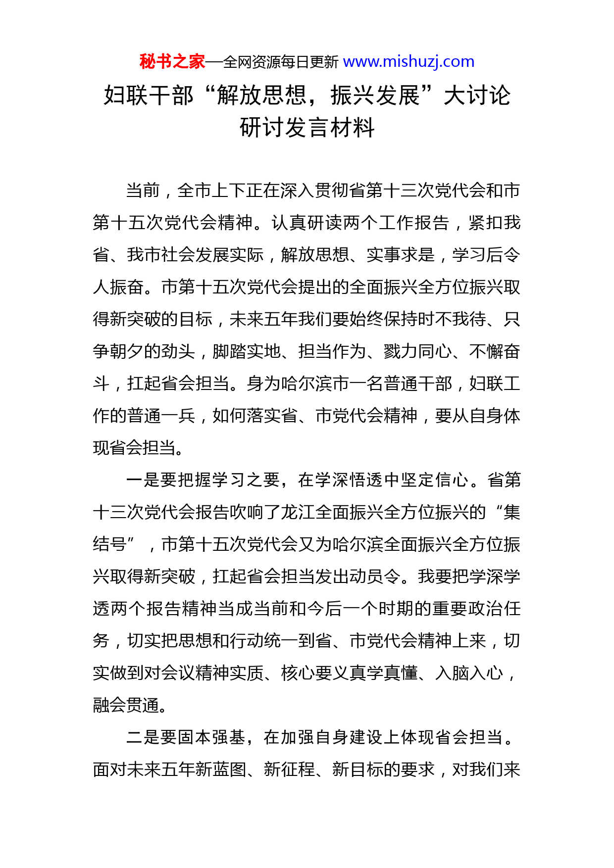 秘书之家—全网资源每日更新www.mishuzj.com妇联干部“解放思想,振兴发展”大讨论研讨发言材料当前,全市上下正在深入贯彻省第十三次党代会和市第十五次党代会精神。认真研读两个工作报告,紧扣我省、我市社会发展实际,解放思想、实事求是,学习后令人振奋。市第十五次党代会提出的全面振兴全方位振兴取得新突破的目标,未来五年我们要始终保持时不我待、只争朝夕的劲头,脚踏实地、担当作为、戮力同心、不懈奋斗,扛起省会担当。身为哈尔滨市一名普通干部,妇联工作的普通一兵,如何落实省、市党代会精神,要从自身体现省会担当。一是要把握学习之要,在学深悟透中坚定信心。省第十三次党代会报告吹响了龙江全面振兴全方位振兴的“集结号”,市第十五次党代会又为哈尔滨全面振兴全方位振兴取得新突破,扛起省会担当发出动员令。我要把学深学透两个报告精神当成当前和今后一个时期的重要政治任务,切实把思想和行动统一到省、市党代会精神上来,切实做到对会议精神实质、核心要义真学真懂、入脑入心,融会贯通。二是要固本强基,在加强自身建设上体现省会担当。面对未来五年新蓝图、新征程、新目标的要求,对我们来秘书之家—全网资源每日更新www.mishuzj.com说是一个广阔的舞台,但也对自身能力建设提出了更高的要求。市第十五次党代会报告中明确提出了切实加强能力作风建设。我将按照能力作风建设年活动的要求,着力解决政治意识不强、思想观念保守、推进落实不力、业务能力不强、不担当不作为、工作不严不细六个方面的问题。三是要解放思想,在落实创新中展现担当作为。习近平总书记强调,“推进东北振兴,关键在干部,关键在落实”,“道虽弥,不行不至;事虽小,不为不成”,不能任何事只会喊不去做,做了只会照搬照抄,穿新鞋走老路,出工不出力、务虚不务实,不愿负责任、冒风险。要想担当,就要政治坚定,就要解放思想,把全部心思放在完成工作上,不分你我,不分部门,摈弃利己主义,积极思进取,事事求创新,对事不对人,补台共发展上,真正做到“强国振兴有我,冰城振兴有我”。