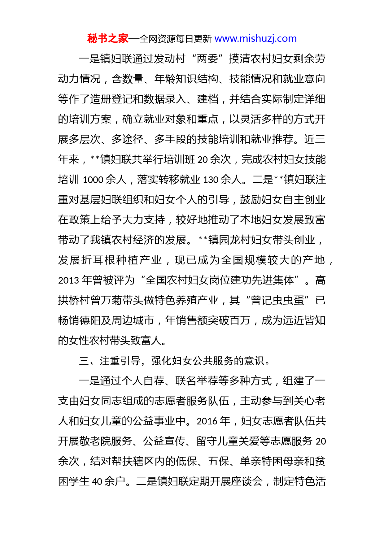 秘书之家—全网资源每日更新www.mishuzj.com妇联申报三八红旗集体先进事迹材料市镇地处市西北面,东与南丰镇毗邻,南与镇接壤,西南与西高镇为邻,西北连市回澜镇,东北接兴隆镇,幅员面积28平方公里,下辖9个村(居),约2.5万人口。近年来,镇妇联在镇党委、政府的领导下积极主动开展工作,全心全意为妇女儿童办实事,好事,成为妇女的知心人、代言人。一、培选并举,提高妇女参政议政的意识。一是镇妇联按照分级管理、分类培训的原则,有针对性地对基层妇女骨干进行政治理论、实用技能和妇女工作业务的培训,积极鼓励和引导优秀农村妇女主动参政,踊跃参与村干部选举,充实女性候选人后备资源。目前,全镇9个村(居)中共有女干部13名,占村干部总数的36%,并涌现出曾小丽等优秀女村官典型。二是加强思想引导通过优化代表结构,不断提高女性党代表、人大代表的当选比例,鼓励女同胞为镇经济发展、社会事业等方面出谋划策,提供宝贵意见。目前,镇党代表中有女性代表31人,占总数的28.4%;镇人大代表中有女性代表16人,占总数的28%;女性代表共提出合理议题及建议6条。二、培引结合,提升妇女就业致富的能力。秘书之家—全网资源每日更新www.mishuzj.com一是镇妇联通过发动村“两委”摸清农村妇女剩余劳动力情况,含数量、年龄知识结构、技能情况和就业意向等作了造册登记和数据录入、建档,并结合实际制定详细的培训方案,确立就业对象和重点,以灵活多样的方式开展多层次、多途径、多手段的技能培训和就业推荐。近三年来,镇妇联共举行培训班20余次,完成农村妇女技能培训1000余人,落实转移就业130余人。二是镇妇联注重对基层妇联组织和妇女个人的引导,鼓励妇女自主创业在政策上给予大力支持,较好地推动了本地妇女发展致富带动了我镇农村经济的发展。镇园龙村妇女带头创业,发展折耳根种植产业,现已成为全国规模较大的产地,2013年曾被评为“全国农村妇女岗位建功先进集体”。高拱桥村曾万菊带头做特色养殖产业,其“曾记虫虫蛋”已畅销德阳及周边城市,年销售额突破百万,成为远近皆知的女性农村带头致富人。三、注重引导,强化妇女公共服务的意识。一是通过个人自荐、联名举荐等多种方式,组建了一支由妇女同志组成的志愿者服务队伍,主动参与到关心老人和妇女儿童的公益事业中。2016年,妇女志愿者队伍共开展敬老院服务、公益宣传、留守儿童关爱等志愿服务20余次,结对帮扶辖区内的低保、五保、单亲特困母亲和贫困学生40余户。二是镇妇联定期开展座谈会,制定特色活秘书之家—全网资源每日更新www.mishuzj.com动方案,动员妇女参与公益事业。今年5月,镇妇联组织了“帮贫助困砍菜籽”、“邻里互助插秧子”活动,动员妇女帮助双石村残疾人收割了地里的菜籽,帮助金九村70询老人种上了1.2亩的秧子。同时,镇妇联联合团委开展了“六.一圆梦行动”、“大手牵小手——关爱留守儿童”、“社会主义核心价值观进校园”等活动,不断服务于青少年的成长。三是镇妇联在全镇范围内开展“孝子孝媳”评选活动、“孝文化传承”“感恩报告会”等大型活动,通过先进典型带动全民参与,积极营造和谐的社会氛围,使大家达成共识,不断强化服务意识。四、部门联动,切实维护妇女儿童权益一是加强乡镇与市级部门,特别是上级妇联、工会、团委、民政、司法等单位的联系,借助上级力量组织开展活动,通过“贫困救助”、“暖冬行动”等形式,解决妇女儿童的就医、就学等方面的问题。近两年,共救济贫困妇女家庭40余户,看望慰问单亲家庭36户。二是充分调动镇域内企事业单位、基层妇联组织的积极性,做到政府、企事业和村(居)有效对接,最大化的实现政府与社会救助的的互补,整合商会等社会团体的资源,成立“1+1+N”爱心基金、育松()教育基金等,有针对性的解决妇女儿童遇到的困难。三是定期举办现场咨询活动,通过展画、宣传单张等向广大妇女宣传法律知识,让广大秘书之家—全网资源每日更新www.mishuzj.com妇女学会运用法律武器维护自己的合法权益,不断提高自我维权能力。今年以来,共解决妇女儿童维权案件2起,成功维护了弱智女孩曹等合法权益。