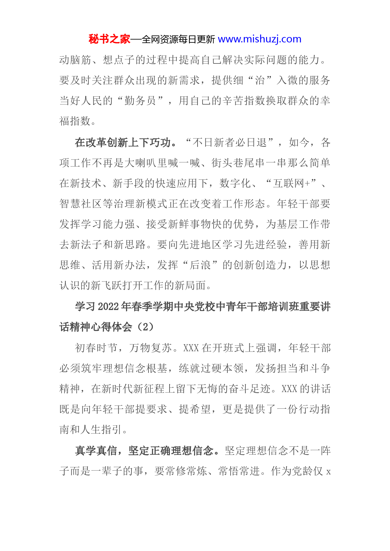 秘书之家—全网资源每日更新www.mishuzj.com学习2022年春季学期党校中青年干部培训班重要讲话精神心得体会XXX在开班式上勉励年轻干部要“真抓实干,务实功、出实招、求实效”。面对新形势新任务,年轻干部要以实学实干傍身,敢于担当、善于作为,把工作做扎实、做到位。在学习充电上下苦功。年轻干部由于工作经验欠缺、知识储备不够,容易出现“本领恐慌”现象,必须不断进行学习输电,助推自我提升。要多用脑,既学党的理论和最新思想要求,也学业务知识和专业巨作,不断扩充自己的知识储备库。勤动笔,坐得住“冷板凳”,过得了“材料关”,做一个能“打铁”,也会“绣花”的多面手。善动口,工作中要以一种“空杯”心态虚心向同事请教,学习他们看待问题的角度、处理矛盾的方式,在“取经问道”中丰富自己的眼界和阅历。在勤恳务实上下硬功。进入新时代新征程,压在年轻干部身上的担子只会越来越重,必须做到事不避难、义不逃责。面对工作中出现的复杂局面和突发状况,要正视问题直面矛盾,以一种知难而进、迎难而上的心态来应对,多当几次“热锅上的蚂蚁”,多接几回“烫手的山芋”,在秘书之家—全网资源每日更新www.mishuzj.com动脑筋、想点子的过程中提高自己解决实际问题的能力。要及时关注群众出现的新需求,提供细“治”入微的服务当好人民的“勤务员”,用自己的辛苦指数换取群众的幸福指数。在改革创新上下巧功。“不日新者必日退”,如今,各项工作不再是大喇叭里喊一喊、街头巷尾串一串那么简单在新技术、新手段的快速应用下,数字化、“互联网+”、智慧社区等治理新模式正在改变着工作形态。年轻干部要发挥学习能力强、接受新鲜事物快的优势,为基层工作带去新法子和新思路。要向先进地区学习先进经验,善用新思维、活用新办法,发挥“后浪”的创新创造力,以思想认识的新飞跃打开工作的新局面。学习2022年春季学期中央党校中青年干部培训班重要讲话精神心得体会(2)初春时节,万物复苏。XXX在开班式上强调,年轻干部必须筑牢理想信念根基,练就过硬本领,发扬担当和斗争精神,在新时代新征程上留下无悔的奋斗足迹。XXX的讲话既是向年轻干部提要求、提希望,更是提供了一份行动指南和人生指引。真学真信,坚定正确理想信念。坚定理想信念不是一阵子而是一辈子的事,要常修常炼、常悟常进。作为党龄仅x秘书之家—全网资源每日更新www.mishuzj.com的新党员,我更应将共产党员的理想信念牢记心中,向优秀的老党员看齐,时刻自警、自重、自省,积极参加部机关学习教育活动,认真学习马克思主义,深入学习党章党史和XXX新时代中国特色社会主义思想,永远信党爱党为党,在自己的岗位上践行初心使命,真正做到知之而后信之,信之而后行之。苦干实干,练就自身过硬本领。打铁还需自身硬,面对新形势新任务,年轻干部要想练就过硬本领,必须要脚踏实地、埋头苦干,在磨砺中积累经验、增长才干。对待工作任务要立说立行、紧抓快办、动脑思考、细细钻研。作为x的一名成员,我深知考核工作的严肃性和重要性,无论是办法制定、指标调度、成绩汇总,还是考核情况汇报、考核调度会议,都来不得半点马虎和一丝拖沓。只有脑子里的业务知识成篇章、成系统,扎扎实实做好每个环节,才能在解决问题的时候游刃有余。扎根事业,书写无悔奋斗青春。组织工作任务重、要求高、责任大,因此,对组工干部的要求也格外严格,既要有高度的政治觉悟和良好的精神风貌,又要有能干事、会干事、干成事的责任担当。新时代的组工干部,要以“严真细实快”的工作作风,继续发扬担当和斗争精神,趁青春年华,为推动组织工作高质量发展贡献自己的力量。