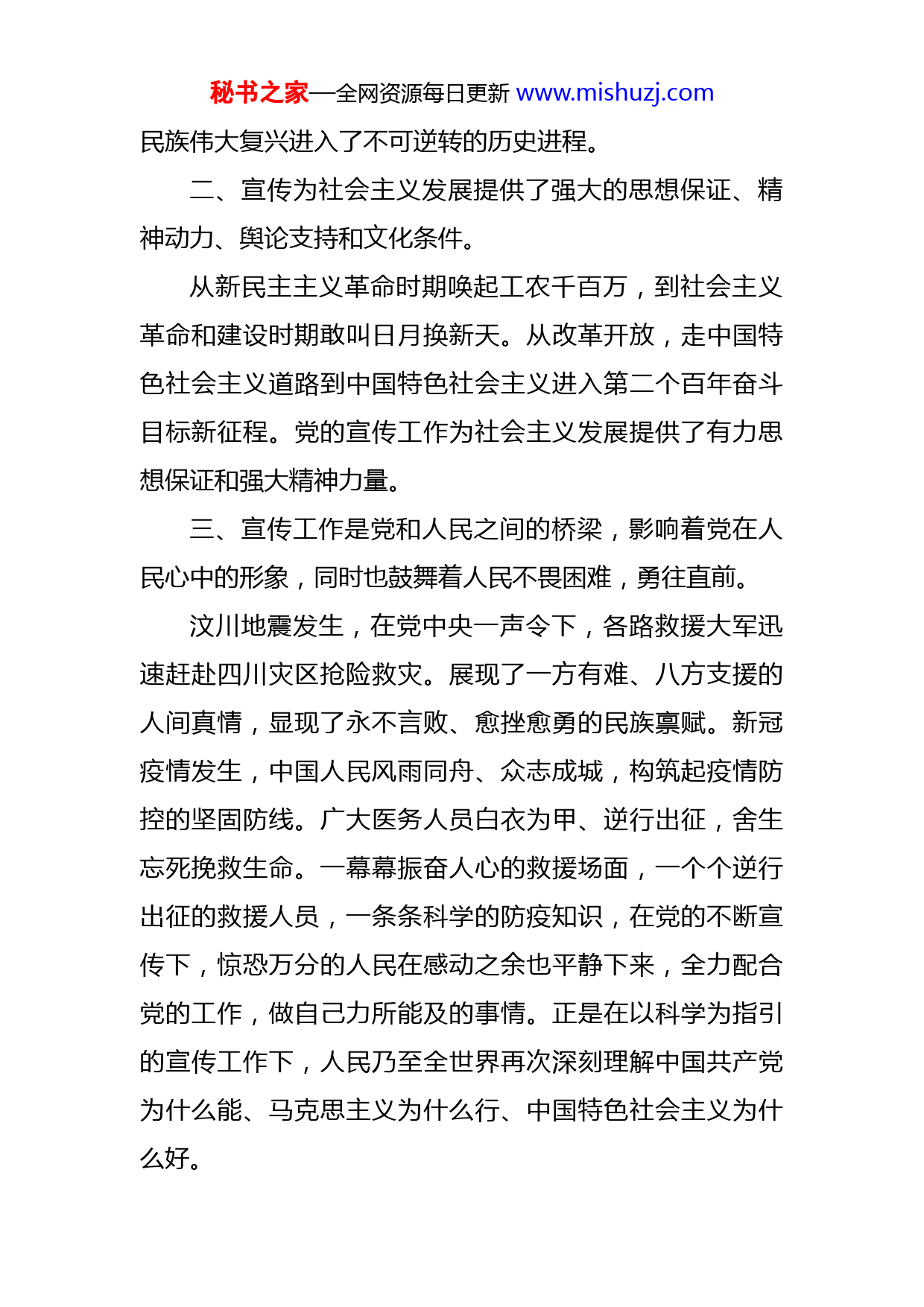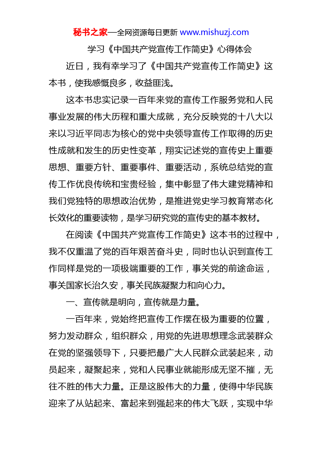 秘书之家—全网资源每日更新www.mishuzj.com学习《中国共产党宣传工作简史》心得体会近日,我有幸学习了《中国共产党宣传工作简史》这本书,使我感慨良多,收益匪浅。这本书忠实记录一百年来党的宣传工作服务党和人民事业发展的伟大历程和重大成就,充分反映党的十八大以来以习近平同志为核心的党中央领导宣传工作取得的历史性成就和发生的历史性变革,翔实记述党的宣传史上重要思想、重要方针、重要事件、重要活动,系统总结党的宣传工作优良传统和宝贵经验,集中彰显了伟大建党精神和我们党独特的思想政治优势,是推进党史学习教育常态化长效化的重要读物,是学习研究党的宣传史的基本教材。在阅读《中国共产党宣传工作简史》这本书的过程中,我不仅重温了党的百年艰苦奋斗史,同时也认识到宣传工作同样是党的一项极端重要的工作,事关党的前途命运,事关国家长治久安,事关民族凝聚力和向心力。一、宣传就是明向,宣传就是力量。一百年来,党始终把宣传工作摆在极为重要的位置,努力发动群众,组织群众,用党的先进思想理念武装群众在党的坚强领导下,只要把最广大人民群众武装起来,动员起来,凝聚起来,党和人民事业就能形成无坚不摧,无往不胜的伟大力量。正是这股伟大的力量,使得中华民族迎来了从站起来、富起来到强起来的伟大飞跃,实现中华秘书之家—全网资源每日更新www.mishuzj.com民族伟大复兴进入了不可逆转的历史进程。二、宣传为社会主义发展提供了强大的思想保证、精神动力、舆论支持和文化条件。从新民主主义革命时期唤起工农千百万,到社会主义革命和建设时期敢叫日月换新天。从改革开放,走中国特色社会主义道路到中国特色社会主义进入第二个百年奋斗目标新征程。党的宣传工作为社会主义发展提供了有力思想保证和强大精神力量。三、宣传工作是党和人民之间的桥梁,影响着党在人民心中的形象,同时也鼓舞着人民不畏困难,勇往直前。汶川地震发生,在党中央一声令下,各路救援大军迅速赶赴四川灾区抢险救灾。展现了一方有难、八方支援的人间真情,显现了永不言败、愈挫愈勇的民族禀赋。新冠疫情发生,中国人民风雨同舟、众志成城,构筑起疫情防控的坚固防线。广大医务人员白衣为甲、逆行出征,舍生忘死挽救生命。一幕幕振奋人心的救援场面,一个个逆行出征的救援人员,一条条科学的防疫知识,在党的不断宣传下,惊恐万分的人民在感动之余也平静下来,全力配合党的工作,做自己力所能及的事情。正是在以科学为指引的宣传工作下,人民乃至全世界再次深刻理解中国共产党为什么能、马克思主义为什么行、中国特色社会主义为什么好。秘书之家—全网资源每日更新www.mishuzj.com学习《中国共产党宣传工作简史》,使我认识到作为一名入党积极分子不仅要学而知责,切实增强使命感、责任感。同时也要学而力行,切实担当作为。做好自身的工作,便是对自己做好的宣传!秘书之家—全网资源每日更新www.mishuzj.com