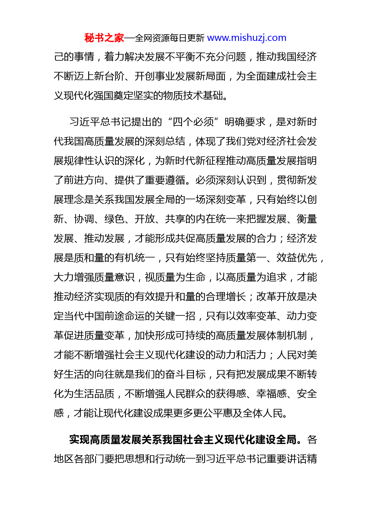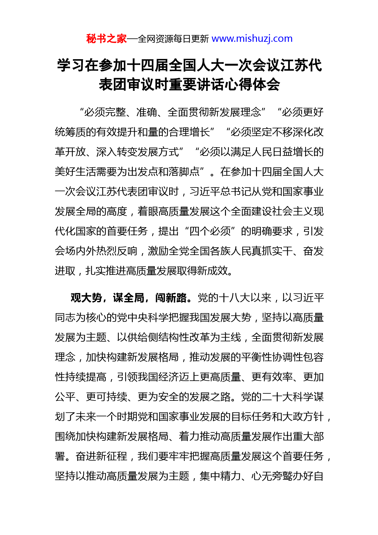 秘书之家—全网资源每日更新www.mishuzj.com学习在参加十四届全国人大一次会议江苏代表团审议时重要讲话心得体会“必须完整、准确、全面贯彻新发展理念”“必须更好统筹质的有效提升和量的合理增长”“必须坚定不移深化改革开放、深入转变发展方式”“必须以满足人民日益增长的美好生活需要为出发点和落脚点”。在参加十四届全国人大一次会议江苏代表团审议时,习近平总书记从党和国家事业发展全局的高度,着眼高质量发展这个全面建设社会主义现代化国家的首要任务,提出“四个必须”的明确要求,引发会场内外热烈反响,激励全党全国各族人民真抓实干、奋发进取,扎实推进高质量发展取得新成效。观大势,谋全局,闯新路。党的十八大以来,以习近平同志为核心的党中央科学把握我国发展大势,坚持以高质量发展为主题、以供给侧结构性改革为主线,全面贯彻新发展理念,加快构建新发展格局,推动发展的平衡性协调性包容性持续提高,引领我国经济迈上更高质量、更有效率、更加公平、更可持续、更为安全的发展之路。党的二十大科学谋划了未来一个时期党和国家事业发展的目标任务和大政方针,围绕加快构建新发展格局、着力推动高质量发展作出重大部署。奋进新征程,我们要牢牢把握高质量发展这个首要任务,坚持以推动高质量发展为主题,集中精力、心无旁鹫办好自秘书之家—全网资源每日更新www.mishuzj.com己的事情,着力解决发展不平衡不充分问题,推动我国经济不断迈上新台阶、开创事业发展新局面,为全面建成社会主义现代化强国奠定坚实的物质技术基础。习近平总书记提出的“四个必须”明确要求,是对新时代我国高质量发展的深刻总结,体现了我们党对经济社会发展规律性认识的深化,为新时代新征程推动高质量发展指明了前进方向、提供了重要遵循。必须深刻认识到,贯彻新发展理念是关系我国发展全局的一场深刻变革,只有始终以创新、协调、绿色、开放、共享的内在统一来把握发展、衡量发展、推动发展,才能形成共促高质量发展的合力;经济发展是质和量的有机统一,只有始终坚持质量第一、效益优先,大力增强质量意识,视质量为生命,以高质量为追求,才能推动经济实现质的有效提升和量的合理增长;改革开放是决定当代中国前途命运的关键一招,只有以效率变革、动力变革促进质量变革,加快形成可持续的高质量发展体制机制,才能不断增强社会主义现代化建设的动力和活力;人民对美好生活的向往就是我们的奋斗目标,只有把发展成果不断转化为生活品质,不断增强人民群众的获得感、幸福感、安全感,才能让现代化建设成果更多更公平惠及全体人民。实现高质量发展关系我国社会主义现代化建设全局。各地区各部门要把思想和行动统一到习近平总书记重要讲话精秘书之家—全网资源每日更新www.mishuzj.com神和党中央决策部署上来,牢记“国之大者”、提高政治站位、勇于担当作为,以新气象新作为推动高质量发展取得新成效。要坚定加快实现高水平科技自立自强这个推动高质量发展的必由之路,开辟发展新领域新赛道、塑造发展新动能新优势;要扭住加快构建新发展格局这个推动髙质量发展的战略基点,把实施扩大内需战略同深化供给侧结构性改革有机结合起来,坚持把发展经济的着力点放在实体经济上;要把握农业强国这个社会主义现代化强国的根基、推进农业现代化这个实现髙质量发展的必然要求,切实保障粮食和重要农产品稳定安全供给,把产业振兴作为乡村振兴的重中之重,加快建设宜居宜业和美乡村;要聚焦人民幸福安康这个推动高质量发展的最终目的,健全城乡社区治理体系,采取更多惠民生、暖民心举措,扎实促进共同富裕、打造高品质生活。新征程是充满光荣和梦想的远征。蓝图已经绘就,奋斗正当其时。在以习近平同志为核心的党中央坚强领导下,全党全国各族人民坚定信心、蹿厉奋发、勇毅前行,中国号巨轮必将沿着高质量发展的航道,乘风破浪驶向更加美好的明天。