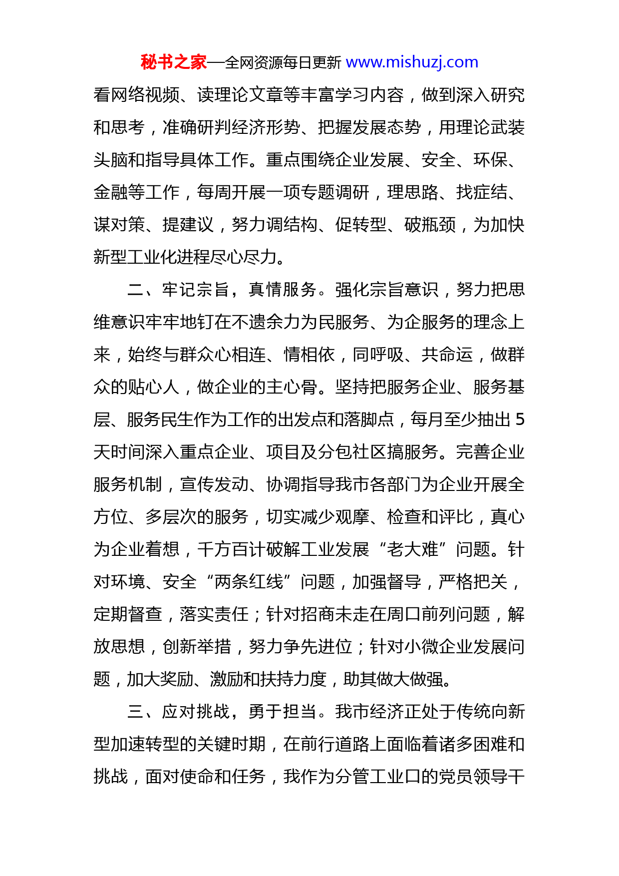 秘书之家—全网资源每日更新www.mishuzj.com学习焦裕禄、做为民务实清廉的好干部承诺书焦裕禄是县委书记的好榜样,焦裕禄精神是中国共产党和中华民族的宝贵精神财富。焦裕禄同志用光辉的一生铸就忠诚、为民、担当、实干、奉献的精神,跨越时空,历久弥新,无论过去、现在还是将来,都是亿万人民心中一座永不磨灭的丰碑,是鼓舞我们前进的思想源泉和精神动力。当前,我市经济发展正处于爬坡过坎、转型升级的关键时期,作为一名分管工业口副市长,我深感任务艰巨、责任重大。为此,我向全市人民郑重承诺:学习焦裕禄、做为民务实清廉的好干部。一、认真学习,坚定信念。始终保持对马克思主义的信仰,坚定不移地走中国特色社会主义道路,深入学习党的二十大精神和习近平总书记系列重要讲话精神,模范贯彻执行党的基本路线和各项方针政策,在思想和行动上始终与党中央保持高度一致,任何时候都决不犹疑、决不含糊、决不动摇。深刻理解学习焦裕禄精神的重要意义,全面提高思想政治素质,通过学习焦裕禄精神,使心灵受到净化和洗礼,思想水平实现提升和飞跃。针对理论学习不系统、不深入的问题,坚持每天学习,通过听专家讲座、秘书之家—全网资源每日更新www.mishuzj.com看网络视频、读理论文章等丰富学习内容,做到深入研究和思考,准确研判经济形势、把握发展态势,用理论武装头脑和指导具体工作。重点围绕企业发展、安全、环保、金融等工作,每周开展一项专题调研,理思路、找症结、谋对策、提建议,努力调结构、促转型、破瓶颈,为加快新型工业化进程尽心尽力。二、牢记宗旨,真情服务。强化宗旨意识,努力把思维意识牢牢地钉在不遗余力为民服务、为企服务的理念上来,始终与群众心相连、情相依,同呼吸、共命运,做群众的贴心人,做企业的主心骨。坚持把服务企业、服务基层、服务民生作为工作的出发点和落脚点,每月至少抽出5天时间深入重点企业、项目及分包社区搞服务。完善企业服务机制,宣传发动、协调指导我市各部门为企业开展全方位、多层次的服务,切实减少观摩、检查和评比,真心为企业着想,千方百计破解工业发展“老大难”问题。针对环境、安全“两条红线”问题,加强督导,严格把关,定期督查,落实责任;针对招商未走在周口前列问题,解放思想,创新举措,努力争先进位;针对小微企业发展问题,加大奖励、激励和扶持力度,助其做大做强。三、应对挑战,勇于担当。我市经济正处于传统向新型加速转型的关键时期,在前行道路上面临着诸多困难和挑战,面对使命和任务,我作为分管工业口的党员领导干秘书之家—全网资源每日更新www.mishuzj.com部,要找准定位、敢于担当、勇往直前。牢树“工业强市”理念,发挥勤于奉献、勇于担担子的精神,增强责任感、使命感,不走形式,不做表面文章,不搞政绩工程,切实把思想、责任、勇气转化为帮扶企业发展、招引项目入驻、化解信访案件、排查安全隐患、整治环境污染等具体工作上来,主动解难题,积极办实事,勇于挑重担,坚定不移地做新型工业化的推动者、加快“六个xx”建设的维护者和富民强市的践行者。四、求真务实,锤炼作风。坚持以科学发展观为统领,把干事创业热情与科学求实精神结合起来,把开拓进取与尊重规律结合起来,把抓好当前工作与着眼长远发展结合起来,联系思想和工作实际,找差距、定措施、选定努力方向,以实际行动、具体成绩来证明自己的学习效果。切实把焦裕禄精神作为一面镜子,从里到外把自己照一照,深入查摆自己在思想境界、素质能力、作风形象等方面存在的问题和不足,努力向焦裕禄同志看齐,从现在做起,争做焦裕禄式的好党员、好干部。以焦裕禄为榜样,提高站位,拉高坐标,进一步践行群众路线,改进工作作风,扑下身子,放下架子,深入企业,深入基层,深入群众,争办实事好事,唱响发展主旋律,打好经济主动仗。五、身体力行,廉洁从政。认真落实中央和省市转变秘书之家—全网资源每日更新www.mishuzj.com工作作风、密切联系群众的要求,从自身做起、从自我做起,改进文风会风,严格执行党风廉政建设责任制,从严要求、从严管理,做到绝不出入私人会所,绝不插手工程招投标,绝不大吃大喝、大操大办,严格遵守公务接待标准。端正态度,摆正位置,当好副职角色,为主要领导当好参谋和助手。同时,加大对工信、环保、安监等分管部门的管理,强化督查,强化责任,以务实作风和认真负责态度做好分管工作,聚合起推进经济发展的正能量。学习榜样,对照镜子,自我提高。我决心以党的群众路线教育实践活动为契机,大力学习和弘扬焦裕禄精神,积努力做到“六问六带头”,争做焦裕禄式的好干部,为加快建设“六个xx”做出自已应有的贡献。