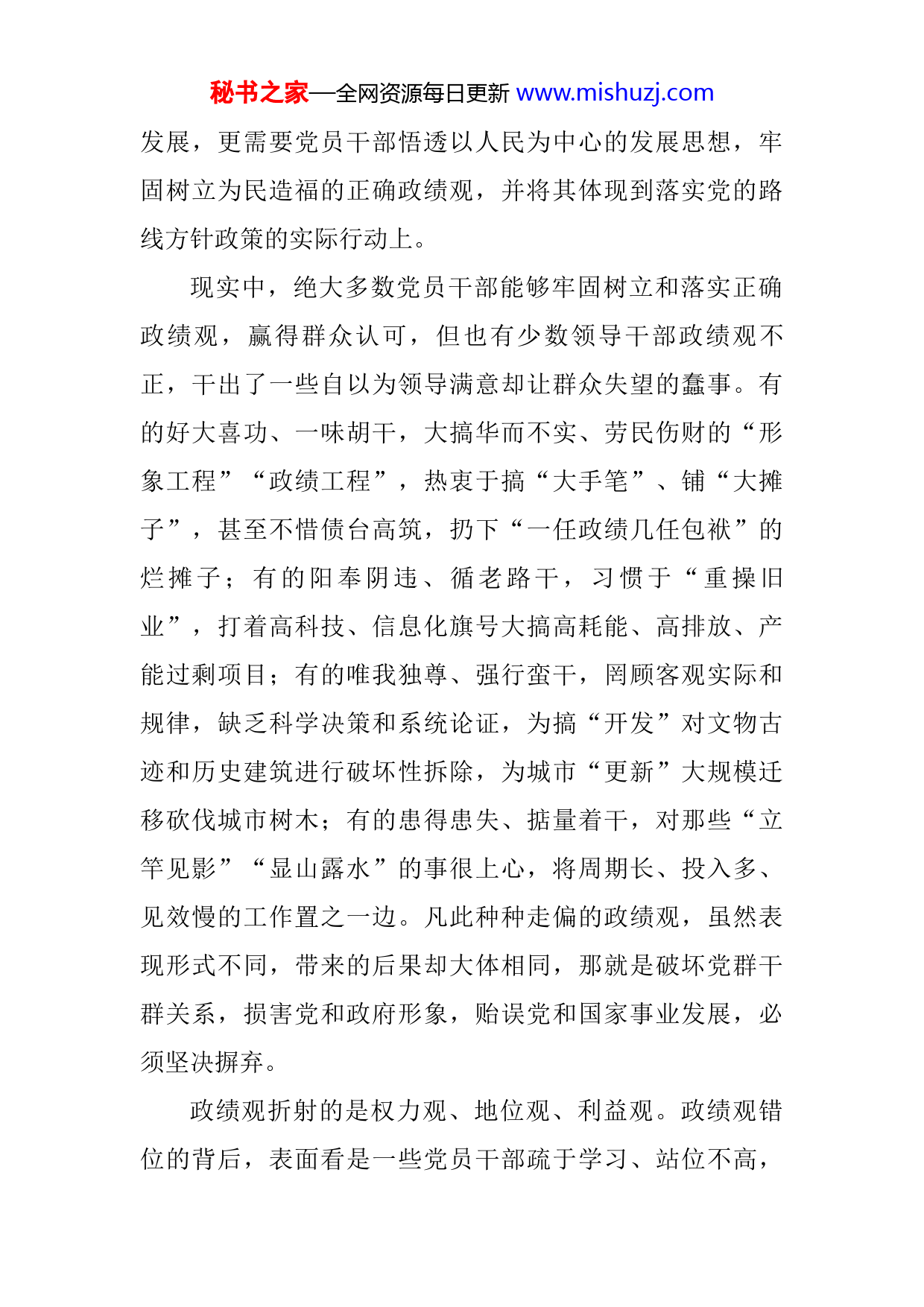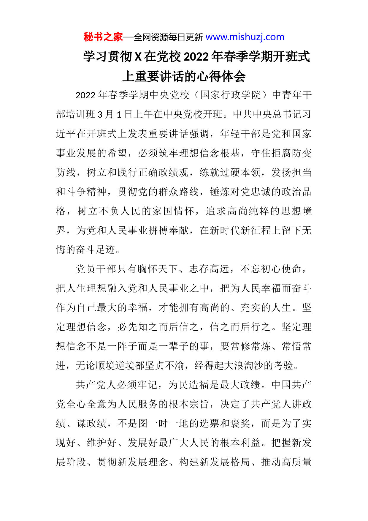 秘书之家—全网资源每日更新www.mishuzj.com学习贯彻X在党校2022年春季学期开班式上重要讲话的心得体会2022年春季学期中央党校(国家行政学院)中青年干部培训班3月1日上午在中央党校开班。中共中央总书记习近平在开班式上发表重要讲话强调,年轻干部是党和国家事业发展的希望,必须筑牢理想信念根基,守住拒腐防变防线,树立和践行正确政绩观,练就过硬本领,发扬担当和斗争精神,贯彻党的群众路线,锤炼对党忠诚的政治品格,树立不负人民的家国情怀,追求高尚纯粹的思想境界,为党和人民事业拼搏奉献,在新时代新征程上留下无悔的奋斗足迹。党员干部只有胸怀天下、志存高远,不忘初心使命,把人生理想融入党和人民事业之中,把为人民幸福而奋斗作为自己最大的幸福,才能拥有高尚的、充实的人生。坚定理想信念,必先知之而后信之,信之而后行之。坚定理想信念不是一阵子而是一辈子的事,要常修常炼、常悟常进,无论顺境逆境都坚贞不渝,经得起大浪淘沙的考验。共产党人必须牢记,为民造福是最大政绩。中国共产党全心全意为人民服务的根本宗旨,决定了共产党人讲政绩、谋政绩,不是图一时一地的选票和褒奖,而是为了实现好、维护好、发展好最广大人民的根本利益。把握新发展阶段、贯彻新发展理念、构建新发展格局、推动高质量秘书之家—全网资源每日更新www.mishuzj.com发展,更需要党员干部悟透以人民为中心的发展思想,牢固树立为民造福的正确政绩观,并将其体现到落实党的路线方针政策的实际行动上。现实中,绝大多数党员干部能够牢固树立和落实正确政绩观,赢得群众认可,但也有少数领导干部政绩观不正,干出了一些自以为领导满意却让群众失望的蠢事。有的好大喜功、一味胡干,大搞华而不实、劳民伤财的“形象工程”“政绩工程”,热衷于搞“大手笔”、铺“大摊子”,甚至不惜债台高筑,扔下“一任政绩几任包袱”的烂摊子;有的阳奉阴违、循老路干,习惯于“重操旧业”,打着高科技、信息化旗号大搞高耗能、高排放、产能过剩项目;有的唯我独尊、强行蛮干,罔顾客观实际和规律,缺乏科学决策和系统论证,为搞“开发”对文物古迹和历史建筑进行破坏性拆除,为城市“更新”大规模迁移砍伐城市树木;有的患得患失、掂量着干,对那些“立竿见影”“显山露水”的事很上心,将周期长、投入多、见效慢的工作置之一边。凡此种种走偏的政绩观,虽然表现形式不同,带来的后果却大体相同,那就是破坏党群干群关系,损害党和政府形象,贻误党和国家事业发展,必须坚决摒弃。政绩观折射的是权力观、地位观、利益观。政绩观错位的背后,表面看是一些党员干部疏于学习、站位不高,秘书之家—全网资源每日更新www.mishuzj.com尚未从内心深处确立对新发展理念的自信自觉,对新发展格局理解片面,对高质量发展实招不多;但更主要的还是宗旨意识不强,考虑个人得失过多、考虑群众利益过少,没有处理好显绩与潜绩、短期与长远、局部与全局、发展与保护的关系,没有认识到手中的权力、所处的岗位是党和人民赋予的,是为党和人民做事用的。一旦心藏小我、捂着“乌纱帽”为己做官,就可能把思想禁锢在“给自己留名、为自己邀功”的小格局里;只有心怀大我、拎着“乌纱帽”为民做事,才能真正干出一番大事业、大政绩。习近平总书记高度重视干部队伍建设,提出了一系列新理念新思想新战略,为干部成长进步指明了方向,提供了根本遵循。党员领导干部生逢伟大时代,要牢记初心使命,把握历史际遇,珍惜干部成长的良好环境,正确看待组织、正确看待个人、正确看待名利,把个人成长进步融入党和国家工作大局、融入发展全局,以实绩回报党组织关怀和培养。一要牢记初心,注重实绩。要坚持不懈用习近平新时代中国特色社会主义党务精品QQ群824703735为党务工作者提供大量资料,每天更新30多篇,请加QQ:962665491进行咨询!思想武装头脑,深入学习领悟习近平总书记“我将无我、不负人民”的崇高境界,牢记党的初心使秘书之家—全网资源每日更新www.mishuzj.com命,筑牢信仰之基、把稳思想之舵、补足精神之钙,始终做到在岗、在线、在状态,用奋斗和担当诠释初心使命。要大兴求真务实之风,树立正确政绩观,力戒形式主义、官僚主义,不搞华而不实的“花拳绣腿”,切实推动解决人民群众“急难愁盼”之事和“最恨最怨最烦”问题,把干成了什么、效果怎么样、群众满意度如何作为衡量工作的根本标准,交出经得起实践、人民和历史检验的合格答卷。二要立足大局,拼搏奉献。从干部自身而言,要服从组织、服从大局,不论岗位是否调整,不论调整是否如意,都要自觉执行组织决定、坚决服从组织安排,认真站好现在的岗,扎实做好手头的事,以干一行爱一行的热忱诠释对党忠诚,以本职岗位的一流业绩实现个人价值。干部既要重视资历积累,更要强化能力提升,尤其要突出贡献作为,坚决防止熬资历不进取、有能力不干事等倾向。要弘扬对党尽忠、对人民尽心、对事业尽责的“三尽”情怀,树立苦乐观,以担当为荣、以事业为重、以奋斗为乐。要强化以干带学、以学促干的进取精神,发扬“挤”和“钻”的精神,勤于学习借鉴,善于思考提炼,做到越干越会干、越干越能干,不断拓展成长历练的广度与厚度。三要忠诚团结,自省自励。实践证明,团结就是力
