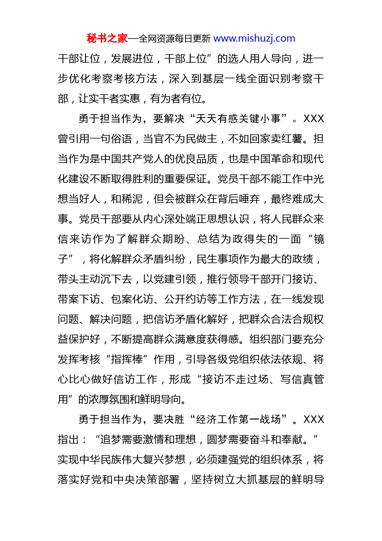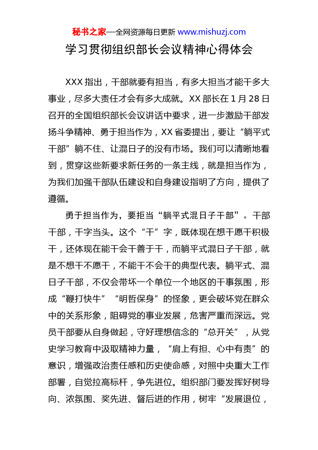 秘书之家—全网资源每日更新www.mishuzj.com学习贯彻组织部长会议精神心得体会XXX指出,干部就要有担当,有多大担当才能干多大事业,尽多大责任才会有多大成就。XX部长在1月28日召开的全国组织部长会议讲话中要求,进一步激励干部发扬斗争精神、勇于担当作为,XX省委提出,要让“躺平式干部”躺不住、让混日子的没有市场。我们可以清晰地看到,贯穿这些新要求新任务的一条主线,就是担当作为,为我们加强干部队伍建设和自身建设指明了方向,提供了遵循。勇于担当作为,要拒当“躺平式混日子干部”。干部干部,干字当头。这个“干”字,既体现在想干愿干积极干,还体现在能干会干善于干,而躺平式混日子干部,就是不想干不愿干,不能干不会干的典型代表。躺平式、混日子干部,不仅会带坏一个单位一个地区的干事氛围,形成“鞭打快牛”“明哲保身”的怪象,更会破坏党在群众中的关系形象,阻碍党的事业发展,危害严重而深远。党员干部要从自身做起,守好理想信念的“总开关”,从党史学习教育中汲取精神力量,“肩上有担、心中有责”的意识,增强政治责任感和历史使命感,对照中央重大工作部署,自觉拉高标杆,争先进位。组织部门要发挥好树导向、浓氛围、奖先进、督后进的作用,树牢“发展退位,秘书之家—全网资源每日更新www.mishuzj.com干部让位,发展进位,干部上位”的选人用人导向,进一步优化考察考核方法,深入到基层一线全面识别考察干部,让实干者实惠,有为者有位。勇于担当作为,要解决“天天有感关键小事”。XXX曾引用一句俗语,当官不为民做主,不如回家卖红薯。担当作为是中国共产党人的优良品质,也是中国革命和现代化建设不断取得胜利的重要保证。党员干部不能工作中光想当好人,和稀泥,但会被群众在背后唾弃,最终难成大事。党员干部要从内心深处端正思想认识,将人民群众来信来访作为了解群众期盼、总结为政得失的一面“镜子”,将化解群众矛盾纠纷,民生事项作为最大的政绩,带头主动沉下去,以党建引领,推行领导干部开门接访、带案下访、包案化访、公开约访等工作方法,在一线发现问题、解决问题,把信访矛盾化解好,把群众合法合规权益保护好,不断提高群众满意度获得感。组织部门要充分发挥考核“指挥棒”作用,引导各级党组织依法依规、将心比心做好信访工作,形成“接访不走过场、写信真管用”的浓厚氛围和鲜明导向。勇于担当作为,要决胜“经济工作第一战场”。XXX指出:“追梦需要激情和理想,圆梦需要奋斗和奉献。”实现中华民族伟大复兴梦想,必须建强党的组织体系,将落实好党和中央决策部署,坚持树立大抓基层的鲜明导秘书之家—全网资源每日更新www.mishuzj.com向,大力加强基层党组织建设。广大党员干部要继续弘扬老一辈革命家“不怕牺牲,英勇斗争”的精神,秉持“虽九死其犹未悔”的忠诚态度和“石破不可夺其坚”的刚强姿态,踔厉奋发、笃行不怠,将奋斗精神贯彻到为人民谋幸福,为民族谋复兴的实践中去。组织部门要聚焦党建引领乡村振兴、双招双引等中心工作,创新工作思路和方法举措,聚焦发展、重点和短板,建立落实清单化、闭环式工作机制,推动招才引智、村级集体经济发展、发展党员、非公党建、选派等重点组织工作落实落地,为迎接二十大胜利召开提供坚强组织保证。