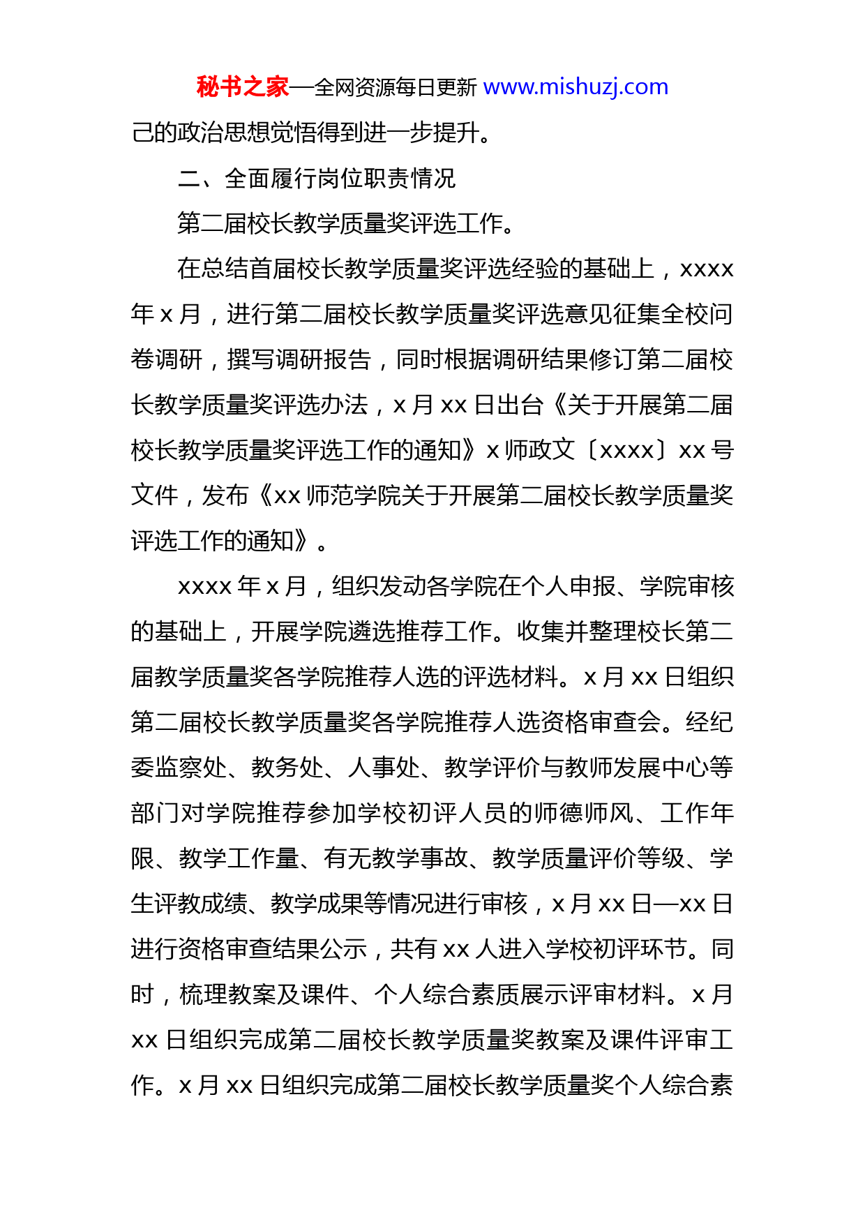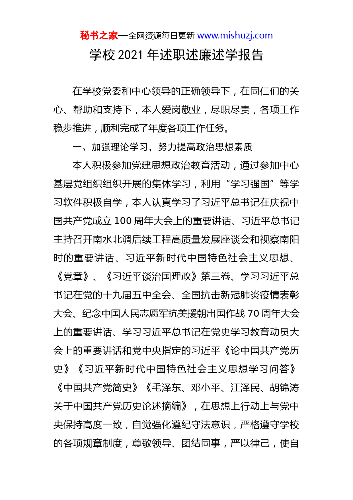 秘书之家—全网资源每日更新www.mishuzj.com学校2021年述职述廉述学报告在学校党委和中心领导的正确领导下,在同仁们的关心、帮助和支持下,本人爱岗敬业,尽职尽责,各项工作稳步推进,顺利完成了年度各项工作任务。一、加强理论学习,努力提高政治思想素质本人积极参加党建思想政治教育活动,通过参加中心基层党组织组织开展的集体学习,利用“学习强国”等学习软件积极自学,本人认真学习了习近平总书记在庆祝中国共产党成立100周年大会上的重要讲话、习近平总书记主持召开南水北调后续工程高质量发展座谈会和视察南阳时的重要讲话、习近平新时代中国特色社会主义思想、《党章》、《习近平谈治国理政》第三卷、学习习近平总书记在党的十九届五中全会、全国抗击新冠肺炎疫情表彰大会、纪念中国人民志愿军抗美援朝出国作战70周年大会上的重要讲话、学习习近平总书记在党史学习教育动员大会上的重要讲话和党中央指定的习近平《论中国共产党历史》《习近平新时代中国特色社会主义思想学习问答》《中国共产党简史》《毛泽东、邓小平、江泽民、胡锦涛关于中国共产党历史论述摘编》,在思想上行动上与党中央保持高度一致,自觉强化遵纪守法意识,严格遵守学校的各项规章制度,尊敬领导、团结同事,严以律己,使自秘书之家—全网资源每日更新www.mishuzj.com己的政治思想觉悟得到进一步提升。二、全面履行岗位职责情况第二届校长教学质量奖评选工作。在总结首届校长教学质量奖评选经验的基础上,xxxx年x月,进行第二届校长教学质量奖评选意见征集全校问卷调研,撰写调研报告,同时根据调研结果修订第二届校长教学质量奖评选办法,x月xx日出台《关于开展第二届校长教学质量奖评选工作的通知》x师政文〔xxxx〕xx号文件,发布《xx师范学院关于开展第二届校长教学质量奖评选工作的通知》。xxxx年x月,组织发动各学院在个人申报、学院审核的基础上,开展学院遴选推荐工作。收集并整理校长第二届教学质量奖各学院推荐人选的评选材料。x月xx日组织第二届校长教学质量奖各学院推荐人选资格审查会。经纪委监察处、教务处、人事处、教学评价与教师发展中心等部门对学院推荐参加学校初评人员的师德师风、工作年限、教学工作量、有无教学事故、教学质量评价等级、学生评教成绩、教学成果等情况进行审核,x月xx日—xx日进行资格审查结果公示,共有xx人进入学校初评环节。同时,梳理教案及课件、个人综合素质展示评审材料。x月xx日组织完成第二届校长教学质量奖教案及课件评审工作。x月xx日组织完成第二届校长教学质量奖个人综合素秘书之家—全网资源每日更新www.mishuzj.com质展示评审工作。xxxx年x月,组织召开第二届校长教学质量奖评选工作初评阶段的随堂听课评审环节工作安排会,xxxx年x月xx日开展第二届校长教学质量奖学生评教成绩核算工作,x月xx—xx日组织专家分文科组、理工组、综合组三组,运用两周时间完成了第二届校长教学质量奖评选工作初评阶段的随堂听课工作。xxxx年x月,开展第二届校长教学质量奖初评环节候选人综合成绩核算工作(包含教案课件评分、学生近三年评教成绩、专家组随堂听课评分、个人综合素质展示评分等),x月x日—x日进行xx师范学院第二届校长教学质量奖进入学校终评候选人名单公示,x月x日发布第二届校长教学质量奖进入学校终评候选人名单,共有xx人进入学校终评环节。x月xx日—xx日,组织终评候选人进行观摩教学顺序抽签并收集终评候选人的比赛课件及教学设计,组织终评候选人到比赛教室试场地,举行第二届校长教学质量奖观摩教学比赛并全程直播(当日在线浏览量xx万余次)。x月xx日—xx日,开展第二届校长教学质量奖终评总成绩核算工作,并进行第二届校长教学质量奖综合成绩公示。xxxx年x月,进行xx师范学院第二届校长教学质量奖获奖者名单公示,x月x日学校发布《xx师范学院关于秘书之家—全网资源每日更新www.mishuzj.com表彰第二届校长教学质量奖获奖者的决定》文件,共有x位教师荣获校长教学杰出贡献奖、x位教师荣获校长教学质量奖、x位教师荣获校长教学质量奖提名奖、x位教师荣获终评候选人入围奖,发放奖金x万元。xxxx年x月,筹备表彰活动,准备策划方案,撰写颁奖词、获奖感言,拍摄获奖选手感言视频,制作第二届校长教学质量奖宣传片。xxxx年xx月,进行第二届校长教学质量奖表彰活动彩排和正式表彰活动,全程直播,表彰活动当天线上观看人数达xx万人次。第三届xx省本科高校教师课堂教学创新大赛遴选推荐、参赛工作。xxxx年xx月—xx月,以赛代训,从第二届校长教学质量奖终评教师中遴选推荐参加xx省青年教师课堂教学创新大赛复赛选手x人,组织往届获奖教师对其进行赛前磨课指导,经线上复赛、现场决赛等环节,我校参赛教师x人荣获青年组特等奖,x人荣获教授组一等奖,x人荣获青年组二等奖。首届全国高校教师教学创新大赛(xx赛区)选拔赛遴选推荐、参赛工作。xxxx年x月—x月,组织遴选x位教师参加“首届全国高校教师教学创新大赛(xx赛区)选拔赛”,并组织专秘书之家—全网资源每日更新www.mishuzj.com家组进行赛前指导。通过网络评审、现场评审等环节,我校x位教师荣获首届全国高校教师教学创新大赛(xx赛区)选拔赛“优秀选手奖”。实践锻炼与单科进修教师选