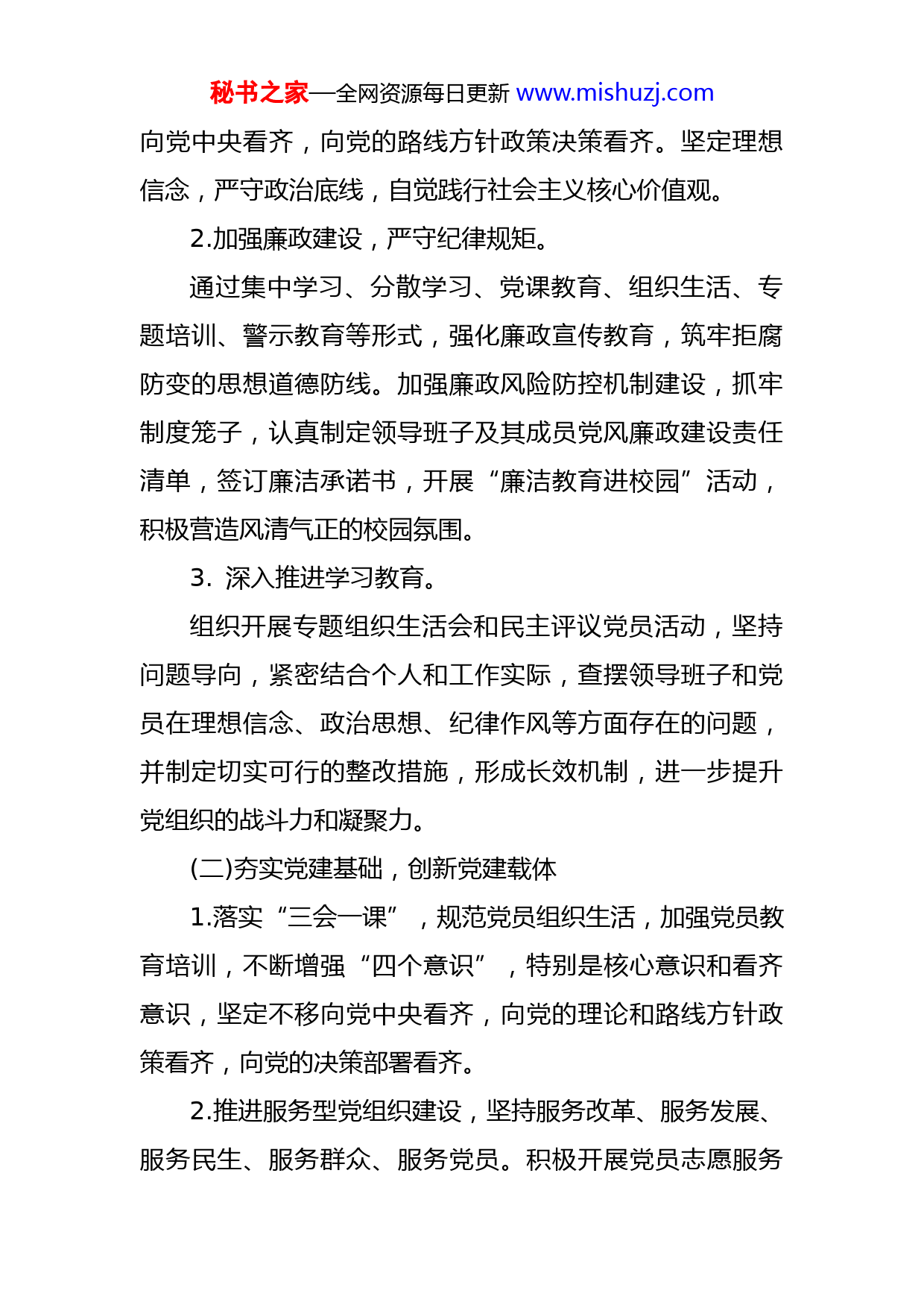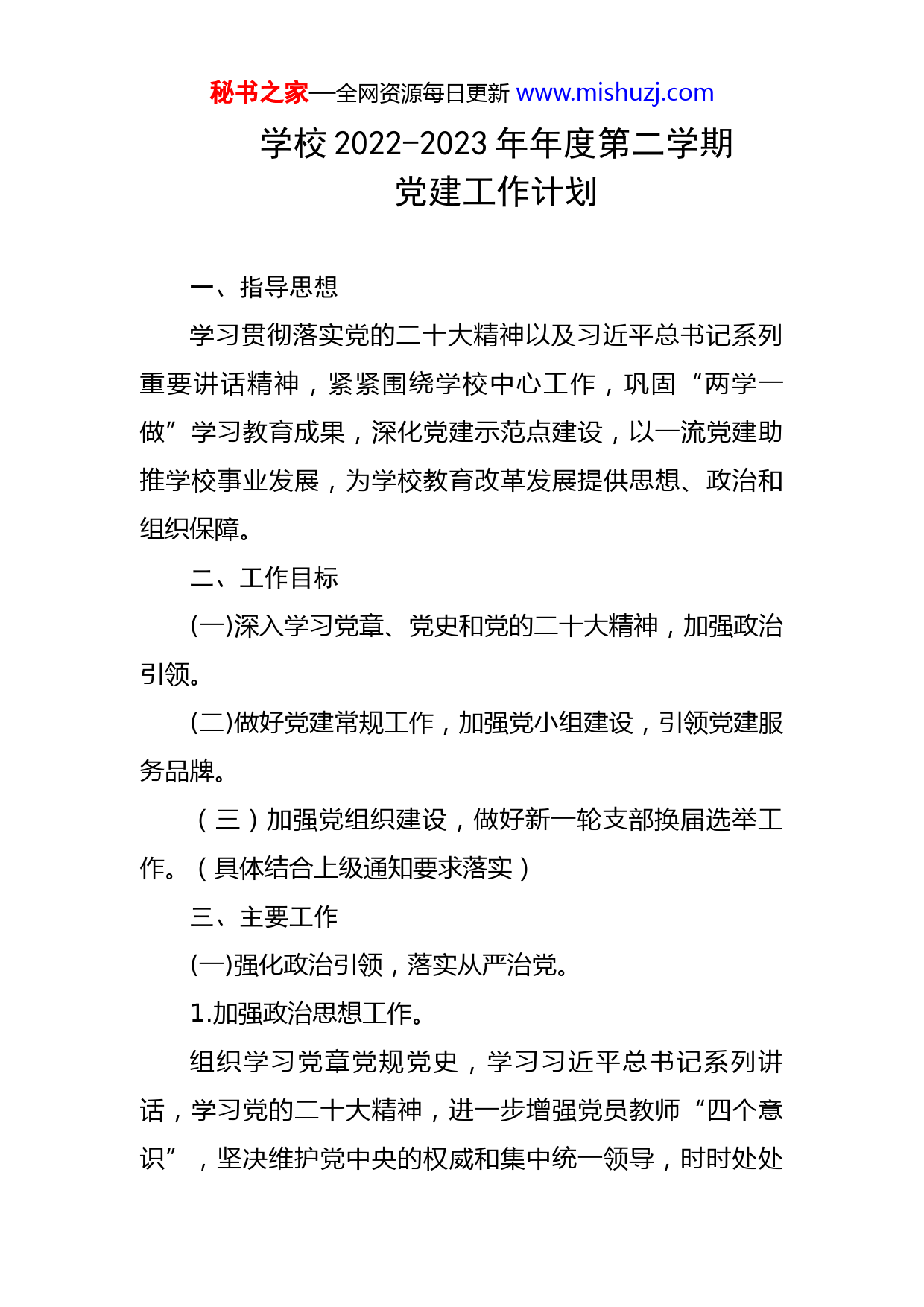 秘书之家—全网资源每日更新www.mishuzj.com学校2022-2023年年度第二学期党建工作计划一、指导思想学习贯彻落实党的二十大精神以及习近平总书记系列重要讲话精神,紧紧围绕学校中心工作,巩固“两学一做”学习教育成果,深化党建示范点建设,以一流党建助推学校事业发展,为学校教育改革发展提供思想、政治和组织保障。二、工作目标(一)深入学习党章、党史和党的二十大精神,加强政治引领。(二)做好党建常规工作,加强党小组建设,引领党建服务品牌。(三)加强党组织建设,做好新一轮支部换届选举工作。(具体结合上级通知要求落实)三、主要工作(一)强化政治引领,落实从严治党。1.加强政治思想工作。组织学习党章党规党史,学习习近平总书记系列讲话,学习党的二十大精神,进一步增强党员教师“四个意识”,坚决维护党中央的权威和集中统一领导,时时处处秘书之家—全网资源每日更新www.mishuzj.com向党中央看齐,向党的路线方针政策决策看齐。坚定理想信念,严守政治底线,自觉践行社会主义核心价值观。2.加强廉政建设,严守纪律规矩。通过集中学习、分散学习、党课教育、组织生活、专题培训、警示教育等形式,强化廉政宣传教育,筑牢拒腐防变的思想道德防线。加强廉政风险防控机制建设,抓牢制度笼子,认真制定领导班子及其成员党风廉政建设责任清单,签订廉洁承诺书,开展“廉洁教育进校园”活动,积极营造风清气正的校园氛围。3.深入推进学习教育。组织开展专题组织生活会和民主评议党员活动,坚持问题导向,紧密结合个人和工作实际,查摆领导班子和党员在理想信念、政治思想、纪律作风等方面存在的问题,并制定切实可行的整改措施,形成长效机制,进一步提升党组织的战斗力和凝聚力。(二)夯实党建基础,创新党建载体1.落实“三会一课”,规范党员组织生活,加强党员教育培训,不断增强“四个意识”,特别是核心意识和看齐意识,坚定不移向党中央看齐,向党的理论和路线方针政策看齐,向党的决策部署看齐。2.推进服务型党组织建设,坚持服务改革、服务发展、服务民生、服务群众、服务党员。积极开展党员志愿服务秘书之家—全网资源每日更新www.mishuzj.com和党员示范岗行动,落实党组织、党员承诺、践诺、评诺工作。3.推进落实党建工作责任制,从责任制内容、责任主体、制度建设上加以完善。4.按照公推直选要求做好学校党组织换届选举工作,推选新一届支部领导班子。5.做好建党积极分子队伍培养和预备党员管理工作,邀请参加党课学习和各类主题教育活动,发掘和培养一批优秀青年骨干。6.严格做好党费管理工作,规范党费收缴,进一步落实党务公开。7.做好党建常规工作,加强党小组建设。以小组为单位,深化学校服务品牌和文化项目建设,让“有专长、乐服务”的党员在专业发展、社团建设、文化建设、公益服务等发挥其专长,培育优秀服务品牌和文化项目。(三)管好干部队伍,坚持责任担当1.加强干部队伍建设,坚持集中学习和分散学习相结合,把增强“四个意识”作为学习教育重点,提升干部责任担当意识,落实主体责任,把责任扛在肩上,抓在手里;继续围绕“立德树人”目标要求,开展工作研讨交流,提升干部组织管理和服务协调能力。秘书之家—全网资源每日更新www.mishuzj.com2.认真做好后备干部培养工作,指导开展理论学习、和岗位锻炼,提升后备干部综合素养,促进后备干部快速成长。(四)发挥党建引领,做好党建带团建1.落实党建带团建工作,指导团组织和少先队工作,发挥团队组织在保障中心工作、“和谐校园”建设和文明单位创建中的重要作用。2.学校党支部将进一步发挥党组织政治核心、文化核心和能力核心作用,不断丰富和拓展党建内涵,提升党建科学化水平,促进和谐校园建设,为办好人民满意教育作出应有贡献。四、具体安排二月份1.召开支部党员大会(每季度一次)2.支部委员会会议。(每月一次)3.党小组会议。(每月一次)4.党课:邀请宣讲团成员(每年1次)5.党章和党的二十大精神学习。三月份1.支部委员会会议。2.党小组会议。3.学雷锋常态化活动。秘书之家—全网资源每日更新www.mishuzj.com4.党章、党史和党的二十大精神学习。四月份1.支部委员会会议。2.党小组会议。3.革命传统教育。4.党章、党史和二十大精神学习。五月份1.支部委员会会议。2.党小组会议。3.主题教育活动。4.党章、党史和二十大精神学习。六月份1.支部委员会会议。2.党小组会议。3.庆祝建党102周年活动。4.党章、党史和党的二十大精神学习