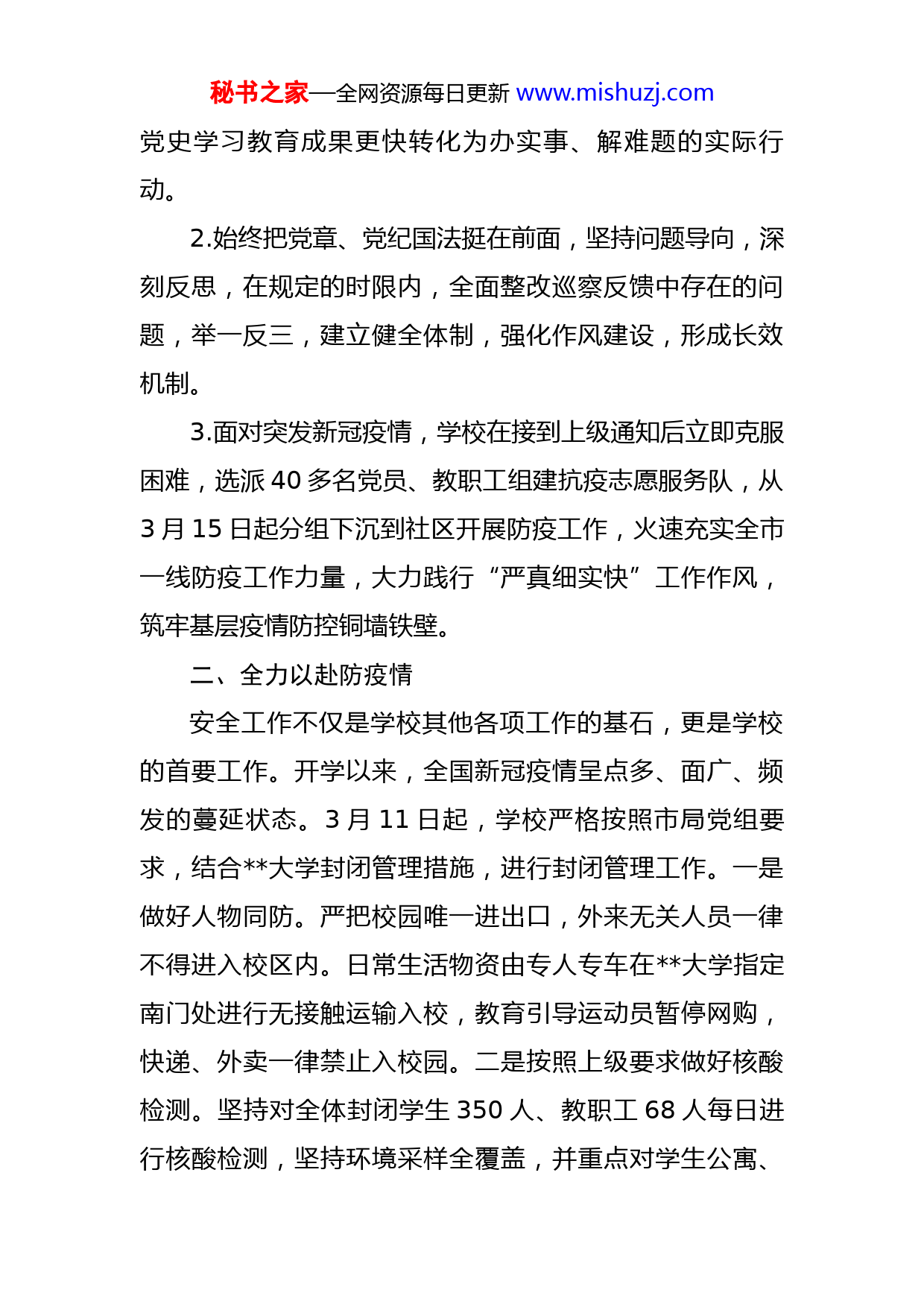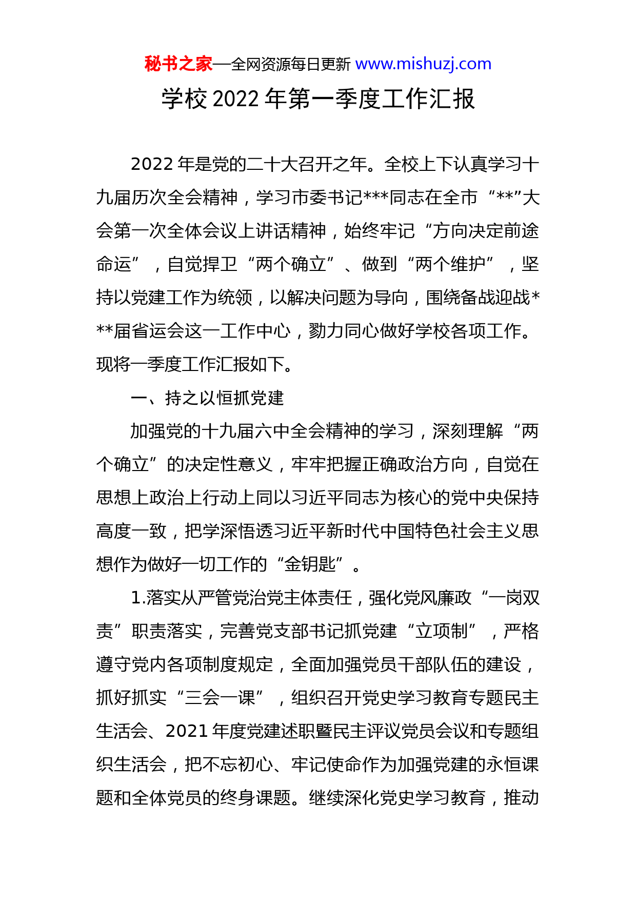 秘书之家—全网资源每日更新www.mishuzj.com学校2022年第一季度工作汇报2022年是党的二十大召开之年。全校上下认真学习十九届历次全会精神,学习市委书记同志在全市“”大会第一次全体会议上讲话精神,始终牢记“方向决定前途命运”,自觉捍卫“两个确立”、做到“两个维护”,坚持以党建工作为统领,以解决问题为导向,围绕备战迎战届省运会这一工作中心,勠力同心做好学校各项工作。现将一季度工作汇报如下。一、持之以恒抓党建加强党的十九届六中全会精神的学习,深刻理解“两个确立”的决定性意义,牢牢把握正确政治方向,自觉在思想上政治上行动上同以习近平同志为核心的党中央保持高度一致,把学深悟透习近平新时代中国特色社会主义思想作为做好一切工作的“金钥匙”。1.落实从严管党治党主体责任,强化党风廉政“一岗双责”职责落实,完善党支部书记抓党建“立项制”,严格遵守党内各项制度规定,全面加强党员干部队伍的建设,抓好抓实“三会一课”,组织召开党史学习教育专题民主生活会、2021年度党建述职暨民主评议党员会议和专题组织生活会,把不忘初心、牢记使命作为加强党建的永恒课题和全体党员的终身课题。继续深化党史学习教育,推动秘书之家—全网资源每日更新www.mishuzj.com党史学习教育成果更快转化为办实事、解难题的实际行动。2.始终把党章、党纪国法挺在前面,坚持问题导向,深刻反思,在规定的时限内,全面整改巡察反馈中存在的问题,举一反三,建立健全体制,强化作风建设,形成长效机制。3.面对突发新冠疫情,学校在接到上级通知后立即克服困难,选派40多名党员、教职工组建抗疫志愿服务队,从3月15日起分组下沉到社区开展防疫工作,火速充实全市一线防疫工作力量,大力践行“严真细实快”工作作风,筑牢基层疫情防控铜墙铁壁。二、全力以赴防疫情安全工作不仅是学校其他各项工作的基石,更是学校的首要工作。开学以来,全国新冠疫情呈点多、面广、频发的蔓延状态。3月11日起,学校严格按照市局党组要求,结合大学封闭管理措施,进行封闭管理工作。一是做好人物同防。严把校园唯一进出口,外来无关人员一律不得进入校区内。日常生活物资由专人专车在大学指定南门处进行无接触运输入校,教育引导运动员暂停网购,快递、外卖一律禁止入校园。二是按照上级要求做好核酸检测。坚持对全体封闭学生350人、教职工68人每日进行核酸检测,坚持环境采样全覆盖,并重点对学生公寓、秘书之家—全网资源每日更新www.mishuzj.com训练馆、食堂进行多次采样,检测结果均为阴性。组织全体师生员工及共同居住家庭成员共3520人,完成每人核酸检测五次。所有外训人员按属地要求做好核酸检测等疫情防控工作。因“火眼”实验室建设而前往莱州中华武校封闭备战的运动队一行102人,也按照所在地的要求和部署进行核酸检测10轮以上。三是做好防疫物资储备工作。及时补充口罩、洗手液、消毒液、防护服等防疫物资,先后购买医用外科口罩2万只,防护服0套,并及时向封闭师生免费发放。四是做好后勤保障工作。在严把防控管理的同时,关爱封闭学生日常生活要求,定期为学生集中采购生活必需用品,定期为学生改善伙食,丰富学生业余生活,缓解封闭管理压力。三、关键时刻显担当自冬训以来,全校上下以“只争朝夕,不负韶华”的紧迫感、责任感和使命感,将省委、省政府“打头阵、当先锋、上层次”要求落到实处,全力做好备战迎战届省运会各项工作,努力完成上级交派的任务。1.冬训情况。训练各部门全力抓好冬训工作,加强对外训队伍的管理跟踪,熟练掌握吃透竞赛规程,及时调整训练方法,保证运动员在比赛时状态调整到最佳。科研科合理安排营养补剂使用,做好突发伤病处理等各项保障工作,做好反兴奋剂宣传教育工作,坚持杜绝兴奋剂事件发秘书之家—全网资源每日更新www.mishuzj.com生。教育教学管理部门认真组织运动员参加省文化统考,通过率达到95%以上。并围绕省运会,针对外训、比赛学生多、时间不一致等情况,及时沟通配合各教研室,调整好文化教学进度,做好学生文化教学、德育教育和日常管理工作。行政后勤部门严密做好后勤保障工作,把好“进口关”,保证运动员用水、用餐安全。2.外训队伍情况。本轮疫情发生时,学校有12支队伍在外地训练,根据所在地市的疫情防控要求,全部采取了训练地封闭训练。分管领导和业务科室定期与教练员电话视频连线了解队伍的备战情况,对教练员及队员的思想、生活、训练、安全、疫情防控等方面给予高度关注。目前外训队伍一直保持着高昂的斗志,与所在训练地的优秀队伍实战对抗和交流学习,提升了队伍的综合竞技实力。3.封闭在校队伍情况。学校自3月11日采取不出不进的全封闭式训练模式,分管训练的两名副校长、各项目训练科长封闭期间深入基层靠队,科研、行政后勤、公寓为封闭队伍提供了全方位的保障。提高教练员及运动员的防控思想意识,强化管理监督力度,使教练员带领队伍全身心投入到训练中去。目前封闭在校的支队伍共350名运动员,根据项目特点调整训练计划,采用一日两练。田径项目以提高技术水平为主;重竞技项目体能训练和专项技能一起抓,突出实战对抗;篮球针对主要对手模拟队内比秘书之家—全网资源每日更新www.mishuzj.com赛,丰富