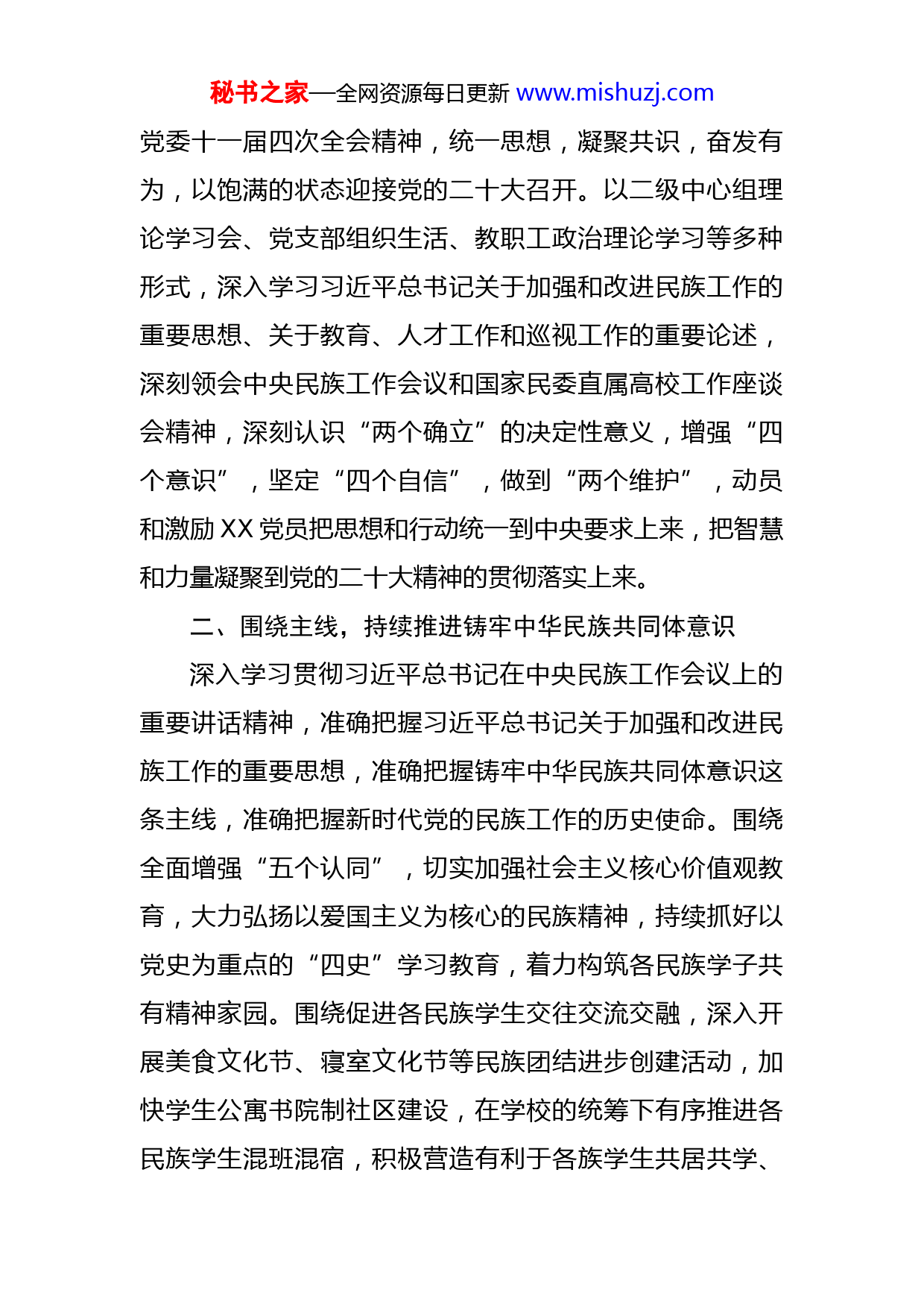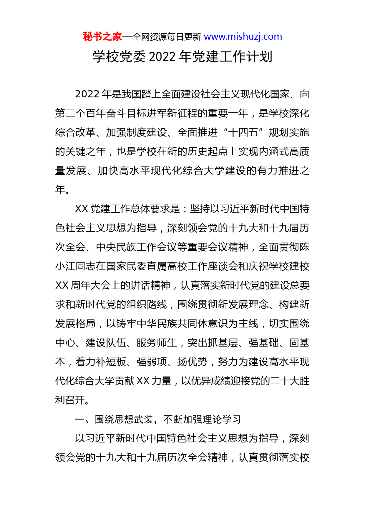 秘书之家—全网资源每日更新www.mishuzj.com学校党委2022年党建工作计划2022年是我国踏上全面建设社会主义现代化国家、向第二个百年奋斗目标进军新征程的重要一年,是学校深化综合改革、加强制度建设、全面推进“十四五”规划实施的关键之年,也是学校在新的历史起点上实现内涵式高质量发展、加快高水平现代化综合大学建设的有力推进之年。XX党建工作总体要求是:坚持以习近平新时代中国特色社会主义思想为指导,深刻领会党的十九大和十九届历次全会、中央民族工作会议等重要会议精神,全面贯彻陈小江同志在国家民委直属高校工作座谈会和庆祝学校建校XX周年大会上的讲话精神,认真落实新时代党的建设总要求和新时代党的组织路线,围绕贯彻新发展理念、构建新发展格局,以铸牢中华民族共同体意识为主线,切实围绕中心、建设队伍、服务师生,突出抓基层、强基础、固基本,着力补短板、强弱项、扬优势,努力为建设高水平现代化综合大学贡献XX力量,以优异成绩迎接党的二十大胜利召开。一、围绕思想武装,不断加强理论学习以习近平新时代中国特色社会主义思想为指导,深刻领会党的十九大和十九届历次全会精神,认真贯彻落实校秘书之家—全网资源每日更新www.mishuzj.com党委十一届四次全会精神,统一思想,凝聚共识,奋发有为,以饱满的状态迎接党的二十大召开。以二级中心组理论学习会、党支部组织生活、教职工政治理论学习等多种形式,深入学习习近平总书记关于加强和改进民族工作的重要思想、关于教育、人才工作和巡视工作的重要论述,深刻领会中央民族工作会议和国家民委直属高校工作座谈会精神,深刻认识“两个确立”的决定性意义,增强“四个意识”,坚定“四个自信”,做到“两个维护”,动员和激励XX党员把思想和行动统一到中央要求上来,把智慧和力量凝聚到党的二十大精神的贯彻落实上来。二、围绕主线,持续推进铸牢中华民族共同体意识深入学习贯彻习近平总书记在中央民族工作会议上的重要讲话精神,准确把握习近平总书记关于加强和改进民族工作的重要思想,准确把握铸牢中华民族共同体意识这条主线,准确把握新时代党的民族工作的历史使命。围绕全面增强“五个认同”,切实加强社会主义核心价值观教育,大力弘扬以爱国主义为核心的民族精神,持续抓好以党史为重点的“四史”学习教育,着力构筑各民族学子共有精神家园。围绕促进各民族学生交往交流交融,深入开展美食文化节、寝室文化节等民族团结进步创建活动,加快学生公寓书院制社区建设,在学校的统筹下有序推进各民族学生混班混宿,积极营造有利于各族学生共居共学、秘书之家—全网资源每日更新www.mishuzj.com共建共享、共事共乐的学习生活环境。三、围绕根本任务,积极参与三全育人紧扣立德树人根本任务,聚焦全员、全过程、全方位育人的体制机制,继续丰富管理育人、服务育人、环境育人、劳动育人举措,全体XX员工都要努力成为“育人者”,其一言一行、一举一动都要履行育人之责、产生育人之效,实现育人无不尽责。将立德树人贯穿XX各项工作全过程,实现育人无时不有。将立德树人覆盖到XX管理服务、网上网下,实现育人无处不在。以节约型校园、文明校园、绿色校园、智慧校园等创建活动,深化XX党委“XX”党建品牌建设,推动XX三全育人工作全面进步、全面过硬,持续提升党建品牌价值创造能力和成果转化能力,为学校立德树人工作贡献坚实的XX力量。四、围绕全面从严治党,扎实推进党建工作1.落实主体责任贯彻落实《党委(党组)落实全面从严治党主体责任规定》,牢固树立“抓党建是本职、不抓党建是失职、抓不好党建是渎职”的理念,XX党委书记、各支部书记切实履行第一责任人职责,班子成员履行“一岗双责”,夯实党委主体责任、支部直接责任,形成上下联动、齐抓共管、统一高效的工作机制。进一步完善党建工作机制,加大部署力度,强化落实力度,深化监督力度,压实各方责秘书之家—全网资源每日更新www.mishuzj.com任,层层传导压力。2.落实监督责任加大二级纪委监督执纪力度,落实监督清单,重点是政治监督、组织监督、作风监督,党员权责监督,不断强化政治纪律和政治规矩,强化组织建设,强化党性修养。对XX党委落实党建主体责任和党员干部对党内法规制度执行情况做好日常督导,对XX党建阶段性重要活动、专项部署、专项整改等工作推进情况进行专项督查,对各支部、各部门贯彻落实上级重大决策部署和XX党委重点工作情况进行重点督查。3.加强基层党组织建设坚持党的一切工作到支部的鲜明导向,认真贯彻落实《中国共产党支部工作条例(试行)》等党内法规,全面推进党支部标准化规范化建设。规范党内政治生活,严格执行“三会一课”、党员领导干部双重组织生活、民主评议党员等基本制度,丰富党支部主题党日形式和内容,充分发挥党支部活动阵地作用,增强基层党组织政治功能和组织功能,充分发挥基层党组织战斗堡垒作用和党员先锋模范作用。突出政治标准,严把发展党员入口关,统筹做好发展党员工作。严格执行《XX党委党支部分类定级评分标准》,将支部书记、支部委员的工作、党员发展工作、支部组织生活会情况、宣传报道情况、党员出勤情况等纳入秘书之家—全网资源每日更新www.mishuzj.com支部各项