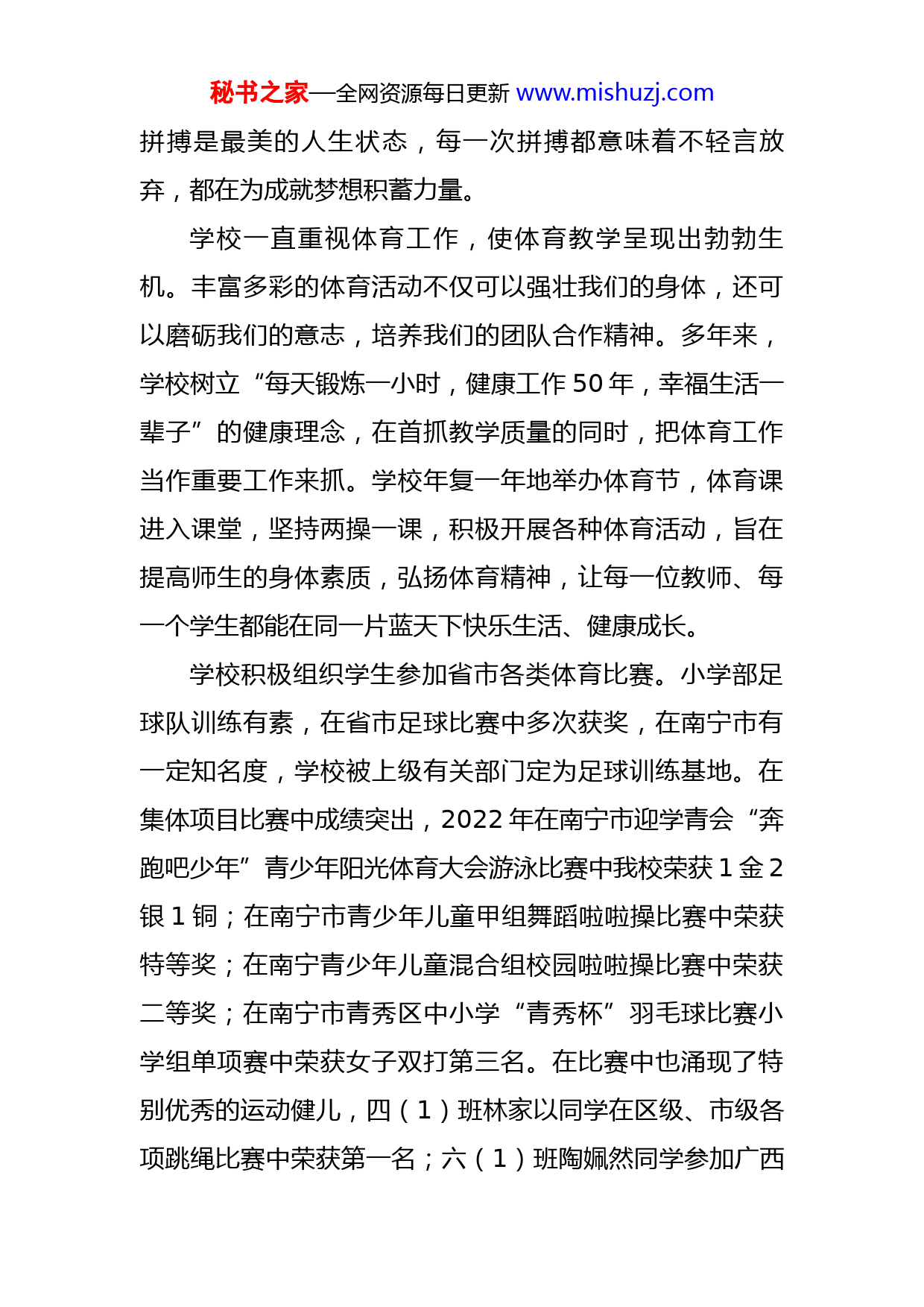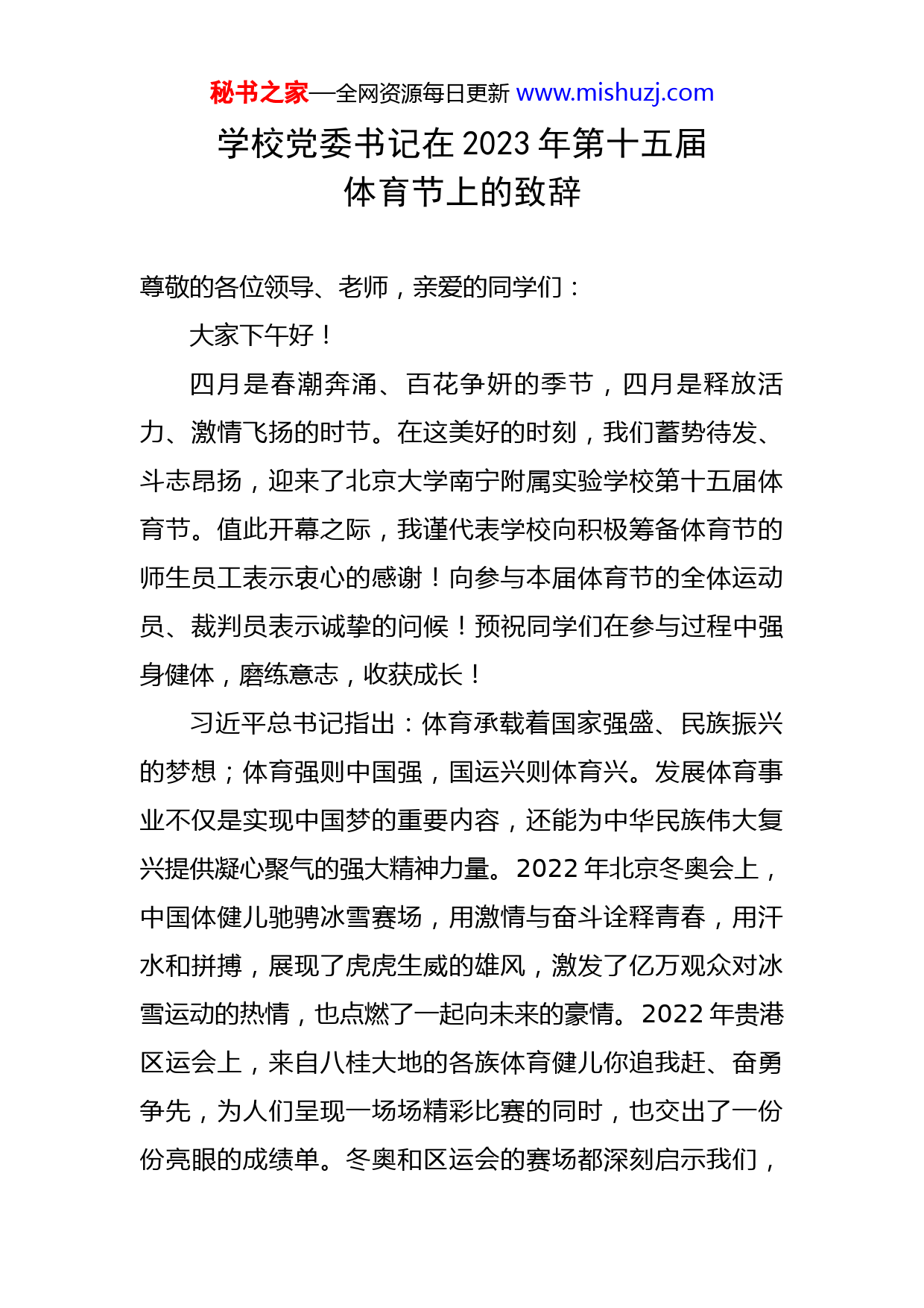 秘书之家—全网资源每日更新www.mishuzj.com学校党委书记在2023年第十五届体育节上的致辞尊敬的各位领导、老师,亲爱的同学们:大家下午好!四月是春潮奔涌、百花争妍的季节,四月是释放活力、激情飞扬的时节。在这美好的时刻,我们蓄势待发、斗志昂扬,迎来了北京大学南宁附属实验学校第十五届体育节。值此开幕之际,我谨代表学校向积极筹备体育节的师生员工表示衷心的感谢!向参与本届体育节的全体运动员、裁判员表示诚挚的问候!预祝同学们在参与过程中强身健体,磨练意志,收获成长!习近平总书记指出:体育承载着国家强盛、民族振兴的梦想;体育强则中国强,国运兴则体育兴。发展体育事业不仅是实现中国梦的重要内容,还能为中华民族伟大复兴提供凝心聚气的强大精神力量。2022年北京冬奥会上,中国体健儿驰骋冰雪赛场,用激情与奋斗诠释青春,用汗水和拼搏,展现了虎虎生威的雄风,激发了亿万观众对冰雪运动的热情,也点燃了一起向未来的豪情。2022年贵港区运会上,来自八桂大地的各族体育健儿你追我赶、奋勇争先,为人们呈现一场场精彩比赛的同时,也交出了一份份亮眼的成绩单。冬奥和区运会的赛场都深刻启示我们,秘书之家—全网资源每日更新www.mishuzj.com拼搏是最美的人生状态,每一次拼搏都意味着不轻言放弃,都在为成就梦想积蓄力量。学校一直重视体育工作,使体育教学呈现出勃勃生机。丰富多彩的体育活动不仅可以强壮我们的身体,还可以磨砺我们的意志,培养我们的团队合作精神。多年来,学校树立“每天锻炼一小时,健康工作50年,幸福生活一辈子”的健康理念,在首抓教学质量的同时,把体育工作当作重要工作来抓。学校年复一年地举办体育节,体育课进入课堂,坚持两操一课,积极开展各种体育活动,旨在提高师生的身体素质,弘扬体育精神,让每一位教师、每一个学生都能在同一片蓝天下快乐生活、健康成长。学校积极组织学生参加省市各类体育比赛。小学部足球队训练有素,在省市足球比赛中多次获奖,在南宁市有一定知名度,学校被上级有关部门定为足球训练基地。在集体项目比赛中成绩突出,2022年在南宁市迎学青会“奔跑吧少年”青少年阳光体育大会游泳比赛中我校荣获1金2银1铜;在南宁市青少年儿童甲组舞蹈啦啦操比赛中荣获特等奖;在南宁青少年儿童混合组校园啦啦操比赛中荣获二等奖;在南宁市青秀区中小学“青秀杯”羽毛球比赛小学组单项赛中荣获女子双打第三名。在比赛中也涌现了特别优秀的运动健儿,四(1)班林家以同学在区级、市级各项跳绳比赛中荣获第一名;六(1)班陶姵然同学参加广西秘书之家—全网资源每日更新www.mishuzj.com第十五届区运会荣获女子丙组100米蛙泳亚军、50米蛙泳季军。老师们,同学们,体育节是学校的盛大赛事,本届体育节以“弘扬中国精神培养健康体魄”为主题,在保留原有比赛项目的基础上,加入了引体向上、立定跳远等体育中考项目。体育节的会徽以数字“15”为原型,形成了一个成熟的身着壮锦图案裂开的石榴,而吉祥物采用红色的兔子形象,设计成一位正在跑步的运动员,故取名为“红兔”,代表着一种“热血”的体育精神。会徽和吉祥物将体育运动与中国精神相结合,深化爱国主义、集体主义、社会主义教育,激发广大师生以实际行动弘扬光荣传统、赓续红色血脉,把中国精神继承下去。逐梦新时代,青春更精彩。老师们,同学们,今日之中国,正向社会主义现代化强国迈进;今日之北附,正朝着新时代教育愿景前行。恰逢学青会,又值体育节,让我们以民族振兴为己任,以运动健身为常态,在酣畅淋漓的运动中,享受超越自我的乐趣;在你追我赶的竞争中,锤炼力争上游的精神;在齐心协力的合作中,诠释互助共赢的意义;在力与美的展示中,领悟运动健康的真谛,以优异的成绩为学青会献礼。追风赶月莫停留,平羌尽处是春山。我衷心地希望全体运动员弘扬“更高、更快、更强、更团结”的体育精秘书之家—全网资源每日更新www.mishuzj.com神,以本届体育节为平台,奋勇拼搏、敢于争先,赛出风格、赛出水平!希望全体裁判员公平公正、慎终如始地做好裁判工作,希望全体工作人员各司其职、通力合作,努力为大家提供优质高效的服务,也希望全体同学提高安全意识,做文明观众。最后,预祝我们的运动健儿勇创佳绩!预祝本届体育节圆满成功!谢谢大家!