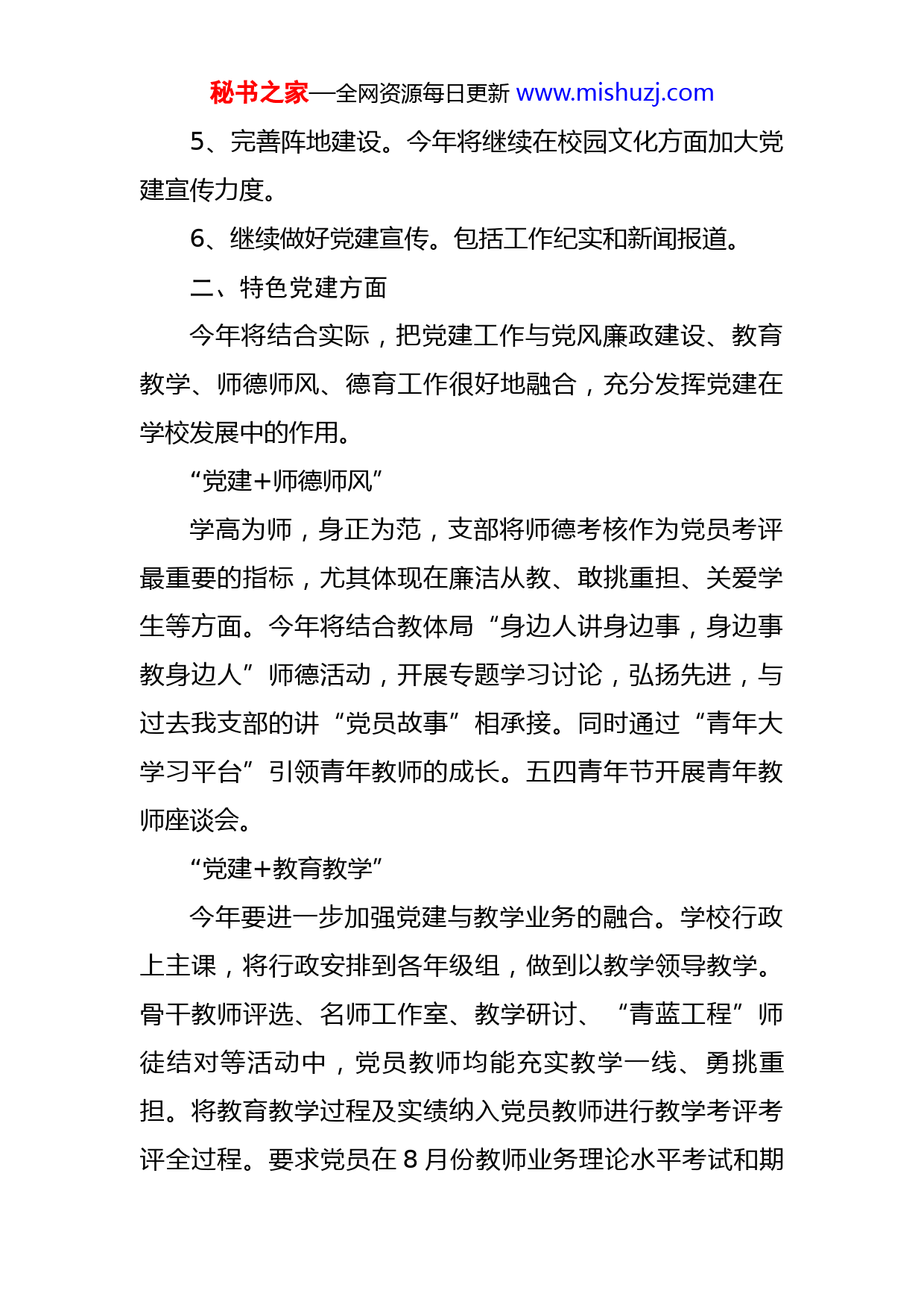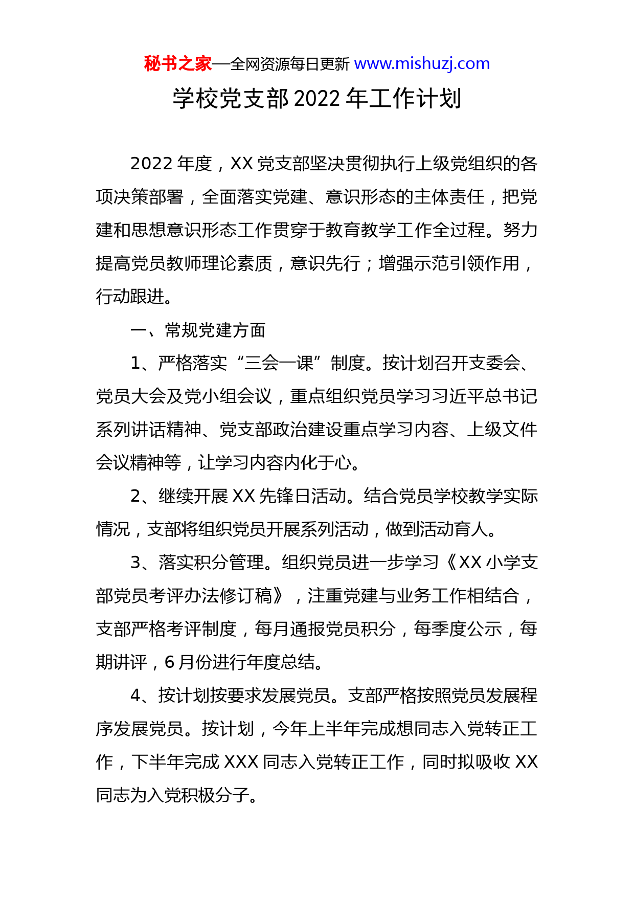 秘书之家—全网资源每日更新www.mishuzj.com学校党支部2022年工作计划2022年度,XX党支部坚决贯彻执行上级党组织的各项决策部署,全面落实党建、意识形态的主体责任,把党建和思想意识形态工作贯穿于教育教学工作全过程。努力提高党员教师理论素质,意识先行;增强示范引领作用,行动跟进。一、常规党建方面1、严格落实“三会一课”制度。按计划召开支委会、党员大会及党小组会议,重点组织党员学习习近平总书记系列讲话精神、党支部政治建设重点学习内容、上级文件会议精神等,让学习内容内化于心。2、继续开展XX先锋日活动。结合党员学校教学实际情况,支部将组织党员开展系列活动,做到活动育人。3、落实积分管理。组织党员进一步学习《XX小学支部党员考评办法修订稿》,注重党建与业务工作相结合,支部严格考评制度,每月通报党员积分,每季度公示,每期讲评,6月份进行年度总结。4、按计划按要求发展党员。支部严格按照党员发展程序发展党员。按计划,今年上半年完成想同志入党转正工作,下半年完成XXX同志入党转正工作,同时拟吸收XX同志为入党积极分子。秘书之家—全网资源每日更新www.mishuzj.com5、完善阵地建设。今年将继续在校园文化方面加大党建宣传力度。6、继续做好党建宣传。包括工作纪实和新闻报道。二、特色党建方面今年将结合实际,把党建工作与党风廉政建设、教育教学、师德师风、德育工作很好地融合,充分发挥党建在学校发展中的作用。“党建+师德师风”学高为师,身正为范,支部将师德考核作为党员考评最重要的指标,尤其体现在廉洁从教、敢挑重担、关爱学生等方面。今年将结合教体局“身边人讲身边事,身边事教身边人”师德活动,开展专题学习讨论,弘扬先进,与过去我支部的讲“党员故事”相承接。同时通过“青年大学习平台”引领青年教师的成长。五四青年节开展青年教师座谈会。“党建+教育教学”今年要进一步加强党建与教学业务的融合。学校行政上主课,将行政安排到各年级组,做到以教学领导教学。骨干教师评选、名师工作室、教学研讨、“青蓝工程”师徒结对等活动中,党员教师均能充实教学一线、勇挑重担。将教育教学过程及实绩纳入党员教师进行教学考评考评全过程。要求党员在8月份教师业务理论水平考试和期秘书之家—全网资源每日更新www.mishuzj.com末质量抽测中拿出理想成绩。“党建+德育教育”学校工作的落脚点是教书育人,根本任务是立德树人。今年将结合红领巾爱学习主题团队课、思政课等,加强对学生的政治引领,弘扬烈士精神,传承爱国主义精神。