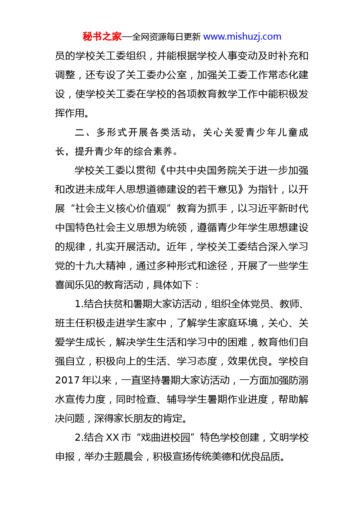 秘书之家—全网资源每日更新www.mishuzj.com学校关工委工作情况汇报近年来,XX学校关工委工作在校长室、党支部的领导下,以党的十九大精神为指针,以习近平新时代中国特色社会主义思想为引领,认真学习、落实教育部党组《关于加强全国教育系统关心下一代工作委员会建设的意见》及相关文件精神,以市教育局关工委工作意见为常规工作指导,坚持关工委“围绕中心、配合补充、因地制宜、量力而行、立足基层、注重实效”的工作方针,紧密结合学校中心工作,振奋精神、开拓进取,扎实有效地开展青少年思想道德建设工作,以社会主义核心价值体系提升青少年的综合素质,促进青少年健康成长,成效斐然,现就各项工作汇报如下:一、提高认识、健全机构,积极开展关工委工作常态化建设。学校党政对关工委工作比较重视,不仅注重关工委的自身建设,而且还组织学习了关于关工委工作的相关文件精神、中央主要领导的有关关工委工作的重要讲话和上级布置的有关工作要求。学校把关工委工作在列入学校工作计划的同时,结合学校的实际情况,健全关工委组织机构,组成了以校长为组长,以副校长、退休校级领导为副组长及相关在职学校主要领导、退休老党员、老教师为委秘书之家—全网资源每日更新www.mishuzj.com员的学校关工委组织,并能根据学校人事变动及时补充和调整,还专设了关工委办公室,加强关工委工作常态化建设,使学校关工委在学校的各项教育教学工作中能积极发挥作用。二、多形式开展各类活动,关心关爱青少年儿童成长,提升青少年的综合素养。学校关工委以贯彻《中共中央国务院关于进一步加强和改进未成年人思想道德建设的若干意见》为指针,以开展“社会主义核心价值观”教育为抓手,以习近平新时代中国特色社会主义思想为统领,遵循青少年学生思想建设的规律,扎实开展活动。近年,学校关工委结合深入学习党的十九大精神,通过多种形式和途径,开展了一些学生喜闻乐见的教育活动,具体如下:1.结合扶贫和暑期大家访活动,组织全体党员、教师、班主任积极走进学生家中,了解学生家庭环境,关心、关爱学生成长,解决学生生活和学习中的困难,教育他们自强自立,积极向上的生活、学习态度,效果优良。学校自2017年以来,一直坚持暑期大家访活动,一方面加强防溺水宣传力度,同时检查、辅导学生暑期作业进度,帮助解决问题,深得家长朋友的肯定。2.结合XX市“戏曲进校园”特色学校创建,文明学校申报,举办主题晨会,积极宣扬传统美德和优良品质。秘书之家—全网资源每日更新www.mishuzj.com3.按照教育局和管委会的要求,积极开展各种读书活动和征文活动,多位同学在活动中获奖,不仅陶冶了情操,同时也助力了学习,一举两得。4.结合传统节日文化教育,积极组织清明节祭扫烈士墓、六一文艺汇演、庆祝国庆等特色活动,更好的促进孩子们的健康成长。5.积极组织学生参与国家禁毒办和教育部联合开展的青少年禁毒知识竞赛,让学生了解毒品危害,远离毒品。2020年组织学生参加全国青少年禁毒知识竞赛获成绩突出,得到教育局领导表扬并获得优秀组织奖。通过国家宪法暨全国法制宣传周活动,教育青少年学生知法、懂法、守法,树立孩子们正确的法制观。通过校园反邪教集中宣传月活动,教育青少年远离邪教,树立正确的人生观和价值观,为学生思想健康成长保驾护航。精心组织质量进校园活动,树立国产品牌形象,培养学生支持国货的民族精神和爱国情结。经过各种活动的开展,积极关心、关爱孩子们的健康成长,帮助他们树立正确的价值观和人生观,培养孩子们各种优良品质和品德,效果优良。今后的工作中,我们会结合教育局和集团校相关活动要求,更踏实、细致地开展各项活动,把关工委工作真正落在实处,助力孩子们的健康成长。6.积极传承中华民族传统文化,增强学生艺术底蕴。在秘书之家—全网资源每日更新www.mishuzj.com校关工委的努力争取下,热心公益事业的企业家X先生慷慨解囊,捐赠专项资金3万元,学校于2018年5月成立了黄梅戏艺术班和舞蹈艺术班,弘扬经典戏曲文化,培养学生艺术素养;同时通过舞蹈训练,增进学生身体健康,助力学生身体成长。三、积极配合,完善“学校、家庭、社会”教育网络。家庭教育是未成年人教育的最重要环节之一。同时,家庭教育又是学校、社会教育的基础,良好的家庭教育,可以促进学生健康成长。家庭教育在青少年教育中的重要地位是无可替代的,所以学校为营造学生健康成长的良好环境,十分重视对家长的培训。家长学校就是对家长灌输正确教育理念的重要阵地。学校以家长学校举办的“家庭教育讲座”为平台,不仅为家长宣传了正确的教育理念,还为家长与教师提供了交流的机会,有利于搭建学校、家庭、社会三结合教育网络,深得家长们的认同和好评。通过家长学校与家长的广泛沟通,力争做到使学校教育全方位,家庭教育不缺位。2019年9月,X公司捐赠X多册图书,建立X爱心书屋,2020年,安徽大学图书馆X馆长捐赠一万元图书,改善师生的阅读条件。近年来学校关工委在上级部门关怀、支持下扎实工作,取得了极好的成绩,教育教学上:2019年X同学以高秘书之家—全网资源每日更新www.mishuzj.com分录取桐中国器班,2020年X再获桐中文科国器班,2021年23位同学参加中考,X统招4人,教育教学成绩位居全市前列,