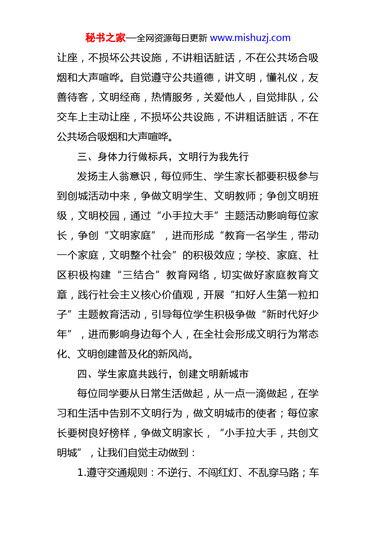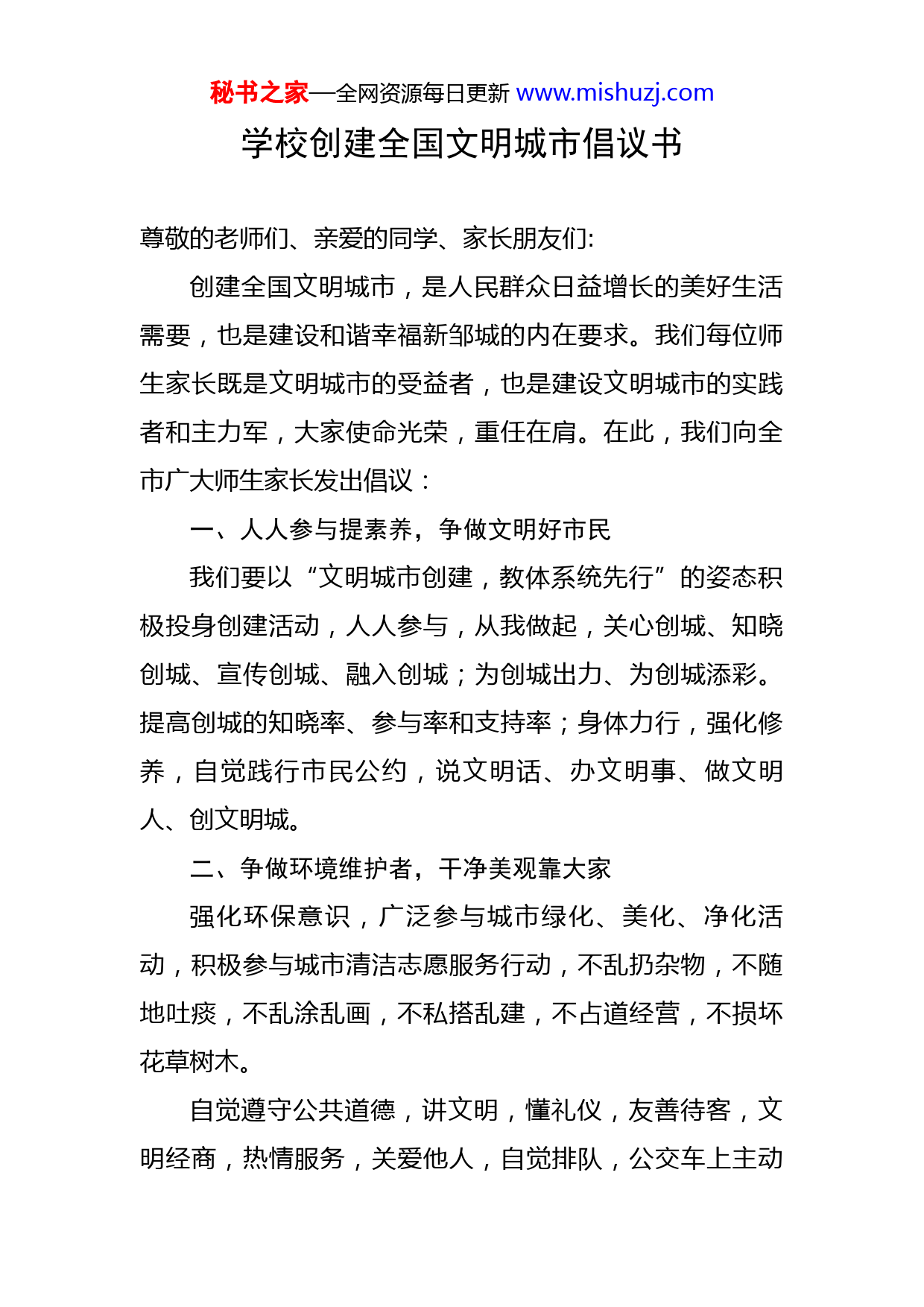 秘书之家—全网资源每日更新www.mishuzj.com学校创建全国文明城市倡议书尊敬的老师们、亲爱的同学、家长朋友们:创建全国文明城市,是人民群众日益增长的美好生活需要,也是建设和谐幸福新邹城的内在要求。我们每位师生家长既是文明城市的受益者,也是建设文明城市的实践者和主力军,大家使命光荣,重任在肩。在此,我们向全市广大师生家长发出倡议:一、人人参与提素养,争做文明好市民我们要以“文明城市创建,教体系统先行”的姿态积极投身创建活动,人人参与,从我做起,关心创城、知晓创城、宣传创城、融入创城;为创城出力、为创城添彩。提高创城的知晓率、参与率和支持率;身体力行,强化修养,自觉践行市民公约,说文明话、办文明事、做文明人、创文明城。二、争做环境维护者,干净美观靠大家强化环保意识,广泛参与城市绿化、美化、净化活动,积极参与城市清洁志愿服务行动,不乱扔杂物,不随地吐痰,不乱涂乱画,不私搭乱建,不占道经营,不损坏花草树木。自觉遵守公共道德,讲文明,懂礼仪,友善待客,文明经商,热情服务,关爱他人,自觉排队,公交车上主动秘书之家—全网资源每日更新www.mishuzj.com让座,不损坏公共设施,不讲粗话脏话,不在公共场合吸烟和大声喧哗。自觉遵守公共道德,讲文明,懂礼仪,友善待客,文明经商,热情服务,关爱他人,自觉排队,公交车上主动让座,不损坏公共设施,不讲粗话脏话,不在公共场合吸烟和大声喧哗。三、身体力行做标兵,文明行为我先行发扬主人翁意识,每位师生、学生家长都要积极参与到创城活动中来,争做文明学生、文明教师;争创文明班级,文明校园,通过“小手拉大手”主题活动影响每位家长,争创“文明家庭”,进而形成“教育一名学生,带动一个家庭,文明整个社会”的积极效应;学校、家庭、社区积极构建“三结合”教育网络,切实做好家庭教育文章,践行社会主义核心价值观,开展“扣好人生第一粒扣子”主题教育活动,引导每位学生积极争做“新时代好少年”,进而影响身边每个人,在全社会形成文明行为常态化、文明创建普及化的新风尚。四、学生家庭共践行,创建文明新城市每位同学要从日常生活做起,从一点一滴做起,在学习和生活中告别不文明行为,做文明城市的使者;每位家长要树良好榜样,争做文明家长,“小手拉大手,共创文明城”,让我们自觉主动做到:1.遵守交通规则:不逆行、不闯红灯、不乱穿马路;车秘书之家—全网资源每日更新www.mishuzj.com辆不乱停乱放;机动车礼让行人,不随意加塞,不车窗抛物。2.维护公共秩序:礼貌待人,举止文明,着装得体,不大声喧哗,排队有序礼让,乘车主动让座。3.爱护环境卫生:不随地吐痰,不乱扔垃圾;不在公共场所吸烟,不乱扔烟头;依规佩戴口罩,公共场所守公德,不损坏公共设施。4.遵守社区规约:不在小区公共区域私搭乱建、堆放杂物;不向室外抛物;文明养犬,遛狗牵绳不扰民,宠物粪便及时清。5.树立良好家风:少玩手机,多看书学习;崇尚节约,爱惜粮食,落实“光盘”行动;家庭和睦,孝老爱亲;传承好家风,谨守好家训;争做志愿者,弘扬正能量。老师们、同学们、家长朋友们,创建文明城市,人人有责,让我们立即行动起来,怀热情和真诚之心,以文明和谐为伴,从我做起、从现在做起、从身边的小事做起,积极投身到创建文明城市的实践之中,共建共享一座优美的城市,共同拥有一个温馨的家园!X市第一中学2022年X月X日