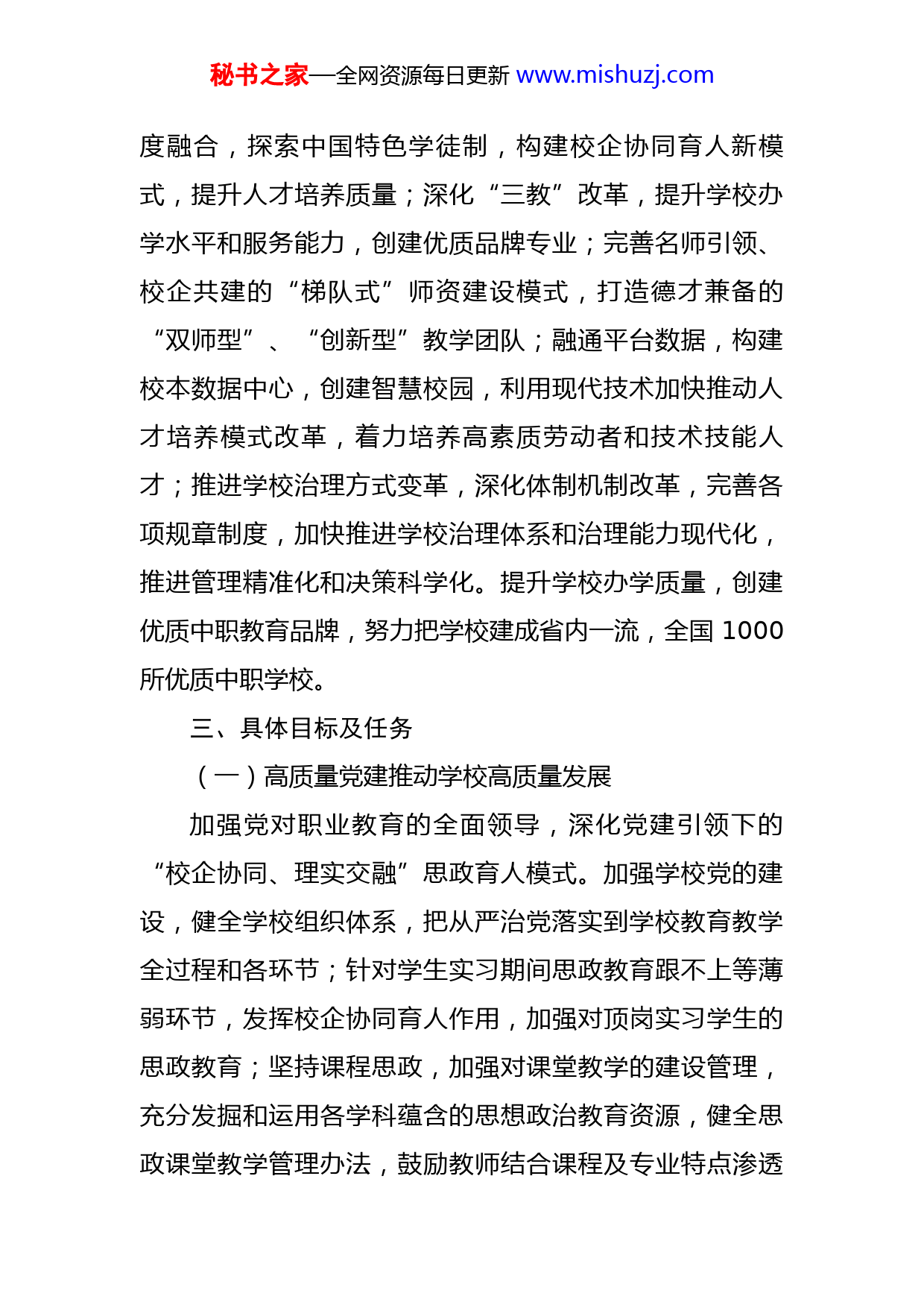 秘书之家—全网资源每日更新www.mishuzj.com学校提质培优(2021-2023)三年行动计划校各科室(部门):为贯彻落实《国家职业教育改革实施方案》、《职业教育提质培优行动计划(2020-2023年)》,围绕学校中心工作,实现某省中职旗舰校、全国优质中职学校的奋斗目标,进一步提升学校内涵发展水平,结合我校实际,现制定学校提质培优三年行动计划。一、指导思想以习近平新时代中国特色社会主义思想为指导,落实《中国教育现代化2035》《国家职业教育改革实施方案》,对照《职业教育提质培优行动计划(2020-2023年)》(教职成〔2020〕7号),把握中等职业教育的基础地位,聚焦具体问题,以促进就业和适应产业发展需求为导向,贯彻落实立德树人根本任务,聚力“提质培优、增值赋能”,努力打造某省中职旗舰校,创建全国优质中职学校。二、发展目标坚持立德树人根本任务,以高质量党建推动学校高质量职业教育发展;深化“三全育人”实施方案,完善“三全育人”格局,建设“三全育人”学校;加强学校文化建设,形成职业教育特色鲜明的优质品牌文化;推进校企深秘书之家—全网资源每日更新www.mishuzj.com度融合,探索中国特色学徒制,构建校企协同育人新模式,提升人才培养质量;深化“三教”改革,提升学校办学水平和服务能力,创建优质品牌专业;完善名师引领、校企共建的“梯队式”师资建设模式,打造德才兼备的“双师型”、“创新型”教学团队;融通平台数据,构建校本数据中心,创建智慧校园,利用现代技术加快推动人才培养模式改革,着力培养高素质劳动者和技术技能人才;推进学校治理方式变革,深化体制机制改革,完善各项规章制度,加快推进学校治理体系和治理能力现代化,推进管理精准化和决策科学化。提升学校办学质量,创建优质中职教育品牌,努力把学校建成省内一流,全国1000所优质中职学校。三、具体目标及任务(一)高质量党建推动学校高质量发展加强党对职业教育的全面领导,深化党建引领下的“校企协同、理实交融”思政育人模式。加强学校党的建设,健全学校组织体系,把从严治党落实到学校教育教学全过程和各环节;针对学生实习期间思政教育跟不上等薄弱环节,发挥校企协同育人作用,加强对顶岗实习学生的思政教育;坚持课程思政,加强对课堂教学的建设管理,充分发掘和运用各学科蕴含的思想政治教育资源,健全思政课堂教学管理办法,鼓励教师结合课程及专业特点渗透秘书之家—全网资源每日更新www.mishuzj.com思政教育;上好思政课程,开展丰富多样的主题活动,丰富思政教育形式,提升思政教育效果。具体任务:1.按照师生比不低于1:350的比例核定专职思政课教师岗位。2.培训5名德育骨干管理人员、思政课专任教师。3.培育1个思想政治课教学创新团队。4.遴选1个思想政治课示范课堂。5.遴选5个具有职业教育特点的课程思政教育案例。(责任部门:党政办、教务科、学工部、宣教科、基础部、各专业部)(二)加强“三全育人”思想政治工作围绕立德树人的中心环节,充分发挥“全员”力量,认真研究“全程”育人渠道,积极探索“全方位”的育人方法,构建“三全育人”的思想政治教育工作体系。强化全员育人责任,汇聚更广泛的力量参与全员育人,重点是加强社团建设和朋辈教育,吸收学生参与到学校的管理服务工作中,让学生真正成为学校的主人翁;抓好学生成长的关键环节,把五育工作融入到大学四年的人才培养工作当中去,根据不同年级学生的特点,根据他们学习、成长的规律,开展分层次、有针对性的思想政治教育工作;营造全方位育人环境,营造“一草一木皆育人”的环境氛秘书之家—全网资源每日更新www.mishuzj.com围,公共场所的环境建设和管理服务内容中体现育人要素,构建“大思政”格局。具体任务:1.建设“三全育人”典型学校。2.形成1个德育特色案例。(责任部门:党政办、教务科、学工部、宣教科、基础部、各专业部)(三)提升办学水平,改善办学条件1.拓展学校办学空间。创新校企合作新模式,构建多元办学新格局,拓展学校教学场地;合理规划现有土地,充分挖掘校园潜力,实施活动板房项目,启动综合实训楼建设项目;争取上级主管部门支持,积极报名省上的职教园区建设。具体任务:实现校园面积、建筑面积、运动场达标。(责任部门:基建办、后勤服务中心)2.适应现代职业教育,改善学生实训条件。改变目前校内部分实训设备陈旧、工位不足现状,推进实训设施设备功能提升、更新换代,更好的满足学生实训、大赛训练、1+X证书制度试点、承办赛事、技能考证、职业培训、项目建设等需求;多措并举推进校内新增实训室建设,通过争取财政增加生均拨款,申请专项资金、追加专项投入、扩大学校自筹、深化校企合作引入企业设备等多秘书之家—全网资源每日更新www.mishuzj.com种渠道投入,提升实训条件;完善校内实训管理,规范设备保养维护,降低设备损坏和耗材损耗,提高设施设备使用效率。深化校企合作,加强校外实训实习基地建设,建立稳定的学生实训实习和教师企业实践基地,推进校企协同育人。具体任务:建成国家级产教融合实训基地1个。(责任部门:实验实训中心、招就办、校企合作部、财务科)3.加快信息化建设。落实教育部关于发布《职业院校数字校园规范》的通知(陕教职成函〔2020〕3号)要求,制定智慧校园建设方案,提升信息化基