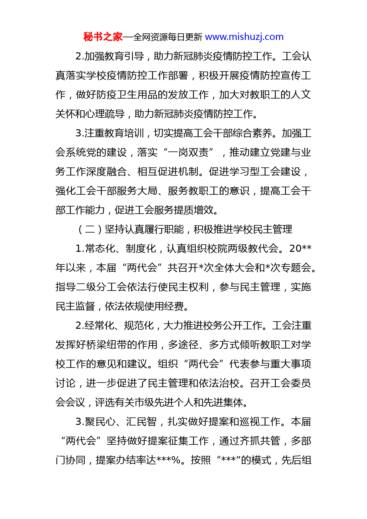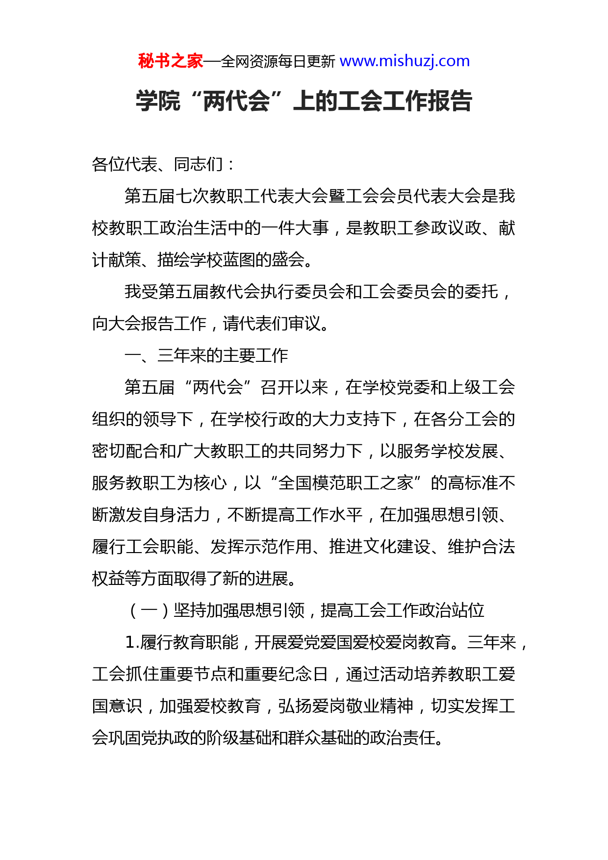 秘书之家—全网资源每日更新www.mishuzj.com学院“两代会”上的工会工作报告各位代表、同志们:第五届七次教职工代表大会暨工会会员代表大会是我校教职工政治生活中的一件大事,是教职工参政议政、献计献策、描绘学校蓝图的盛会。我受第五届教代会执行委员会和工会委员会的委托,向大会报告工作,请代表们审议。一、三年来的主要工作第五届“两代会”召开以来,在学校党委和上级工会组织的领导下,在学校行政的大力支持下,在各分工会的密切配合和广大教职工的共同努力下,以服务学校发展、服务教职工为核心,以“全国模范职工之家”的高标准不断激发自身活力,不断提高工作水平,在加强思想引领、履行工会职能、发挥示范作用、推进文化建设、维护合法权益等方面取得了新的进展。(一)坚持加强思想引领,提高工会工作政治站位1.履行教育职能,开展爱党爱国爱校爱岗教育。三年来,工会抓住重要节点和重要纪念日,通过活动培养教职工爱国意识,加强爱校教育,弘扬爱岗敬业精神,切实发挥工会巩固党执政的阶级基础和群众基础的政治责任。秘书之家—全网资源每日更新www.mishuzj.com2.加强教育引导,助力新冠肺炎疫情防控工作。工会认真落实学校疫情防控工作部署,积极开展疫情防控宣传工作,做好防疫卫生用品的发放工作,加大对教职工的人文关怀和心理疏导,助力新冠肺炎疫情防控工作。3.注重教育培训,切实提高工会干部综合素养。加强工会系统党的建设,落实“一岗双责”,推动建立党建与业务工作深度融合、相互促进机制。促进学习型工会建设,强化工会干部服务大局、服务教职工的意识,提高工会干部工作能力,促进工会服务提质增效。(二)坚持认真履行职能,积极推进学校民主管理1.常态化、制度化,认真组织校院两级教代会。20年以来,本届“两代会”共召开次全体大会和次专题会。指导二级分工会依法行使民主权利,参与民主管理,实施民主监督,依法依规使用经费。2.经常化、规范化,大力推进校务公开工作。工会注重发挥好桥梁纽带的作用,多途径、多方式倾听教职工对学校工作的意见和建议。组织“两代会”代表参与重大事项讨论,进一步促进了民主管理和依法治校。召开工会委员会会议,评选有关市级先进个人和先进集体。3.聚民心、汇民智,扎实做好提案和巡视工作。本届“两代会”坚持做好提案征集工作,通过齐抓共管,多部门协同,提案办结率达%。按照“”的模式,先后组秘书之家—全网资源每日更新www.mishuzj.com成个巡视组,分别对相关职能部门进行了巡视,达到了“充分沟通、互相理解、协调一致、促进发展”的目的。(三)坚持发挥示范作用,扎实推进师德师风建设1.弘扬劳模精神,汲取榜样力量。工会坚持将“创新工作室”作为深入开展群众性技术创新活动的重要平台,作为进一步激发广大教职工创新创造活力的有效载体,努力发挥好它的示范引领作用。2.选树先进典型,推进师德建设。工会有序组织各类先进典型的推选工作,弘扬高尚师德师风,助推教师素质提升。先后获得市“三八红旗集体”、“五一巾帼标兵岗”、“巾帼岗位明星”、“五一巾帼标兵”、“最美女职工”提名奖、职教工作“先进个人”等荣誉。3.开展技能竞赛,助推素质提升。积极组织和鼓励教师参加校内外教育教学竞赛活动,助推教职工素质提升,维护教职工的发展权益。在全省本科高校青年教师教学竞赛中多次获奖。重视培育教职工科技创新成果。(四)坚持推进文化建设,提升金科人满意度1.加强“小家”建设,成就幸福金科人。在各级工会组织的共同努力下,学校形成了“模范职工小家”从国家级到校级全覆盖的格局。获评国家级“模范职工小家”个。践行新时代家庭观、弘扬社会主义家庭文明新风尚,开展“好家风、好家训、好家书”和“最美家庭”评选活动。秘书之家—全网资源每日更新www.mishuzj.com每年开展“六一”亲子活动、提供中考体测项目专项辅导以及组织暑期夏令营、录制少儿网上课程等,让教职工及其子女深切感受到学校的关爱关怀。2.发挥俱乐部作用,塑造健康金科人。工会加强教工俱乐部建设,支持个俱乐部开展活动多场。营造“多读书、读好书”的校园文化氛围,校“职工书屋”获评省总工会“职工书屋”示范点;个不同类的运动俱乐部更是让“全民健身,幸福人生”的理念深入人心。3.开展主题活动,展现最美金科人。重要节点开展的主题活动,如师生新年音乐会、“新年纳福写福字”活动、摄影大赛、朗诵比赛和书法比赛等,彰显了教职工的爱国爱校情怀,充分展示了金科教师的风采。(五)坚持维护合法权益,建设平安和谐校园1.开展“安康杯”竞赛活动,构筑安全防护网。积极开展“安康杯”竞赛活动,通过宣传、竞赛、检查实验室和关心慰问危化品管理员等多种形式,增强教职工的安全意识和责任意识。学校连续三年被评为市科教卫体系统“安康杯”竞赛优胜单位。2.落实“三双”集体协议,推进关爱帮扶工作。学校行政和工会认真落实《科技学院“三双”集体协议》,确保“双支持、双维护、双保证”学校的整体利益与教职工的合法权益。一是学校行政支持工会开展创建“职工小秘书之家—全网资源每日更新www.mishuzj.com家”活动。二是每年组织教职工体检。三是做好慰问帮扶多渠道多方式地把温暖送到