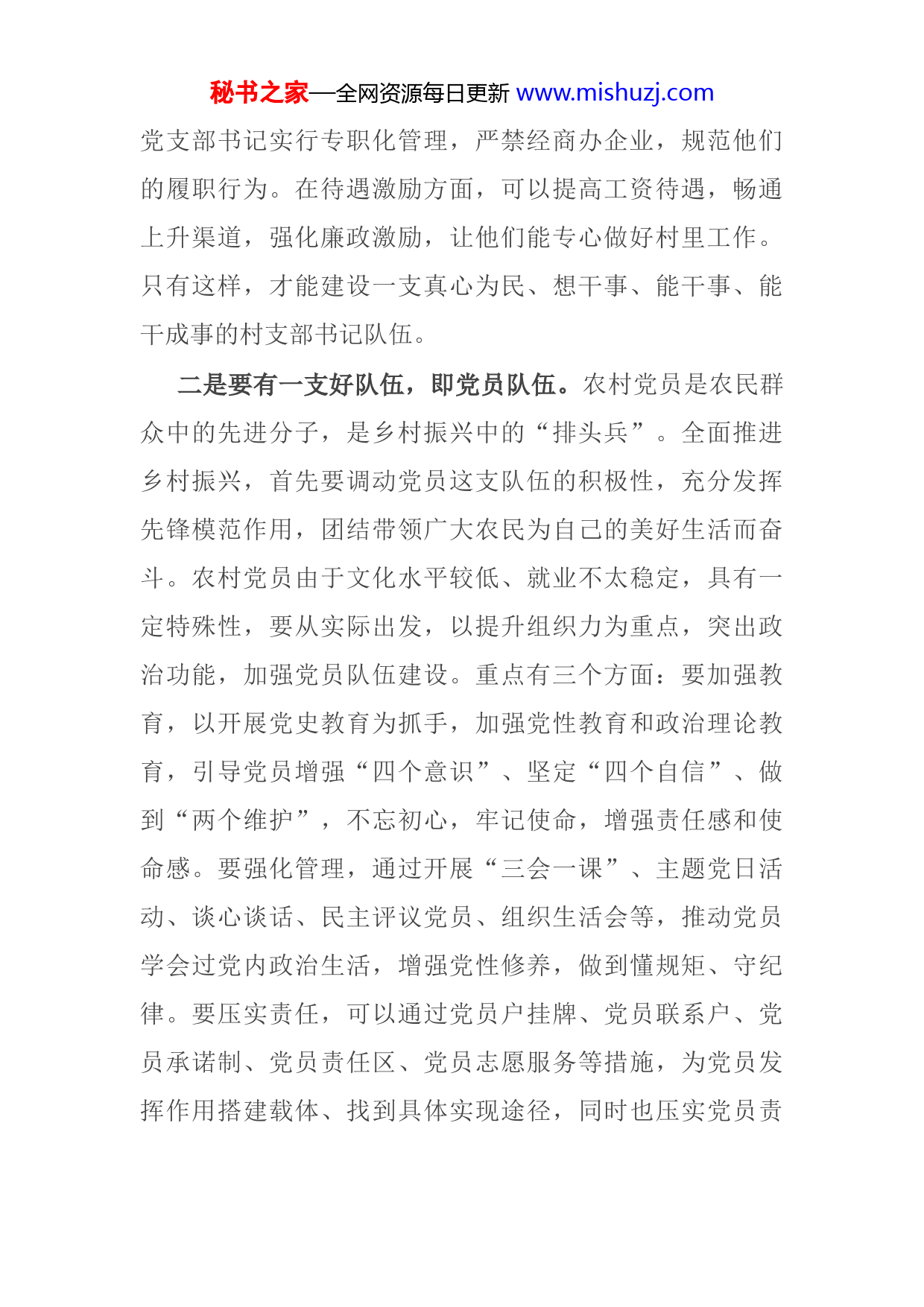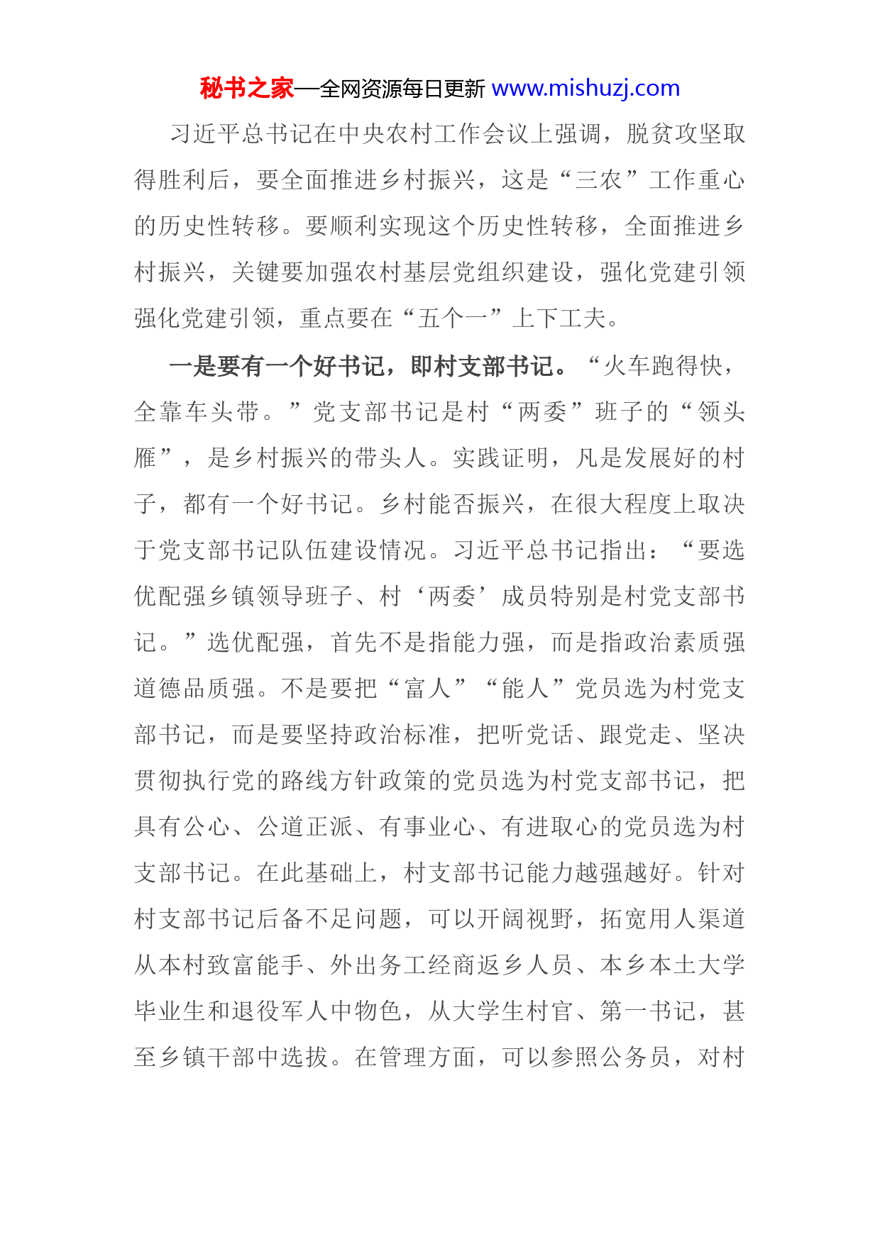 秘书之家—全网资源每日更新www.mishuzj.com习近平总书记在中央农村工作会议上强调,脱贫攻坚取得胜利后,要全面推进乡村振兴,这是“三农”工作重心的历史性转移。要顺利实现这个历史性转移,全面推进乡村振兴,关键要加强农村基层党组织建设,强化党建引领强化党建引领,重点要在“五个一”上下工夫。一是要有一个好书记,即村支部书记。“火车跑得快,全靠车头带。”党支部书记是村“两委”班子的“领头雁”,是乡村振兴的带头人。实践证明,凡是发展好的村子,都有一个好书记。乡村能否振兴,在很大程度上取决于党支部书记队伍建设情况。习近平总书记指出:“要选优配强乡镇领导班子、村‘两委’成员特别是村党支部书记。”选优配强,首先不是指能力强,而是指政治素质强道德品质强。不是要把“富人”“能人”党员选为村党支部书记,而是要坚持政治标准,把听党话、跟党走、坚决贯彻执行党的路线方针政策的党员选为村党支部书记,把具有公心、公道正派、有事业心、有进取心的党员选为村支部书记。在此基础上,村支部书记能力越强越好。针对村支部书记后备不足问题,可以开阔视野,拓宽用人渠道从本村致富能手、外出务工经商返乡人员、本乡本土大学毕业生和退役军人中物色,从大学生村官、第一书记,甚至乡镇干部中选拔。在管理方面,可以参照公务员,对村秘书之家—全网资源每日更新www.mishuzj.com党支部书记实行专职化管理,严禁经商办企业,规范他们的履职行为。在待遇激励方面,可以提高工资待遇,畅通上升渠道,强化廉政激励,让他们能专心做好村里工作。只有这样,才能建设一支真心为民、想干事、能干事、能干成事的村支部书记队伍。二是要有一支好队伍,即党员队伍。农村党员是农民群众中的先进分子,是乡村振兴中的“排头兵”。全面推进乡村振兴,首先要调动党员这支队伍的积极性,充分发挥先锋模范作用,团结带领广大农民为自己的美好生活而奋斗。农村党员由于文化水平较低、就业不太稳定,具有一定特殊性,要从实际出发,以提升组织力为重点,突出政治功能,加强党员队伍建设。重点有三个方面:要加强教育,以开展党史教育为抓手,加强党性教育和政治理论教育,引导党员增强“四个意识”、坚定“四个自信”、做到“两个维护”,不忘初心,牢记使命,增强责任感和使命感。要强化管理,通过开展“三会一课”、主题党日活动、谈心谈话、民主评议党员、组织生活会等,推动党员学会过党内政治生活,增强党性修养,做到懂规矩、守纪律。要压实责任,可以通过党员户挂牌、党员联系户、党员承诺制、党员责任区、党员志愿服务等措施,为党员发挥作用搭建载体、找到具体实现途径,同时也压实党员责秘书之家—全网资源每日更新www.mishuzj.com任,督促党员为村里做贡献,引导党员干在实处、走在前列,充分发挥先锋模范作用。三是要有一条好路子,即发展集体经济。加强农村基层党组织建设,不是为了加强而加强,而是为了提升服务农民能力,带领村民增收致富。实践证明,一个没有集体经济的党组织,一个不能带领村民增收致富的党组织,是没有吸引力、凝聚力和号召力的,党员和群众都不会跟着走的。所以,必须发展新型集体经济。发展集体经济,要重点把握三点:要从各村实际出发,因地制宜,尽量发展特色经济。要选准产业,汇聚各方资源,重点突破。对一个村子来说,有一个产业或一个项目,实现“一村一品”,就基本上能发展起来了。要找到利益平衡点。目前新型集体经济发展模式有很多,有资源开发型、物业经营型、资产盘活型、资本运营型等。这些模式都有一个共同特点,就是找准了切入点,通过市场运营,实现了集体资产增值实现了村集体、村民和经营者等多方共赢。因此,发展新型集体经济,关键是要找准切入点,找到各方利益的平衡点。四是要有一套好制度,即实现规范运行。强化党建引领,全面推进乡村振兴,制度建设是保障。有了集体经济作为基础,制度建设才管用,才有人遵守。要结合自身实际,秘书之家—全网资源每日更新www.mishuzj.com以党建制度化规范化程序化建设为牵引,建立一套切实管用的制度体系。要推进党支部工作规范化建设。贯彻落实《中国共产党支部工作条例(试行)》《中国共产党党员教育管理工作条例》《中国共产党农村基层组织工作条例》等,结合本村实际,围绕“三会一课”、主题党日、谈心谈话、民主评议、组织生活会、党费收缴等主要内容制定规章制度,推动党支部工作制度化规范化程序化,保证党内生活规范有序开展。要推动村委会相关制度建设。完善村民代表会议制度,健全以“四议一审两公开”为核心的村级民主决策机制,完善基层协商,真正做到村里的事大家商量着办、大家说了算。完善村级监督制度,制定党务公开、村务公开、财务公开规定,细化“三务公开”内容程序等,引导村民有序参与村务管理,加强对党支部村委会监督。建立村干部述职述廉制度,发挥村务监督委员会监督作用,保证村务在阳光下高效运行。五是要有一个好治理,即实现乡村善治。强化党建引领,实现乡村振兴,治理很重要,善治是目标。习近平总书记指出:“要加强和改进乡村治理,加快构建党组织领导的乡村治理体系,深入推进平安乡村建设,创新乡村治理方式,提高乡村善治水平。”要实现乡村善