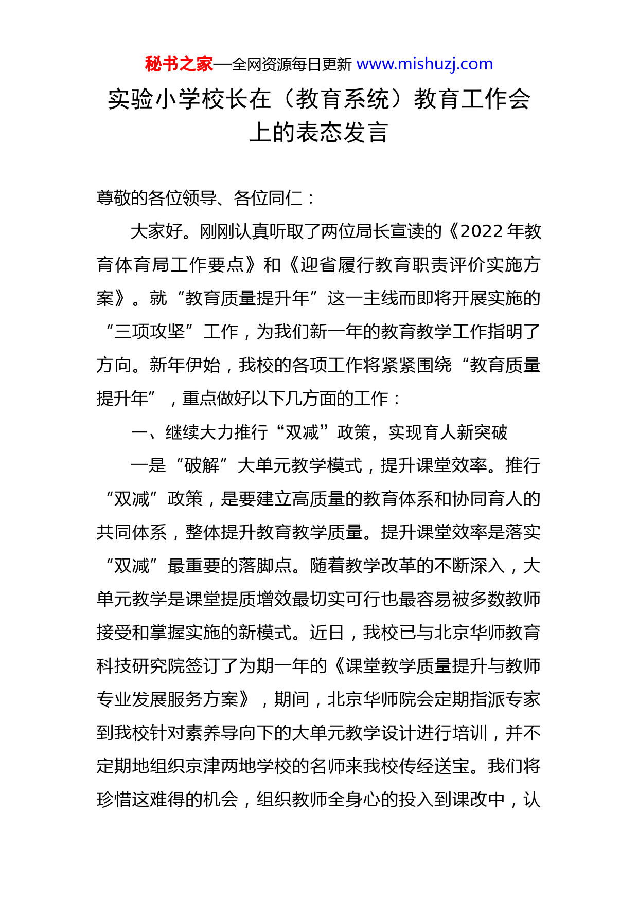 秘书之家—全网资源每日更新www.mishuzj.com实验小学校长在(教育系统)教育工作会上的表态发言尊敬的各位领导、各位同仁:大家好。刚刚认真听取了两位局长宣读的《2022年教育体育局工作要点》和《迎省履行教育职责评价实施方案》。就“教育质量提升年”这一主线而即将开展实施的“三项攻坚”工作,为我们新一年的教育教学工作指明了方向。新年伊始,我校的各项工作将紧紧围绕“教育质量提升年”,重点做好以下几方面的工作:一、继续大力推行“双减”政策,实现育人新突破一是“破解”大单元教学模式,提升课堂效率。推行“双减”政策,是要建立高质量的教育体系和协同育人的共同体系,整体提升教育教学质量。提升课堂效率是落实“双减”最重要的落脚点。随着教学改革的不断深入,大单元教学是课堂提质增效最切实可行也最容易被多数教师接受和掌握实施的新模式。近日,我校已与北京华师教育科技研究院签订了为期一年的《课堂教学质量提升与教师专业发展服务方案》,期间,北京华师院会定期指派专家到我校针对素养导向下的大单元教学设计进行培训,并不定期地组织京津两地学校的名师来我校传经送宝。我们将珍惜这难得的机会,组织教师全身心的投入到课改中,认秘书之家—全网资源每日更新www.mishuzj.com真学习大单元教学模式,努力构建课堂新生态,提升课堂教学效率。二是“开拓”课后延时新内容,促进学生全面发展。根据国家“双减”政策要求,新学期我校将继续制定出促进学生基础发展的共性课程与促进个性发展的特色课程,推动课后延时服务项目不断创新。我校将依托家委会、社会专业人士、校外活动场所等建立多样化的优质课后服务团队。本学期计划开展自主阅读、创客空间、劳动科普等活动项目。同时还将成立校内课后延时服务调研工作小组,积极收集并回复师生及家长意见建议,设立课后延时服务专项监督举报电话,实行“线上+线下”联动监管。二、强化校园安全保障意识,落实疫情防控工作下一步我校将继续全面加强平安校园建设。首先全面落实校园安全工作责任制,建立健全人防、技防、物防的“三防”体系,深化学生学习、生活、活动、出行等全方位的安全管理,深入开展安全隐患排查以及各类安全逃生演练活动,杜绝安全责任事故发生。其次高度重视学生心理健康问题,充分关心问题家庭、问题学生的心理健康,做到密切关注、细心关怀、耐心疏导。同时按照防疫要求,做好开学前防控预案和教室等场所的消杀工作,各项准备工作做细、做实、做足,不留死角,确保春季开学工作安全、稳定、有序地开展。秘书之家—全网资源每日更新www.mishuzj.com三、推进“书香校园”活动,提高师生阅读能力下一步,我校还将继续纵深推进学校特色建设,努力创建“书香校园”,全面提高师生的阅读能力。主要做到“五有”:加强硬件建设,保证师生有地方读书;充实图书资源,保证师生有好书阅读;选择读书内容,保证师生有目的读书;设置阅读时间,保证师生有时间读书;开展读书活动,保证师生有兴趣读书。总之,下一步,我校全体教师将凭借不折不挠的斗志、不懈不怠的恒心、务实求真的态度和脚踏实地的作风,把一实小的各项工作做得更好,不辜负教育体育局及局领导的殷切期望!谢谢大家!
