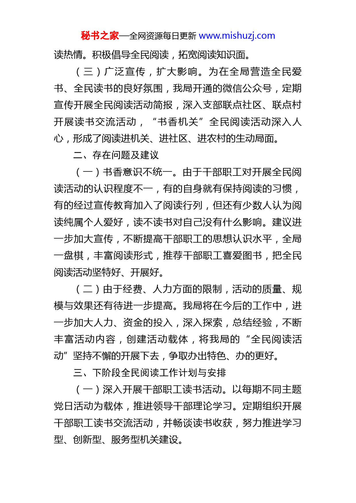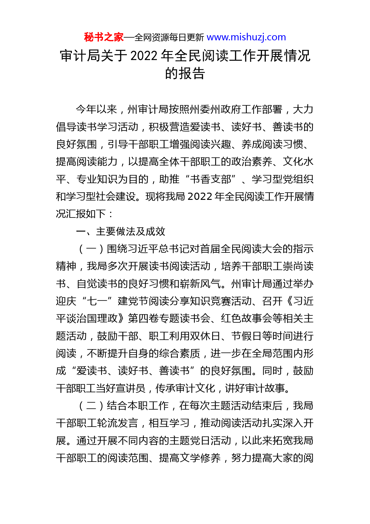 秘书之家—全网资源每日更新www.mishuzj.com审计局关于2022年全民阅读工作开展情况的报告今年以来,州审计局按照州委州政府工作部署,大力倡导读书学习活动,积极营造爱读书、读好书、善读书的良好氛围,引导干部职工增强阅读兴趣、养成阅读习惯、提高阅读能力,以提高全体干部职工的政治素养、文化水平、专业知识为目的,助推“书香支部”、学习型党组织和学习型社会建设。现将我局2022年全民阅读工作开展情况汇报如下:一、主要做法及成效(一)围绕习近平总书记对首届全民阅读大会的指示精神,我局多次开展读书阅读活动,培养干部职工崇尚读书、自觉读书的良好习惯和崭新风气。州审计局通过举办迎庆“七一”建党节阅读分享知识竞赛活动、召开《习近平谈治国理政》第四卷专题读书会、红色故事会等相关主题活动,鼓励干部、职工利用双休日、节假日等时间进行阅读,不断提升自身的综合素质,进一步在全局范围内形成“爱读书、读好书、善读书”的良好氛围。同时,鼓励干部职工当好宣讲员,传承审计文化,讲好审计故事。(二)结合本职工作,在每次主题活动结束后,我局干部职工轮流发言,相互学习,推动阅读活动扎实深入开展。通过开展不同内容的主题党日活动,以此来拓宽我局干部职工的阅读范围、提高文学修养,努力提高大家的阅秘书之家—全网资源每日更新www.mishuzj.com读热情。积极倡导全民阅读,拓宽阅读知识面。(三)广泛宣传,扩大影响。为在全局营造全民爱书、全民读书的良好氛围,我局开通的微信公众号,定期宣传开展全民阅读活动简报,深入支部联点社区、联点村开展读书交流活动,“书香机关”全民阅读活动深入人心,形成了阅读进机关、进社区、进农村的生动局面。二、存在问题及建议(一)书香意识不统一。由于干部职工对开展全民阅读活动的认识程度不一,有的自身就有保持阅读的习惯,有的经过宣传教育加入了阅读行列,但还有少数人认为阅读纯属个人爱好,读不读书对自己没有什么影响。建议进一步加大宣传,不断提高干部职工的思想认识水平,全局一盘棋,丰富阅读形式,推荐干部职工喜爱图书,把全民阅读活动坚特好、开展好。(二)由于经费、人力方面的限制,活动的质量、规模与效果还有待进一步提高。我局将在今后的工作中,进一步加大人力、资金的投入,深入探索,总结经验,不断丰富活动内容,创建活动载体,将我局的“全民阅读活动”坚持不懈的开展下去,争取办出特色、办的更好。三、下阶段全民阅读工作计划与安排(一)深入开展干部职工读书活动。以每期不同主题党日活动为载体,推进领导干部理论学习。定期组织开展干部职工读书交流活动,并畅谈读书收获,努力推进学习型、创新型、服务型机关建设。秘书之家—全网资源每日更新www.mishuzj.com(二)定期推介重点阅读书目。按照州委州政府重点推荐书目,结合全州当前的中心工作和重点工作和我局实际,每季度向全局干部职工推介重点阅读书目。(三)组织开展文化扶贫活动。结合联点村文化扶贫政策,为联点村贫困户赠送报刊、杂志,让贫困群众共享文化大餐。(四)开展书香竞赛评比活动。在全局开展五好文明家庭、优秀书香家庭评选,鼓励广大家庭常读书,读好书,不断提高广大职工家庭成员的素质,促进职工家庭文明建设。(五)营造浓厚阅读氛围。以读书人物为重点,唱响弘扬文化、特色文化的主旋律,营造良好的读书氛围,不断把全民阅读活动引向深入。