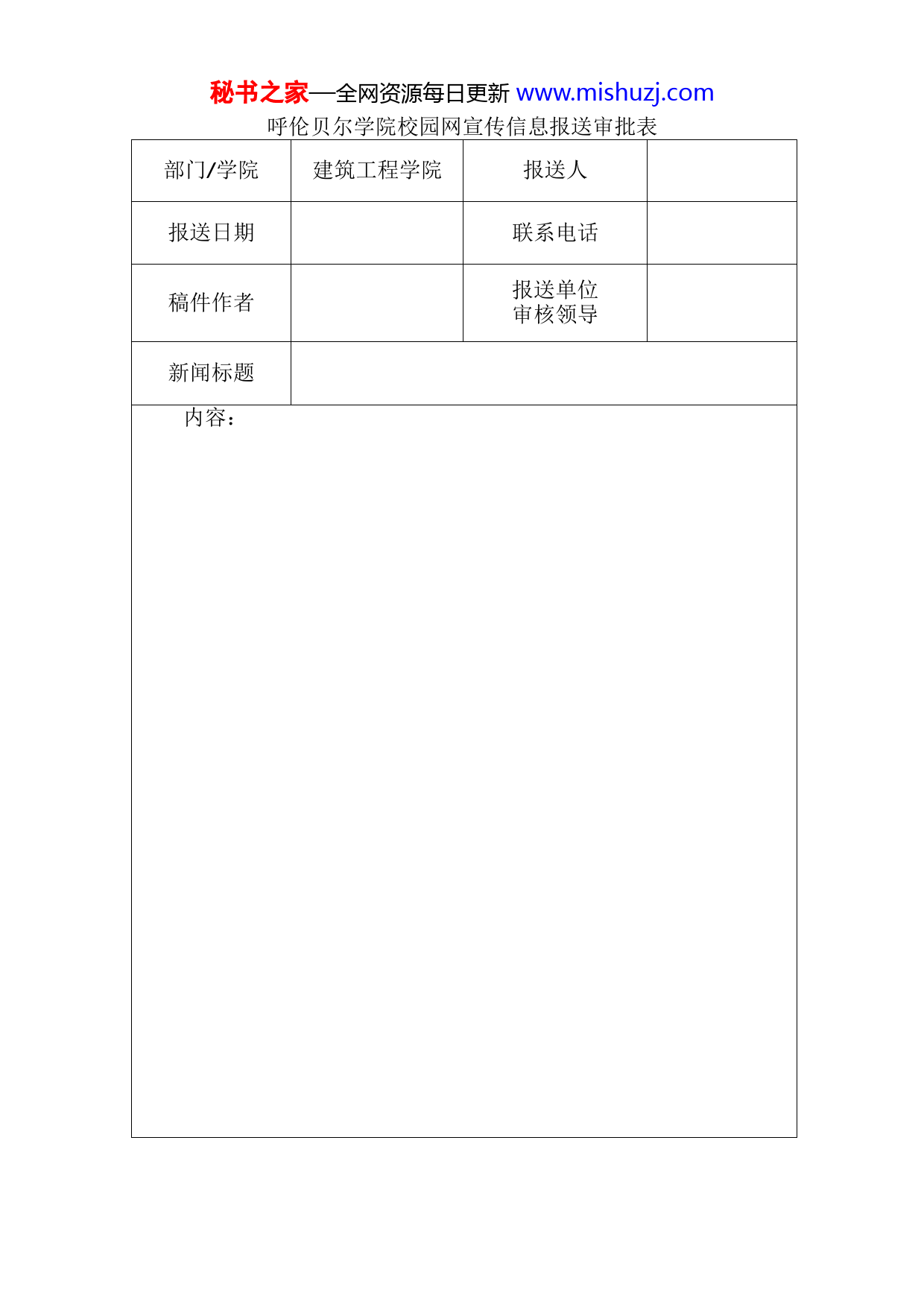 秘书之家—全网资源每日更新www.mishuzj.com呼伦贝尔学院校园网宣传信息报送审批表部门/学院建筑工程学院报送人报送日期联系电话稿件作者报送单位审核领导新闻标题内容:秘书之家—全网资源每日更新www.mishuzj.com