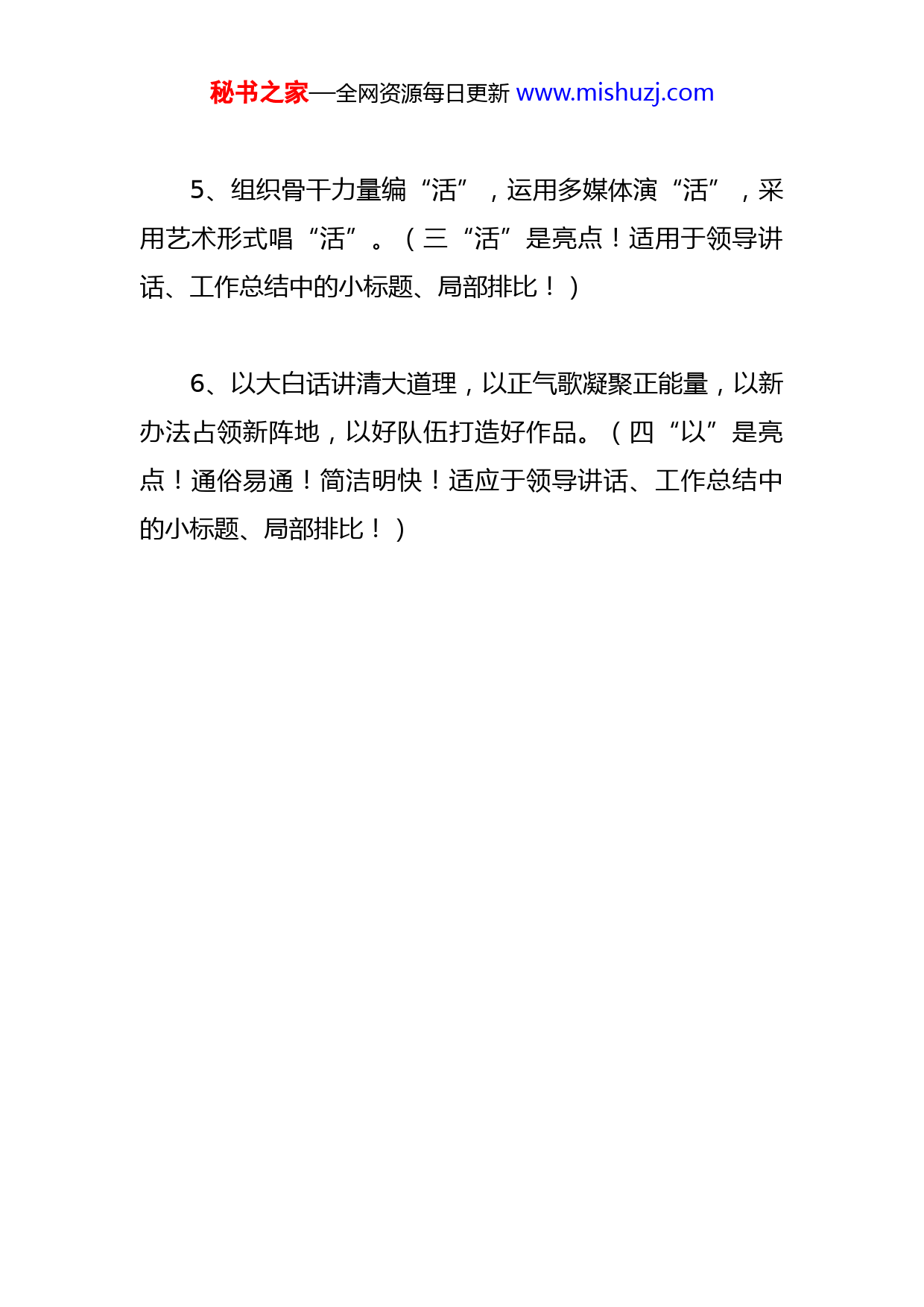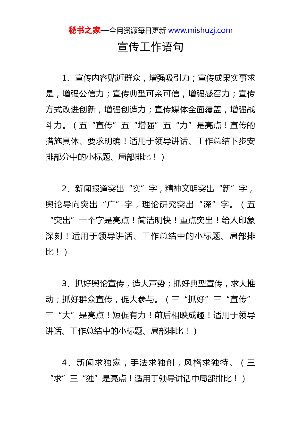 秘书之家—全网资源每日更新www.mishuzj.com宣传工作语句1、宣传内容贴近群众,增强吸引力;宣传成果实事求是,增强公信力;宣传典型可亲可信,增强感召力;宣传方式改进创新,增强创造力;宣传媒体全面覆盖,增强战斗力。(五“宣传”五“增强”五“力”是亮点!宣传的措施具体、要求明确!适用于领导讲话、工作总结下步安排部分中的小标题、局部排比!)2、新闻报道突出“实”字,精神文明突出“新”字,舆论导向突出“广”字,理论研究突出“深”字。(五“突出”一个字是亮点!简洁明快!重点突出!给人印象深刻!适用于领导讲话、工作总结中的小标题、局部排比!)3、抓好舆论宣传,造大声势;抓好典型宣传,求大推动;抓好群众宣传,促大参与。(三“抓好”三“宣传”三“大”是亮点!短促有力!前后相映成趣!适用于领导讲话、工作总结中的小标题、局部排比!)4、新闻求独家,手法求独创,风格求独特。(三“求”三“独”是亮点!适用于领导讲话中局部排比!)秘书之家—全网资源每日更新www.mishuzj.com5、组织骨干力量编“活”,运用多媒体演“活”,采用艺术形式唱“活”。(三“活”是亮点!适用于领导讲话、工作总结中的小标题、局部排比!)6、以大白话讲清大道理,以正气歌凝聚正能量,以新办法占领新阵地,以好队伍打造好作品。(四“以”是亮点!通俗易通!简洁明快!适应于领导讲话、工作总结中的小标题、局部排比!)