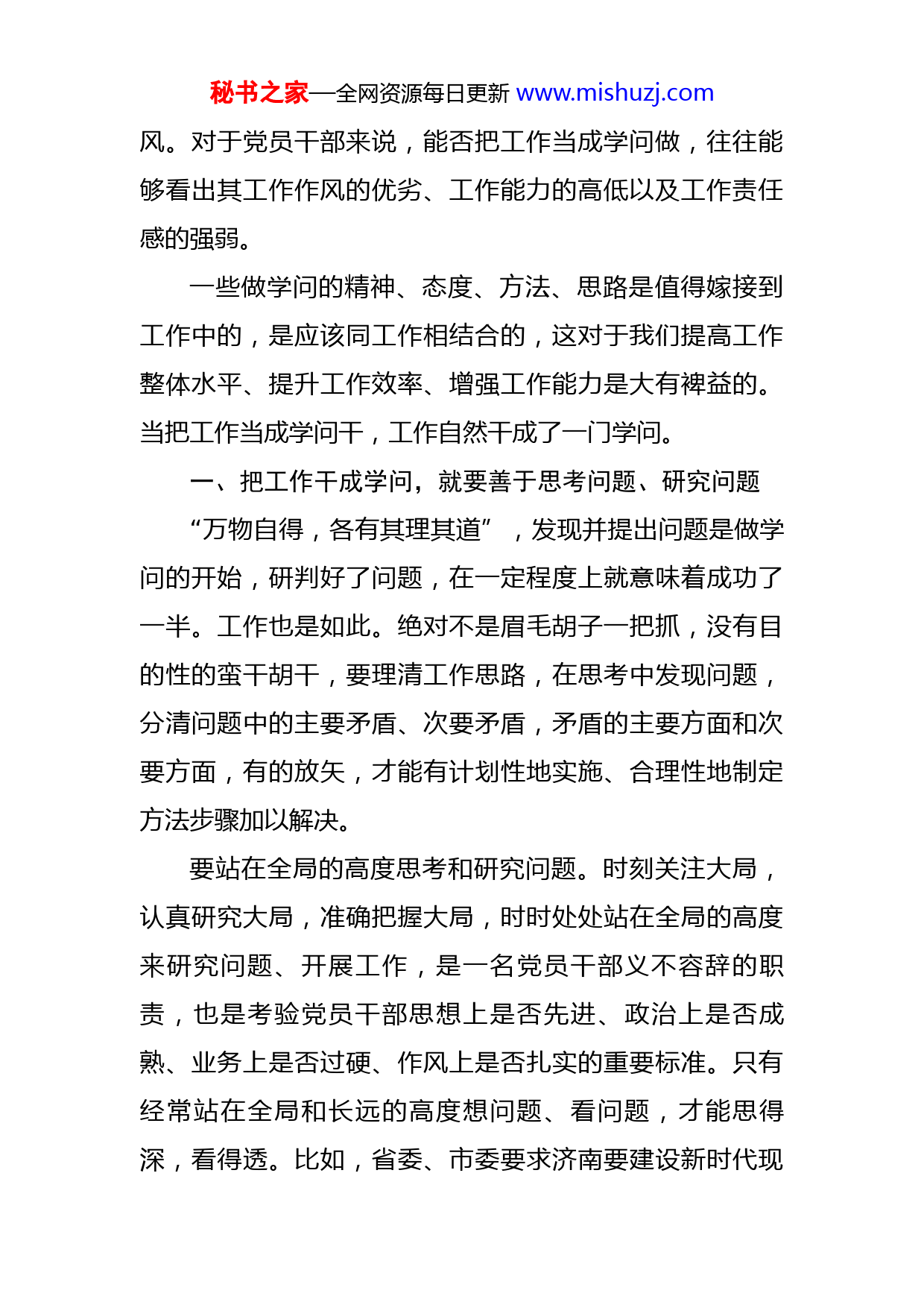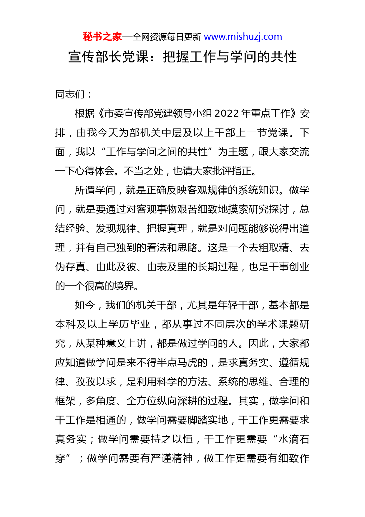 秘书之家—全网资源每日更新www.mishuzj.com宣传部长党课:把握工作与学问的共性同志们:根据《市委宣传部党建领导小组2022年重点工作》安排,由我今天为部机关中层及以上干部上一节党课。下面,我以“工作与学问之间的共性”为主题,跟大家交流一下心得体会。不当之处,也请大家批评指正。所谓学问,就是正确反映客观规律的系统知识。做学问,就是要通过对客观事物艰苦细致地摸索研究探讨,总结经验、发现规律、把握真理,就是对问题能够说得出道理,并有自己独到的看法和思路。这是一个去粗取精、去伪存真、由此及彼、由表及里的长期过程,也是干事创业的一个很高的境界。如今,我们的机关干部,尤其是年轻干部,基本都是本科及以上学历毕业,都从事过不同层次的学术课题研究,从某种意义上讲,都是做过学问的人。因此,大家都应知道做学问是来不得半点马虎的,是求真务实、遵循规律、孜孜以求,是利用科学的方法、系统的思维、合理的框架,多角度、全方位纵向深耕的过程。其实,做学问和干工作是相通的,做学问需要脚踏实地,干工作更需要求真务实;做学问需要持之以恒,干工作更需要“水滴石穿”;做学问需要有严谨精神,做工作更需要有细致作秘书之家—全网资源每日更新www.mishuzj.com风。对于党员干部来说,能否把工作当成学问做,往往能够看出其工作作风的优劣、工作能力的高低以及工作责任感的强弱。一些做学问的精神、态度、方法、思路是值得嫁接到工作中的,是应该同工作相结合的,这对于我们提高工作整体水平、提升工作效率、增强工作能力是大有裨益的。当把工作当成学问干,工作自然干成了一门学问。一、把工作干成学问,就要善于思考问题、研究问题“万物自得,各有其理其道”,发现并提出问题是做学问的开始,研判好了问题,在一定程度上就意味着成功了一半。工作也是如此。绝对不是眉毛胡子一把抓,没有目的性的蛮干胡干,要理清工作思路,在思考中发现问题,分清问题中的主要矛盾、次要矛盾,矛盾的主要方面和次要方面,有的放矢,才能有计划性地实施、合理性地制定方法步骤加以解决。要站在全局的高度思考和研究问题。时刻关注大局,认真研究大局,准确把握大局,时时处处站在全局的高度来研究问题、开展工作,是一名党员干部义不容辞的职责,也是考验党员干部思想上是否先进、政治上是否成熟、业务上是否过硬、作风上是否扎实的重要标准。只有经常站在全局和长远的高度想问题、看问题,才能思得深,看得透。比如,省委、市委要求济南要建设新时代现秘书之家—全网资源每日更新www.mishuzj.com代化强省会。我们必须首先明白强省会首要的、最为关键的,就是综合实力要强。综合实力强,不仅仅是硬实力要强还有软实力要强。从这个问题出发,市第十二次党代会明确提出,把提升城市软实力与文明城市创建有机结合起来,积极争创全国文明典范城市。遵循这个思路,我们提出以全国文明典范城市为统领,找准“十个力”,全面推进“十大之城”建设,逐步形成了提升城市软实力从1.0到5.0的推进路径。要抓住热点、重点、难点思考和研究问题。热点问题是时代的反映,难点问题是深层次的矛盾,重点问题是重要的、需要急切解决的问题,只有真正抓住制约工作全局的热点、重点、难点问题,才能使各种矛盾问题得到妥善解决,更有效地推进工作。比如,稳住经济大盘,是当前党委政府工作的重中之重,是对各级各部门政治担当、意志毅力、作风品质的重大考验。我们积极思考如何发挥宣传思想工作优势服务高质量发展,创新推出济南市双招双引“一键响应”云平台,精心策划一月一主题重大主题宣传,推出了一系列有高度、有深度、有分量、有影响的宣传报道,充分展示了“济南活力”“济南魅力”“济南机遇”,有力的服务了中心大局。要结合实际工作思考和研究问题。干工作的过程本身就是一个不断地发现问题并解决问题的过程,既要紧密结合工作实际来研究问题,又要善于在解决实际问题的过程中不断总秘书之家—全网资源每日更新www.mishuzj.com结、发现规律性的东西,这是一个贯穿于调查研究、掌握情况、分析问题、提出方案、作出决策、抓好落实、总结提升的闭环过程,是对干部素质的一项基本要求。只有做到这样,才能保证高质量完成工作任务。二、把工作干成学问,就要追求严谨细致、精益求精于细微之处见功夫、精密之处见水平。做学问绝不能马马虎虎,敷衍了事,须从小处着眼,在细微处较真,要有“鸡蛋里面挑骨头”的精神。如果把这种精神投入到工作的每一个环节和细节之中,就能把工作做到位,工作的质量也必然是高的。最近,有两个事件引起了网民的广泛热议,分别是大学的错别字事件。看似很简单的失误,其背后揭示出来的是工作态度的问题,是对待工作是否细致的问题。一个小数点的偏差会造成整个实验的失败,一条指令的错误会导致整个编程的“error”,“一字之失,一句之蹉跎;一句之误,通篇之梗塞”,科研如此,文章如此,工作更是如此。一处细节把握不到,可能引发连锁反应,导致满盘皆输,针尖大的窟窿也可能露出斗大的风。比如,我们创建文明典范城市工作,有实力参与竞争的城市,都是已经通过全国文明城市创建检验的佼佼者,在基础设施建设等城市硬件方面已无太大差距,测评成绩分