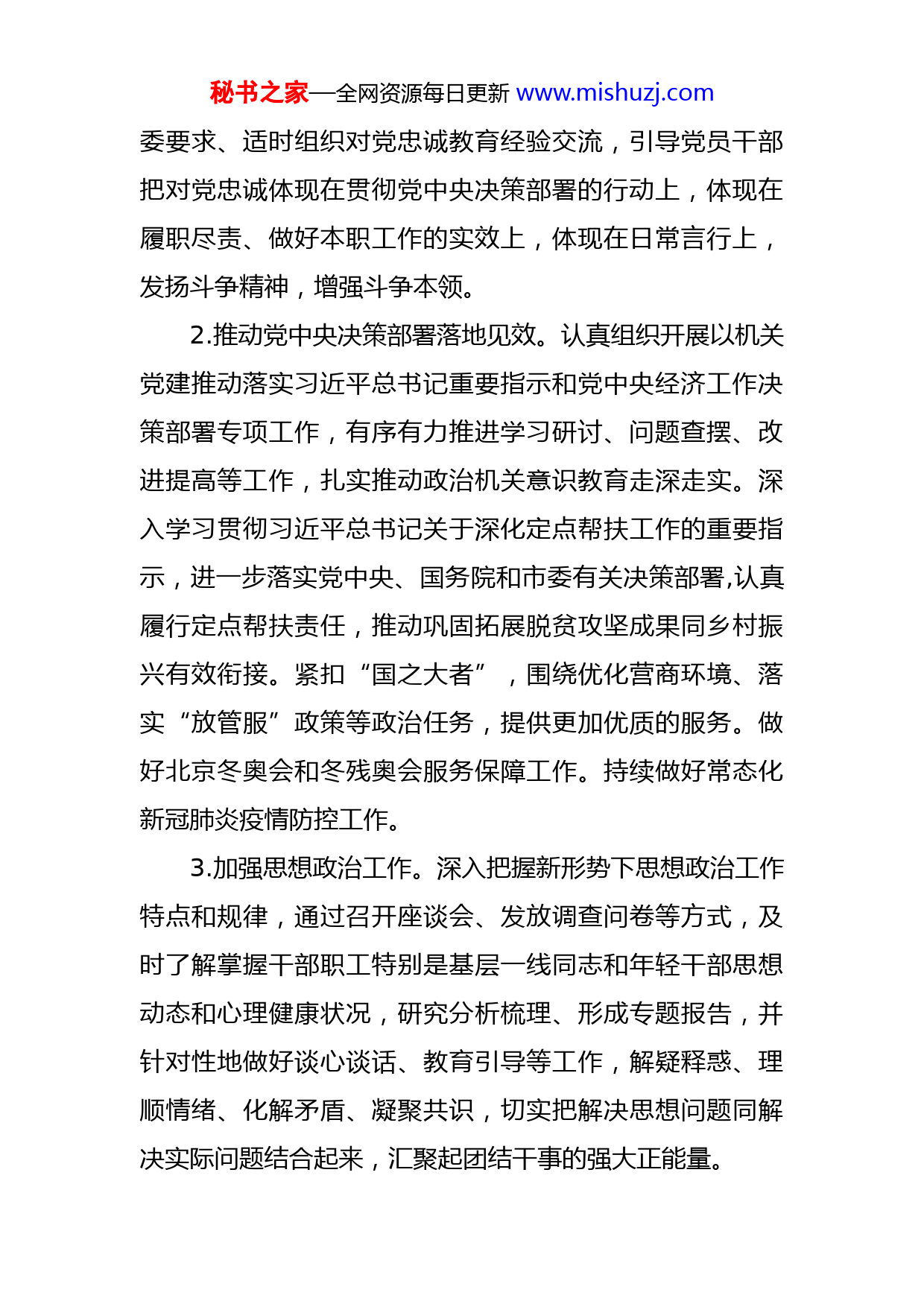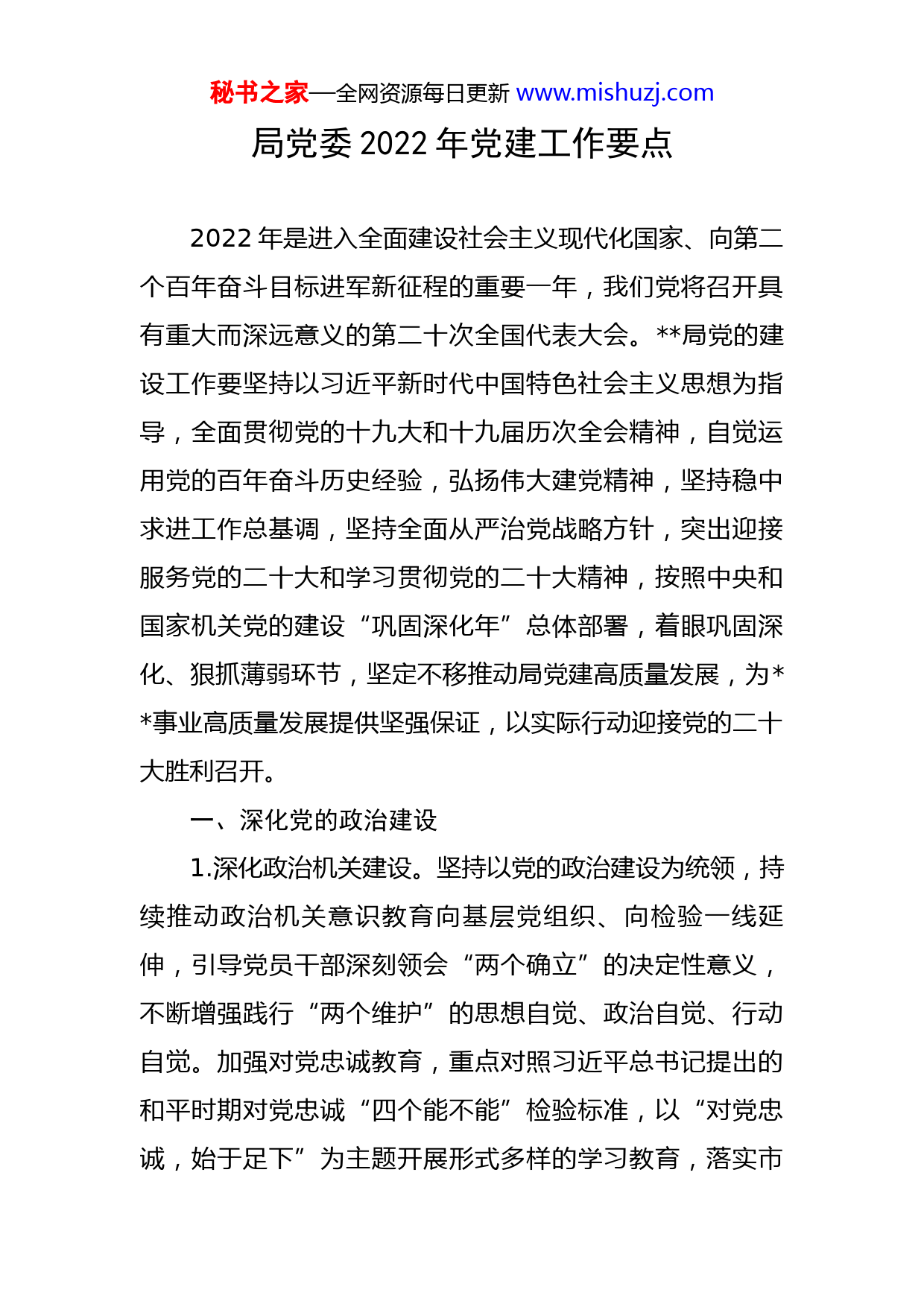 秘书之家—全网资源每日更新www.mishuzj.com局党委2022年党建工作要点2022年是进入全面建设社会主义现代化国家、向第二个百年奋斗目标进军新征程的重要一年,我们党将召开具有重大而深远意义的第二十次全国代表大会。局党的建设工作要坚持以习近平新时代中国特色社会主义思想为指导,全面贯彻党的十九大和十九届历次全会精神,自觉运用党的百年奋斗历史经验,弘扬伟大建党精神,坚持稳中求进工作总基调,坚持全面从严治党战略方针,突出迎接服务党的二十大和学习贯彻党的二十大精神,按照中央和国家机关党的建设“巩固深化年”总体部署,着眼巩固深化、狠抓薄弱环节,坚定不移推动局党建高质量发展,为事业高质量发展提供坚强保证,以实际行动迎接党的二十大胜利召开。一、深化党的政治建设1.深化政治机关建设。坚持以党的政治建设为统领,持续推动政治机关意识教育向基层党组织、向检验一线延伸,引导党员干部深刻领会“两个确立”的决定性意义,不断增强践行“两个维护”的思想自觉、政治自觉、行动自觉。加强对党忠诚教育,重点对照习近平总书记提出的和平时期对党忠诚“四个能不能”检验标准,以“对党忠诚,始于足下”为主题开展形式多样的学习教育,落实市秘书之家—全网资源每日更新www.mishuzj.com委要求、适时组织对党忠诚教育经验交流,引导党员干部把对党忠诚体现在贯彻党中央决策部署的行动上,体现在履职尽责、做好本职工作的实效上,体现在日常言行上,发扬斗争精神,增强斗争本领。2.推动党中央决策部署落地见效。认真组织开展以机关党建推动落实习近平总书记重要指示和党中央经济工作决策部署专项工作,有序有力推进学习研讨、问题查摆、改进提高等工作,扎实推动政治机关意识教育走深走实。深入学习贯彻习近平总书记关于深化定点帮扶工作的重要指示,进一步落实党中央、国务院和市委有关决策部署,认真履行定点帮扶责任,推动巩固拓展脱贫攻坚成果同乡村振兴有效衔接。紧扣“国之大者”,围绕优化营商环境、落实“放管服”政策等政治任务,提供更加优质的服务。做好北京冬奥会和冬残奥会服务保障工作。持续做好常态化新冠肺炎疫情防控工作。3.加强思想政治工作。深入把握新形势下思想政治工作特点和规律,通过召开座谈会、发放调查问卷等方式,及时了解掌握干部职工特别是基层一线同志和年轻干部思想动态和心理健康状况,研究分析梳理、形成专题报告,并针对性地做好谈心谈话、教育引导等工作,解疑释惑、理顺情绪、化解矛盾、凝聚共识,切实把解决思想问题同解决实际问题结合起来,汇聚起团结干事的强大正能量。秘书之家—全网资源每日更新www.mishuzj.com二、迎接服务党的二十大4.抓好宣传引导工作。围绕迎接和宣传党的二十大,加强正面宣传引导,引导党员干部深刻感受新时代党和国家事业取得的历史性成就、发生的历史性变革,用辉煌成就鼓舞人心、激发干劲。组织开展“喜迎二十大”主题宣传、主题教育、书画摄影征集展示等系列活动。开展向党的二十大代表和身边先进典型学习活动,引导广大党员干部鼓起奋进新征程、建功新时代的精气神,切实把智慧和力量凝聚到迎接服务党的二十大各项工作中。5.认真学习宣传贯彻党的二十大精神。党的二十大召开后,采取参加市委宣讲报告会、理论学习中心组学习、专题辅导讲座、专题培训等形式,迅速兴起学习贯彻党的二十大精神热潮。精心组织我局学习贯彻党的二十大精神有关工作,积极参加市委组织的集中轮训,切实把党员干部的思想和行动统一到党的二十大精神上来,统一到党的二十大确定的目标任务上来。抓好宣引导传和典型培树工作,多角度、全方位地反映我局学习贯彻党的二十大精神、推进事业高质量发展的生动实践,营造浓厚学习氛围。三、筑牢思想根基6.深化党的创新理论武装。把学习贯彻习近平新时代中国特色社会主义思想作为第一任务,进一步在学懂弄通做秘书之家—全网资源每日更新www.mishuzj.com实上下功夫。坚持读原著、学原文、悟原理,认真学习《习近平谈治国理政》第一、二、三、四卷等原著原文,用好习近平新时代中国特色社会主义思想有关辅导读本,重点学习习近平总书记关于市场监管工作的重要论述和重要指示批示精神,及时跟进学习习近平总书记关于统筹发展和安全、平安中国建设、实现高质量发展最新重要讲话精神。充分发挥党委理论学习中心组领学促学作用,制定党委理论学习中心组年度专题学习重点安排,深化学习列席旁听工作,党委委员带头交流学习经验。用好支部工作APP、OA系统、党建工作交流群等平台,推动学习交流。7.巩固拓展党史学习教育成果。认真贯彻落实关于推动党史学习教育常态化长效化的意见,以深入学习贯彻党的十九届六中全会精神为重点巩固党史学习教育成果,进一步做到学史明理、学史增信、学史崇德、学史力行,引导党员干部学党史、悟思想、办实事、开新局。把党史内容作为理论学习中心组、党支部“三会一课”、青年理论学习小组学习的重要内容,作为干部教育培训的必修课、常修课。建立常态化、长效化制度机制,持之以恒推进党史总结、学习、教育、宣传。用好红色资源,学习宣传以伟大建党精神为源头的中国共产党人精神谱系,推动党员