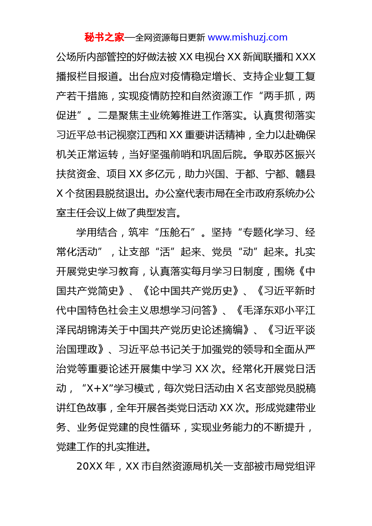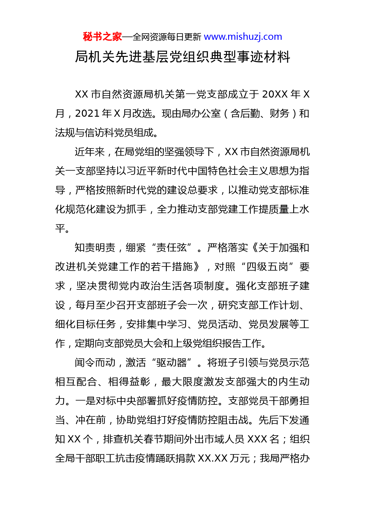秘书之家—全网资源每日更新www.mishuzj.com局机关先进基层党组织典型事迹材料XX市自然资源局机关第一党支部成立于20XX年X月,2021年X月改选。现由局办公室(含后勤、财务)和法规与信访科党员组成。近年来,在局党组的坚强领导下,XX市自然资源局机关一支部坚持以习近平新时代中国特色社会主义思想为指导,严格按照新时代党的建设总要求,以推动党支部标准化规范化建设为抓手,全力推动支部党建工作提质量上水平。知责明责,绷紧“责任弦”。严格落实《关于加强和改进机关党建工作的若干措施》,对照“四级五岗”要求,坚决贯彻党内政治生活各项制度。强化支部班子建设,每月至少召开支部班子会一次,研究支部工作计划、细化目标任务,安排集中学习、党员活动、党员发展等工作,定期向支部党员大会和上级党组织报告工作。闻令而动,激活“驱动器”。将班子引领与党员示范相互配合、相得益彰,最大限度激发支部强大的内生动力。一是对标中央部署抓好疫情防控。支部党员干部勇担当、冲在前,协助党组打好疫情防控阻击战。先后下发通知XX个,排查机关春节期间外出市域人员XXX名;组织全局干部职工抗击疫情踊跃捐款XX.XX万元;我局严格办秘书之家—全网资源每日更新www.mishuzj.com公场所内部管控的好做法被XX电视台XX新闻联播和XXX播报栏目报道。出台应对疫情稳定增长、支持企业复工复产若干措施,实现疫情防控和自然资源工作“两手抓,两促进”。二是聚焦主业统筹推进工作落实。认真贯彻落实习近平总书记视察江西和XX重要讲话精神,全力以赴确保机关正常运转,当好坚强前哨和巩固后院。争取苏区振兴扶贫资金、项目XX多亿元,助力兴国、于都、宁都、赣县X个贫困县脱贫退出。办公室代表市局在全市政府系统办公室主任会议上做了典型发言。学用结合,筑牢“压舱石”。坚持“专题化学习、经常化活动”,让支部“活”起来、党员“动”起来。扎实开展党史学习教育,认真落实每月学习日制度,围绕《中国共产党简史》、《论中国共产党历史》、《习近平新时代中国特色社会主义思想学习问答》、《毛泽东邓小平江泽民胡锦涛关于中国共产党历史论述摘编》、《习近平谈治国理政》、习近平总书记关于加强党的领导和全面从严治党等重要论述开展集中学习XX次。经常化开展党日活动,“X+X”学习模式,每次党日活动由X名支部党员脱稿讲红色故事,全年开展各类党日活动XX次。形成党建带业务、业务促党建的良性循环,实现业务能力的不断提升,党建工作的扎实推进。20XX年,XX市自然资源局机关一支部被市局党组评秘书之家—全网资源每日更新www.mishuzj.com为“先进党支部”,2021年被市直机关工委评为“先进基层党组织”。由支部相关科室牵头负责的工作中,XX市自然资源局被评为全省自然资源绩效管理工作优秀单位、全省自然资源系统平安建设(综治工作)先进单位、全市平安建设(综治工作)先进单位、全市服务开放型经济先进单位、全市党委系统信息工作先进单位、全市政务信息工作优秀单位、全市节能减排考核优秀单位等荣誉。XX市自然资源局微信被评为XX市政府系统“十佳政务微信”。