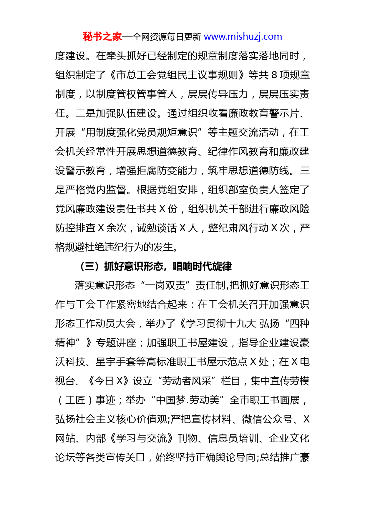 秘书之家—全网资源每日更新www.mishuzj.com个人三年工作总结近年来,在工会党组的正确领导和同志们的帮助支持下,以服务基层、服务群众为目标,崇尚实干、创新进取担当作为,干事创业,圆满完成了党组安排的工作任务。一、工作成果(一)提高政治站位,提升综合素养始终把学习作为提高素质、履职尽责、干好工作的第一需要。一是加强政治理论学习,提高政治站位。能够认真学习党的十九大精神和习近平总书记系列重要讲话精神积极参加“两学一做”“不忘初心、牢记使命”主题教育坚定理想信念,增强“四个自信”,树立正确三观,坚守共产党人精神追求,始终做到在思想上高度认同核心,在政治上坚决维护核心。二是加强法律法规学习,提高依法行政能力。结合工作的实际,加强业务知识学习,认真学习《工会法》、《中国工会章程》,积极参加各类业务培训,不断提升业务技能,为开展工作打下了坚实的理论基础。(二)增强政治定力,做到廉洁从政积极协助党组书记抓好工会机关和分管部室的党风廉政建设,把党风廉政建设纳入全年工作目标任务管理,推动党风廉政建设在工会落实落细、落到实处。一是加强制秘书之家—全网资源每日更新www.mishuzj.com度建设。在牵头抓好已经制定的规章制度落实落地同时,组织制定了《市总工会党组民主议事规则》等共8项规章制度,以制度管权管事管人,层层传导压力,层层压实责任。二是加强队伍建设。通过组织收看廉政教育警示片、开展“用制度强化党员规矩意识”等主题交流活动,在工会机关经常性开展思想道德教育、纪律作风教育和廉政建设警示教育,增强拒腐防变能力,筑牢思想道德防线。三是严格党内监督。根据党组安排,组织部室负责人签定了党风廉政建设责任书共X份,组织机关干部进行廉政风险防控排查X余次,诫勉谈话X人,整纪肃风行动X次,严格规避杜绝违纪行为的发生。(三)抓好意识形态,唱响时代旋律落实意识形态“一岗双责”责任制,把抓好意识形态工作与工会工作紧密地结合起来:在工会机关召开加强意识形态工作动员大会,举办了《学习贯彻十九大弘扬“四种精神”》专题讲座;加强职工书屋建设,指导企业建设豪沃科技、星宇手套等高标准职工书屋示范点X处;在X电视台、《今日X》设立“劳动者风采”栏目,集中宣传劳模(工匠)事迹;举办“中国梦.劳动美”全市职工书画展,弘扬社会主义核心价值观;严把宣传材料、微信公众号、X网站、内部《学习与交流》刊物、信息员培训、企业文化论坛等各类宣传关口,始终坚持正确舆论导向;总结推广豪秘书之家—全网资源每日更新www.mishuzj.com迈公司依靠职工办企业理念,举办企业文化论坛,指导全市X多家规模企业提炼出核心价值理念。(四)强化责任担当,提升工作实效根据党组工作分工,认真扎实做好工作:一是机关党建工作有了新变化。按照从严治党新要求,把抓好机关党建工作作为最大责任,落实“三会一课”、支部生活日制度,过好党员政治生日,党员学习教育不断深化;坚持党员社区服务、创城志愿服务制度化,多次组织机关党员干部到东小庄社区、北关社区开展志愿服务、协助交警维护交通秩序等;精心打造“惠工兴家”机关文化品牌,服务职工的工会“家”文化氛围逐渐形成;创新实践的党员政治生日“书记寄语”、党费收缴微信群、党建知识“小喇叭”每日播报已成为常态;探索实践“1+X”全员奉献积分制,引领全员职工干事创业,在棚户区拆迁改造、青岛峰会维稳、助力乡村振兴等市委、市政府确定的重大工作中党员发挥了模范带头作用。二是群众生产工作有了新起色。连续多年举办全市庆“五一”劳模座谈会,与会劳模围绕X经济社会发展建言献策,宣传了劳模事迹,弘扬了劳动精神。按照劳模影像志的统一安排,采取购买社会服务的方式,完成并及时上传全国劳模、省劳模、潍坊劳模共X人的事迹材料整理和照片拍摄工作。举办庆祝改革开放四十周年劳模事迹宣讲,劳模“五进”活动深入扎实。组织开秘书之家—全网资源每日更新www.mishuzj.com展劳模疗休养、劳模生活状况调查等,开展服务劳模活动更加精准。组织企业开展安全生产知识培训,消防活动演练,增强职工安全理念。立足职工需求,个性化开展“查保促”宣传活动,为企业送去了所需的劳动防护用品和宣传用品,有效提升了职工安全生产意识。所联系的镇街区委局工会工作实现新突破,按时完成换届任务,建立工会工作示范点X个。二、存在问题和不足总结一年来的工作,存在的问题和不足主要表现在:(一)精准服务职工不到位,离“娘家人”的要求有不小差距。用供给侧改革思维指导做好工会工作,为企业和职工提供精准服务,刚刚破题,离习近平总书记提出的“让职工群众真正感受到工会是职工之家,工会干部是最可信赖的娘家人”的要求,还有不小差距。(二)政策理论宣讲不到位。在开展习近平总书记关于工人阶级和工会工作的重要指示批示宣讲方面,只是对市总机关干部进行集中学习宣讲,推动十九大精神进企业进车间、进班组方面,还有不小的提升空间。用党的先进理论武装干部职工头脑,把党的意志和主张转化为广大职工的自觉行动方面,没有一抓到底,抓出成效。(三)“老好人”思想在一定程度存在。存有“好人主义”思想,只愿“栽花”、不愿“挑刺”,总觉得每个秘书之