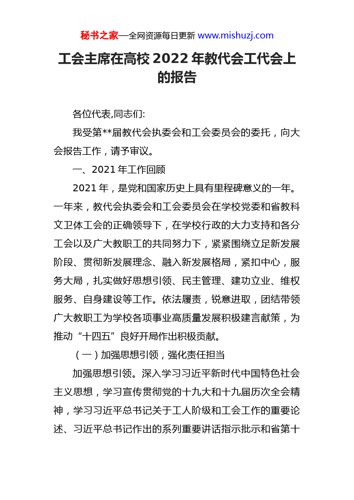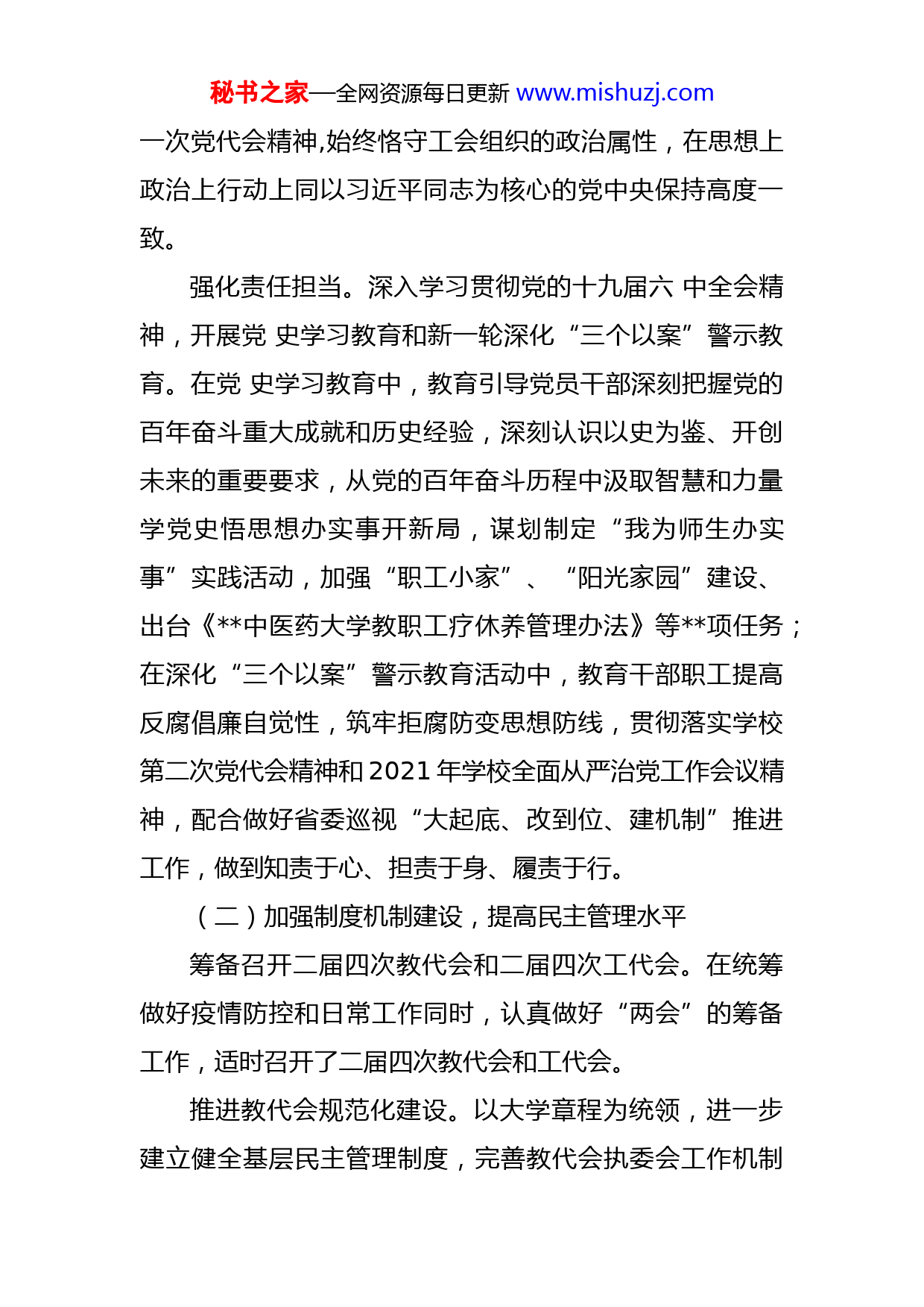 秘书之家—全网资源每日更新www.mishuzj.com工会主席在高校2022年教代会工代会上的报告各位代表,同志们:我受第届教代会执委会和工会委员会的委托,向大会报告工作,请予审议。一、2021年工作回顾2021年,是党和国家历史上具有里程碑意义的一年。一年来,教代会执委会和工会委员会在学校党委和省教科文卫体工会的正确领导下,在学校行政的大力支持和各分工会以及广大教职工的共同努力下,紧紧围绕立足新发展阶段、贯彻新发展理念、融入新发展格局,紧扣中心,服务大局,扎实做好思想引领、民主管理、建功立业、维权服务、自身建设等工作。依法履责,锐意进取,团结带领广大教职工为学校各项事业高质量发展积极建言献策,为推动“十四五”良好开局作出积极贡献。(一)加强思想引领,强化责任担当加强思想引领。深入学习习近平新时代中国特色社会主义思想,学习宣传贯彻党的十九大和十九届历次全会精神,学习习近平总书记关于工人阶级和工会工作的重要论述、习近平总书记作出的系列重要讲话指示批示和省第十秘书之家—全网资源每日更新www.mishuzj.com一次党代会精神,始终恪守工会组织的政治属性,在思想上政治上行动上同以习近平同志为核心的党中央保持高度一致。强化责任担当。深入学习贯彻党的十九届六中全会精神,开展党史学习教育和新一轮深化“三个以案”警示教育。在党史学习教育中,教育引导党员干部深刻把握党的百年奋斗重大成就和历史经验,深刻认识以史为鉴、开创未来的重要要求,从党的百年奋斗历程中汲取智慧和力量学党史悟思想办实事开新局,谋划制定“我为师生办实事”实践活动,加强“职工小家”、“阳光家园”建设、出台《中医药大学教职工疗休养管理办法》等项任务;在深化“三个以案”警示教育活动中,教育干部职工提高反腐倡廉自觉性,筑牢拒腐防变思想防线,贯彻落实学校第二次党代会精神和2021年学校全面从严治党工作会议精神,配合做好省委巡视“大起底、改到位、建机制”推进工作,做到知责于心、担责于身、履责于行。(二)加强制度机制建设,提高民主管理水平筹备召开二届四次教代会和二届四次工代会。在统筹做好疫情防控和日常工作同时,认真做好“两会”的筹备工作,适时召开了二届四次教代会和工代会。推进教代会规范化建设。以大学章程为统领,进一步建立健全基层民主管理制度,完善教代会执委会工作机制秘书之家—全网资源每日更新www.mishuzj.com先后制定了《中医药大学教代会执行委员会及专门委员会职责》、《中医药大学教职工劳动人事争议调解办法》,修订了《中医药大学教职工代表大会提案工作制度》等。做好提案办理工作。二届四次教代会共征集提案件,提案工作委员会依据提案工作制度,对提案进行审查分类立为提案件,立为建议件。在提交校长和分管校领导审核同意后,及时召开了提案交办会。年底前,开展提案办理情况督查督办。经统计,代表对提案办理满意率%,对建议办理满意率约%。发挥参政议政作用。教代会执委和工会干部积极参与学校民主决策和民主监督,不断提高参政议政能力。在参与民主决策过程中,能如实反映广大教职工的意见和诉求及时将学校决策信息传达到教职工中去。学校党委高度重视民主管理和民主监督工作,涉及教职工利益的重大决策和管理事项,如对第一临床医学院国家中医疫病防治基地建设选址、神研所和三附院合并事宜、学校“十四五”发展规划编制、领导班子综合考核、处级干部述职测评、干部推荐、人才招聘、学风教风考核、职称评审、项目评选年度党政工作要点任务落实情况检查和督办等工作,均提交教代会执委讨论和广泛参与,听取意见和建议。加强教师住房建设质量监督。教执委委员和教师住房秘书之家—全网资源每日更新www.mishuzj.com职工代表委员会代表不定期去施工场地,加强对建筑材料抽查、样板房设计、内装材料选用、工程施工等方面质量监督,发现问题,提出整改意见,先后提出个整改问题,收集整理教职工对样板房设计和装饰材料条建议,及时反馈给施工单位,要求整改并给予整改答复。在专题会议上,督促学校工地代表、监理单位、跟踪审计单位认真督查施工单位对问题整改落实。建立有效的协商机制。加强工会与职能部门间沟通与协商,畅通民主管理渠道,利用“互联网+”平台加线下交流议事渠道,保障教职工的知情权、参与权、表达权和监督权,维护教职工合法权益。(三)立足岗位作贡献,弘扬劳模劳动工匠精神开展“建功十四五、奋进新征程”主题竞赛活动。会同相关部门开展校内第十九届青年教师教学基本功竞赛,本届竞赛(所有赛程)共有青年教师名参赛。选拔推荐名优秀青年教师参加省第届青教赛,并取得优异成绩。针灸推拿学院王洁老师获得医科组一等奖,第一临床学院左强老师获得医科组(临床类)二等奖,其余组别均获三等奖,校工会获“优秀组织奖”。通过青教赛,。进一步提高了教育教学水平,引导广大教师尤其是青年教师提升自我水平、提高教学技能。弘扬劳模劳动工匠精神。积极推进名师工作室建设,秘书之家—全网资源每日更新www.mishuzj.com选树标兵和先进典型,广泛宣传师德标兵典型事迹,教育和引导广大教职工用劳动模范和先进工作者的奋斗精神和高尚品格鞭策自己,激发干事