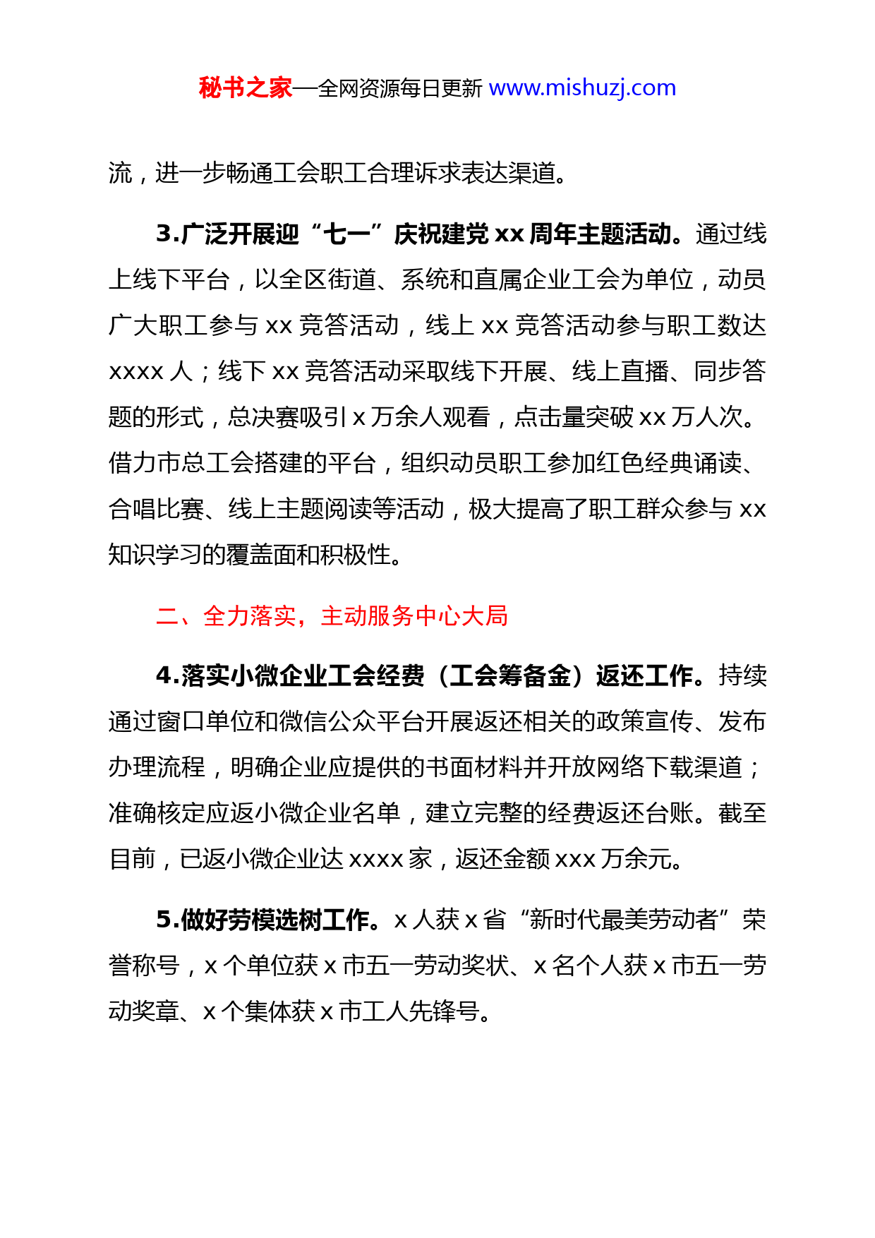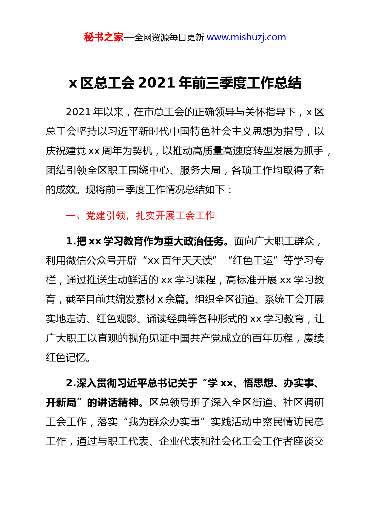 秘书之家—全网资源每日更新www.mishuzj.comx区总工会2021年前三季度工作总结2021年以来,在市总工会的正确领导与关怀指导下,x区总工会坚持以习近平新时代中国特色社会主义思想为指导,以庆祝建党xx周年为契机,以推动高质量高速度转型发展为抓手,团结引领全区职工围绕中心、服务大局,各项工作均取得了新的成效。现将前三季度工作情况总结如下:一、党建引领,扎实开展工会工作1.把xx学习教育作为重大政治任务。面向广大职工群众,利用微信公众号开辟“xx百年天天读”“红色工运”等学习专栏,通过推送生动鲜活的xx学习课程,高标准开展xx学习教育,截至目前共编发素材x余篇。组织全区街道、系统工会开展实地走访、红色观影、诵读经典等各种形式的xx学习教育,让广大职工以直观的视角见证中国共产党成立的百年历程,赓续红色记忆。2.深入贯彻习近平总书记关于“学xx、悟思想、办实事、开新局”的讲话精神。区总领导班子深入全区街道、社区调研工会工作,落实“我为群众办实事”实践活动中察民情访民意工作,通过与职工代表、企业代表和社会化工会工作者座谈交秘书之家—全网资源每日更新www.mishuzj.com流,进一步畅通工会职工合理诉求表达渠道。3.广泛开展迎“七一”庆祝建党xx周年主题活动。通过线上线下平台,以全区街道、系统和直属企业工会为单位,动员广大职工参与xx竞答活动,线上xx竞答活动参与职工数达xxxx人;线下xx竞答活动采取线下开展、线上直播、同步答题的形式,总决赛吸引x万余人观看,点击量突破xx万人次。借力市总工会搭建的平台,组织动员职工参加红色经典诵读、合唱比赛、线上主题阅读等活动,极大提高了职工群众参与xx知识学习的覆盖面和积极性。二、全力落实,主动服务中心大局4.落实小微企业工会经费(工会筹备金)返还工作。持续通过窗口单位和微信公众平台开展返还相关的政策宣传、发布办理流程,明确企业应提供的书面材料并开放网络下载渠道;准确核定应返小微企业名单,建立完整的经费返还台账。截至目前,已返小微企业达xxxx家,返还金额xxx万余元。5.做好劳模选树工作。x人获x省“新时代最美劳动者”荣誉称号,x个单位获x市五一劳动奖状、x名个人获x市五一劳动奖章、x个集体获x市工人先锋号。秘书之家—全网资源每日更新www.mishuzj.com6.多渠道再掀弘扬劳模精神的热潮。专题设置“劳模风采”线上宣传板块,宣扬事迹囊括国家、省、市、区级荣誉获得者,共编发劳模素材xx期,营造了“劳动最光荣、劳动最崇高、劳动最伟大、劳动最美丽”的正确价值导向。竭诚服务,维护职工合法权益7.把“我为群众办实事”落实到联系群众中。开展2021年“春风行动”专场招聘会,提供就业岗位xxxx余个,有效缓解企业“招工难”、求职者“就业难”的“两难问题”。面向全区一线岗位职工和重点项目建设工地职工,开展“情系一线职工促进六新发展”送清凉慰问活动,共发放总价逾xxx万元的防暑降温物品。做好全区职工福利保障,为辖区x家困难企业、x名困难职工及x名劳模,送去节日慰问品及共计xx万元的慰问金;按规为全区职工发放x万余人次的“逢年过节”(春节、端午、中秋)慰问品,合计金额xx万余元。继续开展第十六期职工大病医疗互助工程,截至目前共计受益xx人次,发放互助金xx万元。8.深入开展职工维权服务。继续在全区企事业单位的广大职工中深化“安康杯”竞赛活动,紧紧围绕“强意识,查隐患,促发展,保安康”的活动主题,达成参赛企业和参赛职工数同秘书之家—全网资源每日更新www.mishuzj.com比增长、参赛企业职工安全生产意识逐渐提高、安全生产形势稳定向好的活动实效。在“女职工维权行动月”期间,深入基层一线企业开展系列文化活动,通过以“自主体验+知识普及”的形式,充分增强了服务一线岗位女职工对法律的认知感、对党的认同感。联合相关部门在全区范围内深入开展职业健康“百日检查指导行动”,深入辖区煤矿、非煤矿山、水泥制造、涂料制造、危化品制造、石材加工等xx家企业开展工作,确保全区职业健康形势持续稳定向好。9.圆满完成“集体合同和工资集体协商月”活动。选聘x名工资集体协商专职指导员,沿用选树典型的方式带动x个街道积极开展协商工作,截止目前,我区综合集体合同覆盖企业数x家,覆盖职工xxx人;工资专项集体合同覆盖企业xx家,覆盖职工xxx人。三、夯基垒台,不断强化基层基础10.推进全区工会组建工作。持续开展工会组建和八大群体入会工作,持续加大中小微企业建会力度,截至目前新建工会组织x个(单独建会x个、联合建会x个),覆盖单位xx家,发展会员xxxx人;为已成立工会组织且仍缴纳工会筹备金的xxxx家企业批量办理工会经费变更手续。截至目前办理工会法秘书之家—全网资源每日更新www.mishuzj.com人资格证登记、变更共计xxx家。11.推进“智慧工会”平台建设。截止目前已录入基层工会组织xxxx个,实名制会员xxxxx人。12.推进“爱心驿站”全域建设。立足广大劳动者,通过辖区化建设、公共区域覆盖、U站资源整合等手段,高质量推进“爱心驿站”特别是“户外劳动者爱心驿站”平台建设。截至目前,全区已建成站点xx个,其中省政府级x个、省总工会级x个、市总工会级x个、共建爱心驿站x个。13.推进“新时代职工之家”建设。按照市总“新时代职工之家