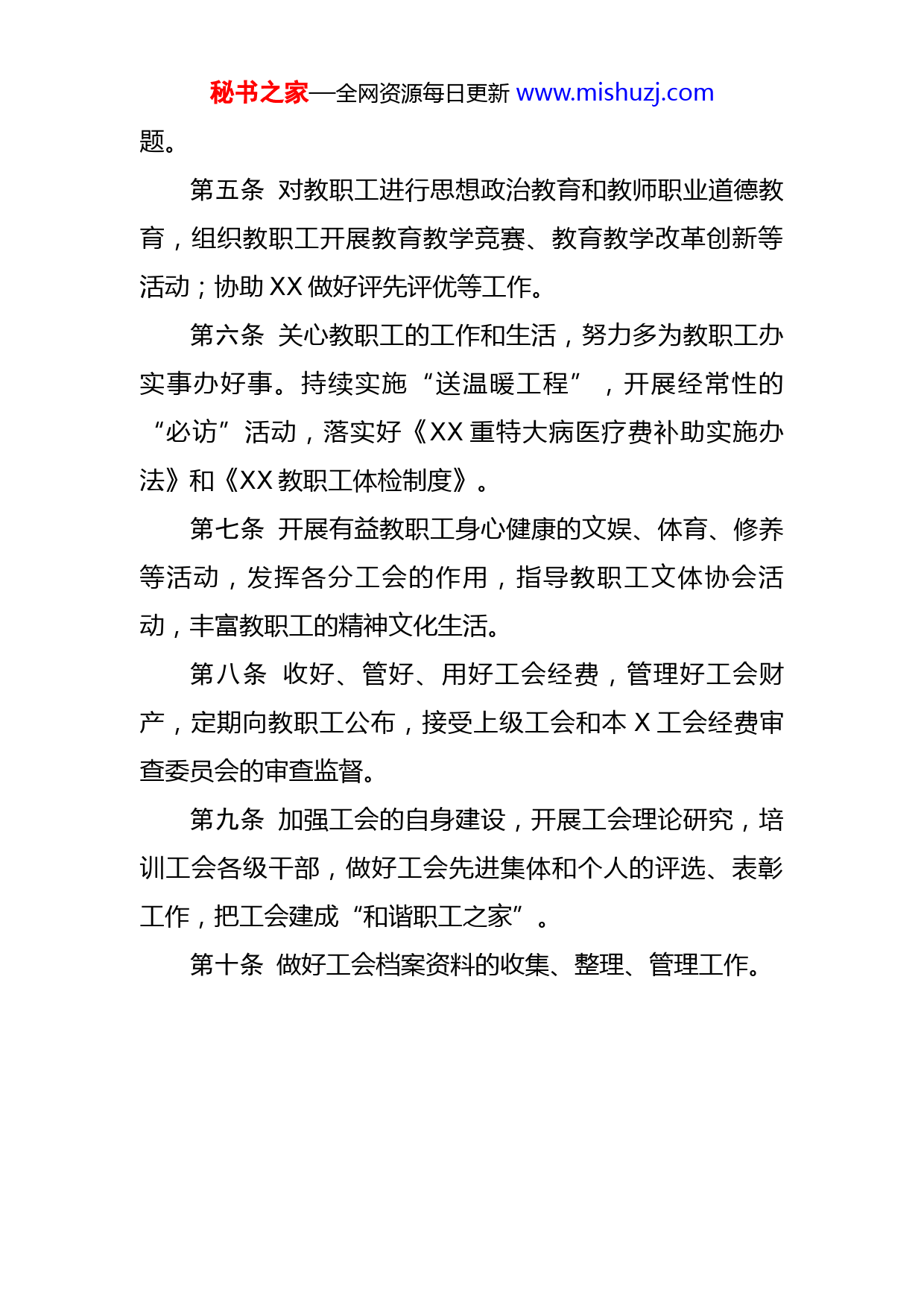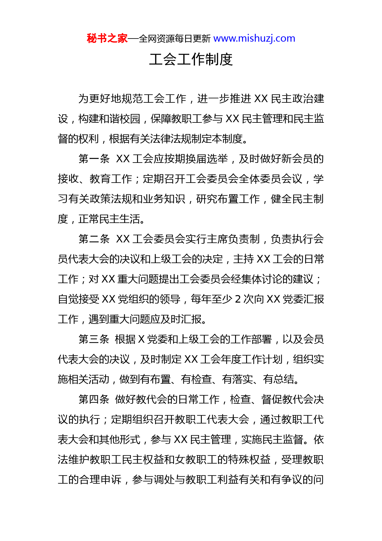 秘书之家—全网资源每日更新www.mishuzj.com工会工作制度为更好地规范工会工作,进一步推进XX民主政治建设,构建和谐校园,保障教职工参与XX民主管理和民主监督的权利,根据有关法律法规制定本制度。第一条XX工会应按期换届选举,及时做好新会员的接收、教育工作;定期召开工会委员会全体委员会议,学习有关政策法规和业务知识,研究布置工作,健全民主制度,正常民主生活。第二条XX工会委员会实行主席负责制,负责执行会员代表大会的决议和上级工会的决定,主持XX工会的日常工作;对XX重大问题提出工会委员会经集体讨论的建议;自觉接受XX党组织的领导,每年至少2次向XX党委汇报工作,遇到重大问题应及时汇报。第三条根据X党委和上级工会的工作部署,以及会员代表大会的决议,及时制定XX工会年度工作计划,组织实施相关活动,做到有布置、有检查、有落实、有总结。第四条做好教代会的日常工作,检查、督促教代会决议的执行;定期组织召开教职工代表大会,通过教职工代表大会和其他形式,参与XX民主管理,实施民主监督。依法维护教职工民主权益和女教职工的特殊权益,受理教职工的合理申诉,参与调处与教职工利益有关和有争议的问秘书之家—全网资源每日更新www.mishuzj.com题。第五条对教职工进行思想政治教育和教师职业道德教育,组织教职工开展教育教学竞赛、教育教学改革创新等活动;协助XX做好评先评优等工作。第六条关心教职工的工作和生活,努力多为教职工办实事办好事。持续实施“送温暖工程”,开展经常性的“必访”活动,落实好《XX重特大病医疗费补助实施办法》和《XX教职工体检制度》。第七条开展有益教职工身心健康的文娱、体育、修养等活动,发挥各分工会的作用,指导教职工文体协会活动,丰富教职工的精神文化生活。第八条收好、管好、用好工会经费,管理好工会财产,定期向教职工公布,接受上级工会和本X工会经费审查委员会的审查监督。第九条加强工会的自身建设,开展工会理论研究,培训工会各级干部,做好工会先进集体和个人的评选、表彰工作,把工会建成“和谐职工之家”。第十条做好工会档案资料的收集、整理、管理工作。