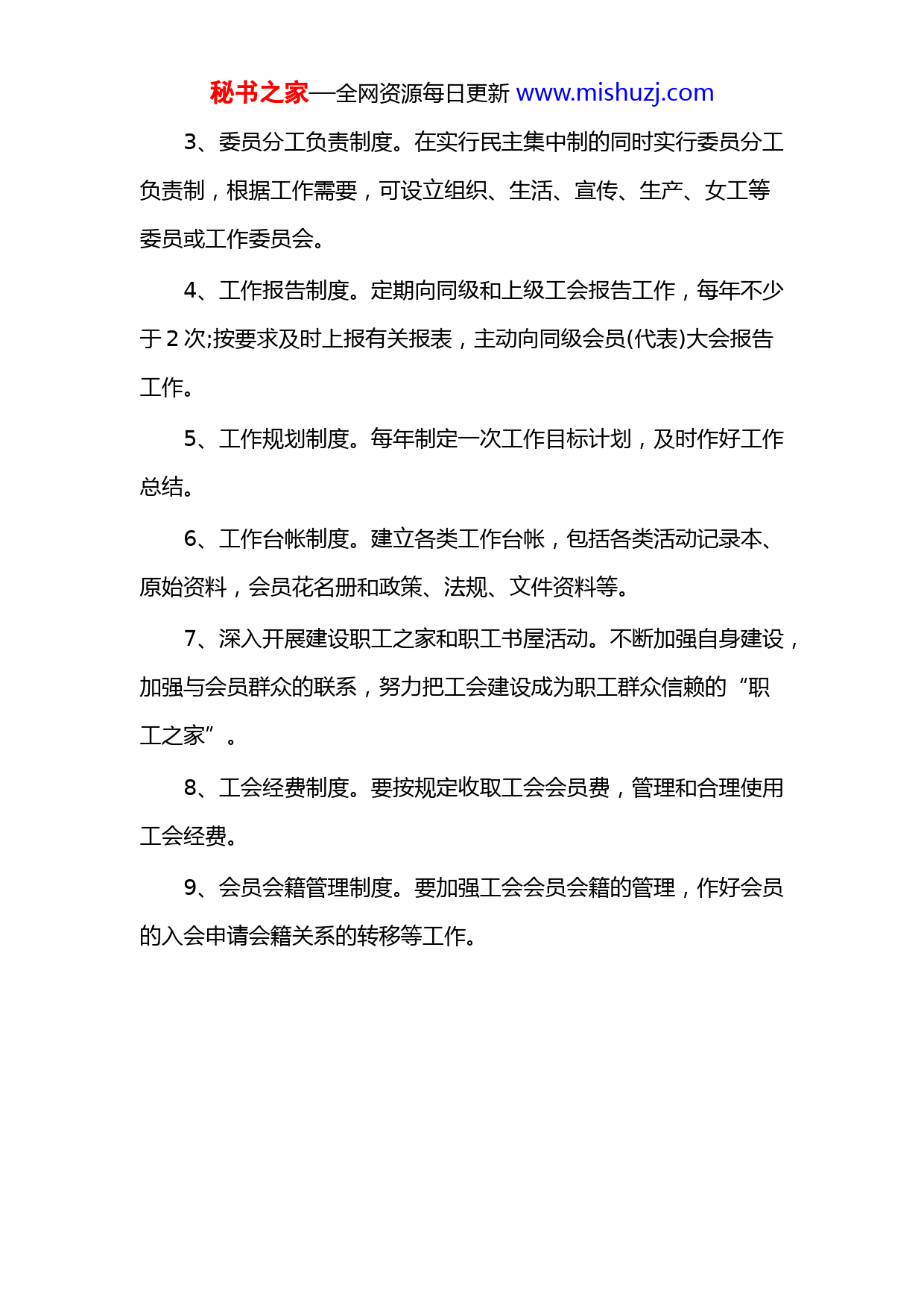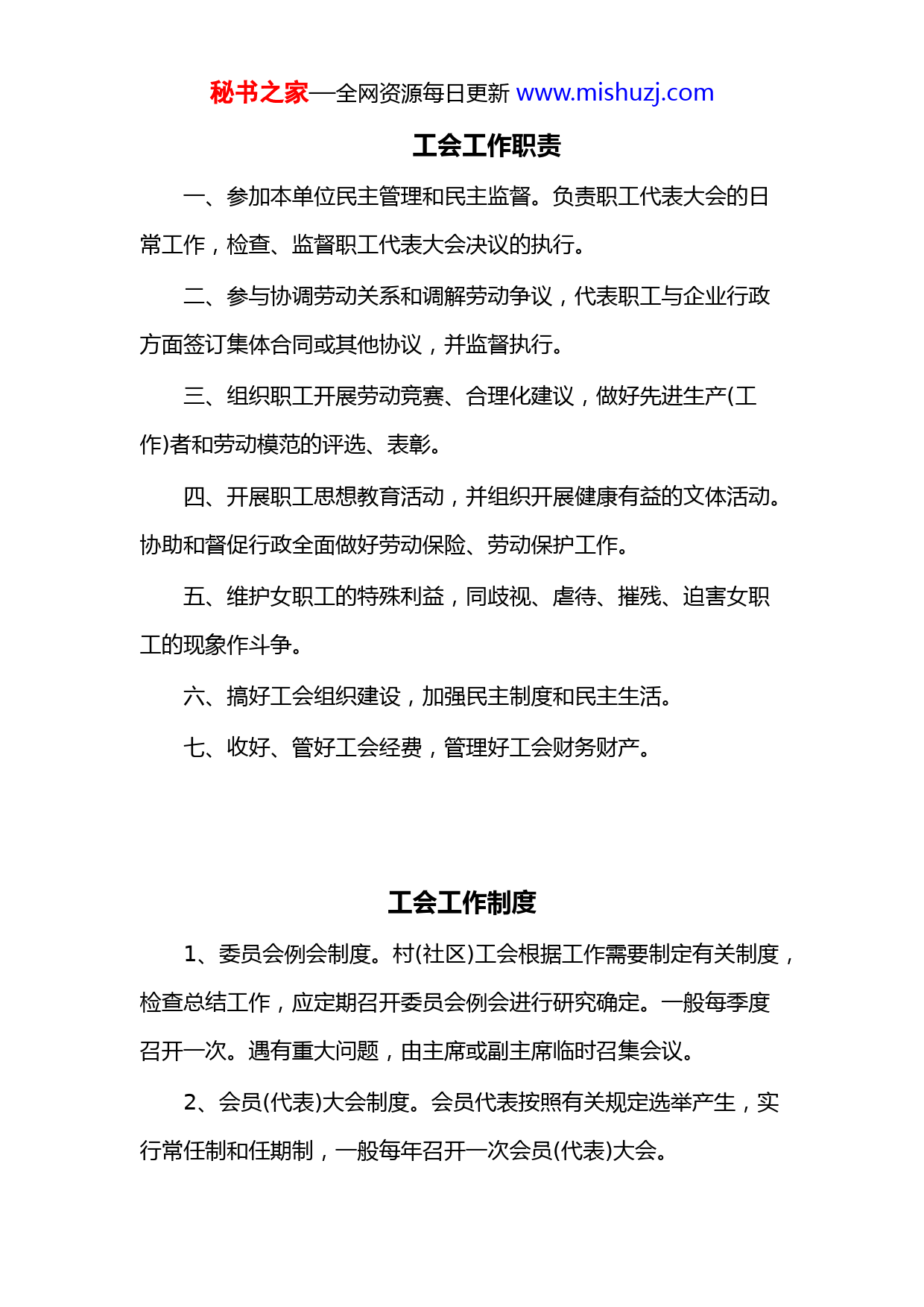 秘书之家—全网资源每日更新www.mishuzj.com工会工作职责一、参加本单位民主管理和民主监督。负责职工代表大会的日常工作,检查、监督职工代表大会决议的执行。二、参与协调劳动关系和调解劳动争议,代表职工与企业行政方面签订集体合同或其他协议,并监督执行。三、组织职工开展劳动竞赛、合理化建议,做好先进生产(工作)者和劳动模范的评选、表彰。四、开展职工思想教育活动,并组织开展健康有益的文体活动。协助和督促行政全面做好劳动保险、劳动保护工作。五、维护女职工的特殊利益,同歧视、虐待、摧残、迫害女职工的现象作斗争。六、搞好工会组织建设,加强民主制度和民主生活。七、收好、管好工会经费,管理好工会财务财产。工会工作制度1、委员会例会制度。村(社区)工会根据工作需要制定有关制度,检查总结工作,应定期召开委员会例会进行研究确定。一般每季度召开一次。遇有重大问题,由主席或副主席临时召集会议。2、会员(代表)大会制度。会员代表按照有关规定选举产生,实行常任制和任期制,一般每年召开一次会员(代表)大会。秘书之家—全网资源每日更新www.mishuzj.com3、委员分工负责制度。在实行民主集中制的同时实行委员分工负责制,根据工作需要,可设立组织、生活、宣传、生产、女工等委员或工作委员会。4、工作报告制度。定期向同级和上级工会报告工作,每年不少于2次;按要求及时上报有关报表,主动向同级会员(代表)大会报告工作。5、工作规划制度。每年制定一次工作目标计划,及时作好工作总结。6、工作台帐制度。建立各类工作台帐,包括各类活动记录本、原始资料,会员花名册和政策、法规、文件资料等。7、深入开展建设职工之家和职工书屋活动。不断加强自身建设,加强与会员群众的联系,努力把工会建设成为职工群众信赖的“职工之家”。8、工会经费制度。要按规定收取工会会员费,管理和合理使用工会经费。9、会员会籍管理制度。要加强工会会员会籍的管理,作好会员的入会申请会籍关系的转移等工作。秘书之家—全网资源每日更新www.mishuzj.com工程公司2022年工会工作要点一、总体思路以新时代中国特色社会主义思想为指导,贯彻集团公司决策部署,落实公司职代会会议精神,在公司党委领导下,始终坚持工会工作全面融入党委中心任务,与公司生产经营、改革发展深度相融相嵌,持续深化思想引领、素质提升、惠民安心、和谐劳动、自身建设“五大工程”,突出群众工作优势,突出大抓基层的鲜明导向,团结带领广大员工凝心、聚力、铸魂,汇聚高质量发展新动能,在公司典范企业建设和创建国际一流进程中贡献力量。二、工作目标1.思想引领工程。提高政治站位,将工会工作全面融合融入党委中心任务,做好组织群众、宣传群众、教育群众、引领群众工作,做到党委有号召,工会有行动,党委有要求,工会有落实。2.素质提升工程。把握“发展就是最大民生”的正确方向,深入开展主题劳动竞赛、练兵比武和革新创造,活动紧扣高质量发展主题,搭建形式多样的群众性经济技术活动平台,调动激发员工参与提速增效,提质增效的积极性。3.惠民安心工程。秉持“以员工为中心”的发展理念,以惠民安心工程为主线,健全服务体系,拓展服务领域,提高服务质量,推进“我为员工群众办实事”实践活动走深走实,凝聚发展力量,提升员工的获得感、幸福感和归属感。秘书之家—全网资源每日更新www.mishuzj.com4.和谐劳动工程。健全以职工代表大会为主要形式的民主管理机制,规范厂务公开,强化源头参与,促进基层管理更加科学民主,调动广大员工积极性,规范落实职工代表提案,汇聚民智民慧,提升管理水平。5.自身建设工程。坚持“群众路线就是党的生命线”基本路线,发挥工会组织桥梁纽带作用,健全各级工会组织,切实转变队伍作风,加强职工之家建设,树立工会组织和工会干部的良好形象。三、工作内容(一)持续深化“思想引领工程”,汇聚发展合力。1.坚持党对群团工作的领导。保持高度的政治意识和政治站位,团结带领广大员工听党话、跟党走。组织广大员工系统深入学习十九届六中全会精神以及习近平总书记关于石油精神、大庆精神、铁人精神的系列重要指示批示精神,进行全员线上线下知识竞赛。2.加强形势任务主题教育。组织工会干部深入学习领悟党委重要工作部署和公司职代会报告精神,认清形势任务,明确发展目标,广泛深入宣贯,层层传递压力,激发员工斗志,汇聚发展合力。3.出台《工程公司荣誉表彰管理办法》。根据《集团公司荣誉表彰管理办法》和《公司劳动模范管理办法》制定《工程公司荣誉表彰管理办法》。规范操作2022年度评先选优工作,加强对先进集体和劳模事迹的广泛深入宣传,弘扬劳模精神、厚植工匠文化,加强典型的示范引领。秘书之家—全网资源每日更新www.mishuzj.com(二)持续深化“素质提升工程”,助推企业发展。4.深化主题劳动竞赛。紧紧围绕公司战略目标和发展定位,结合集团公司“三年劳动竞赛方案”要求,健全劳动竞赛体系,完善考核办法,延展竞赛内容,增设“基层党建”和“国际业务”专项竞赛,构建全区域覆盖、全员性参与、全方位推进的竞赛格局,鼓舞队伍士气、提升员工素质、推动公司发展。5.深化操作练兵和技能比武。创新开展“菜单式”技能培训、